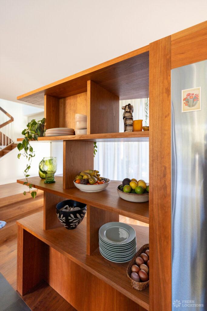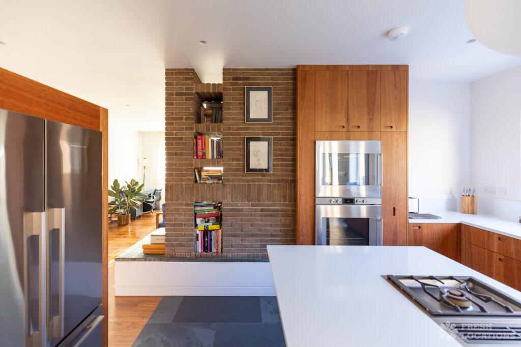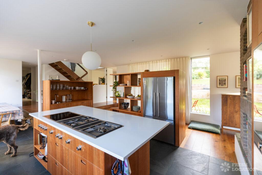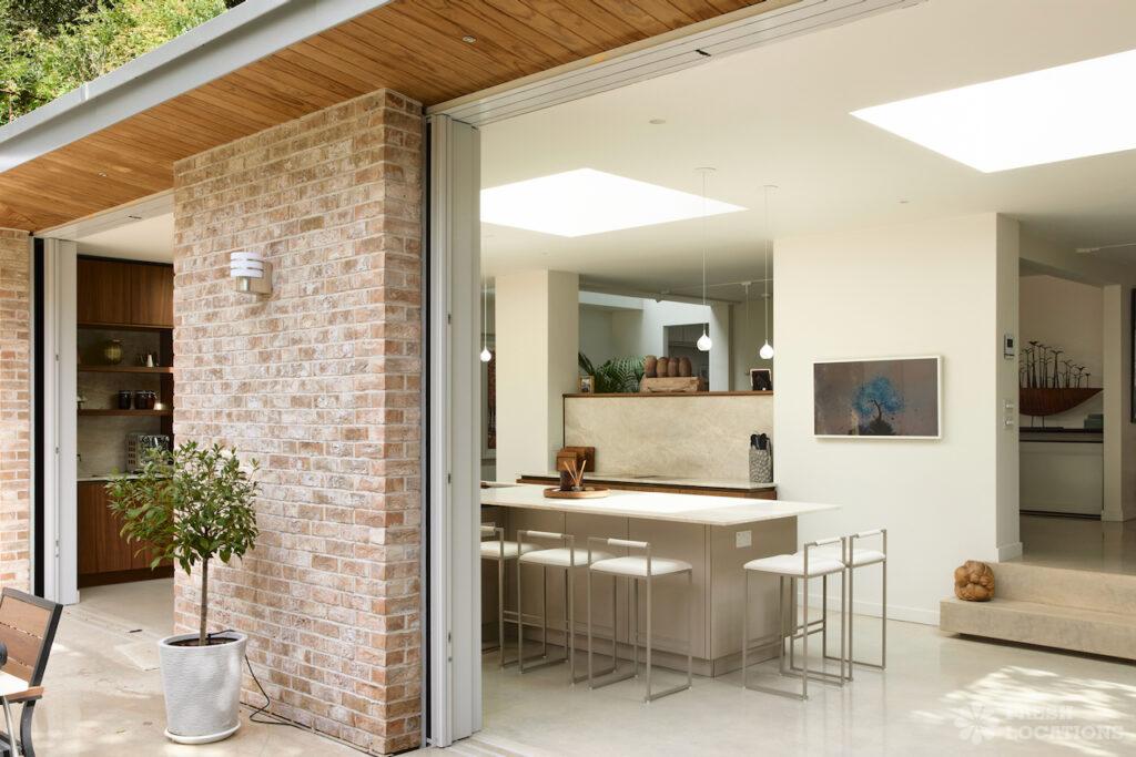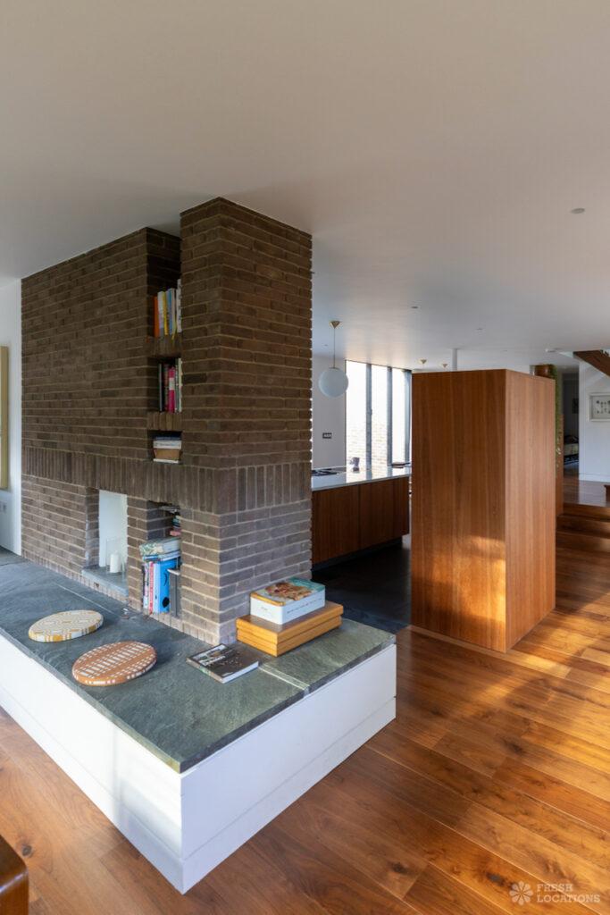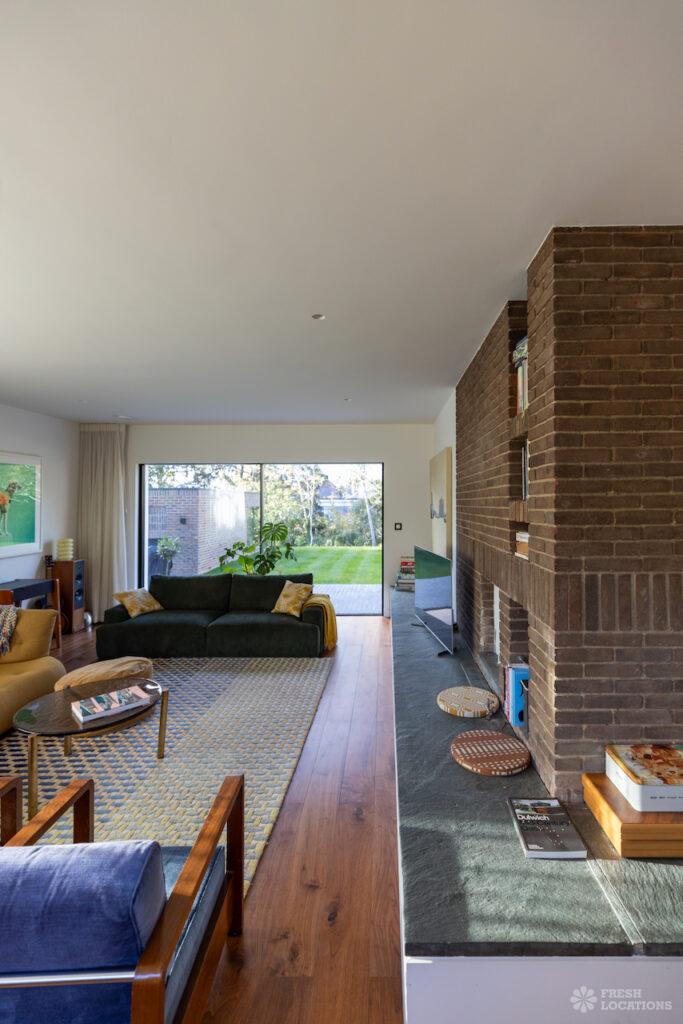 A charming 1930s house shoot location in North West London, featuring a spacious rear kitchen and living area with a vaulted roof and striking oak …