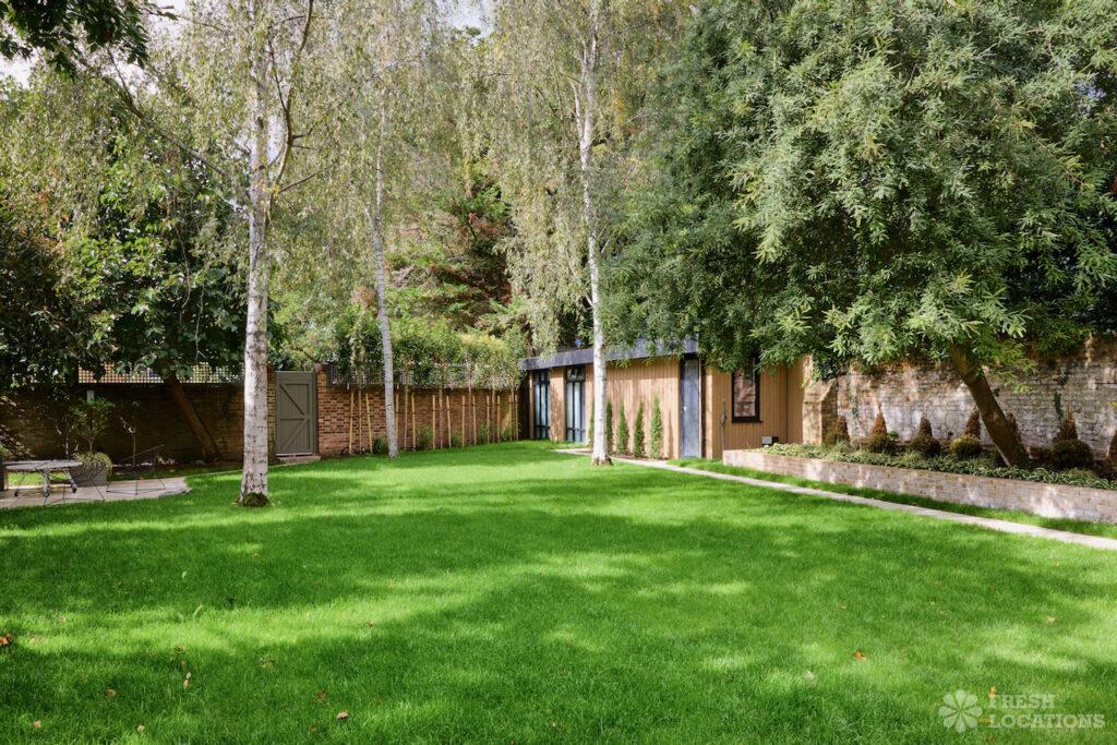 A luxury open-plan designer house shoot location featuring marble detailing and striking Crittall-style arched doors overlooking a beautifully kept garden. The interiors include a wood-clad …