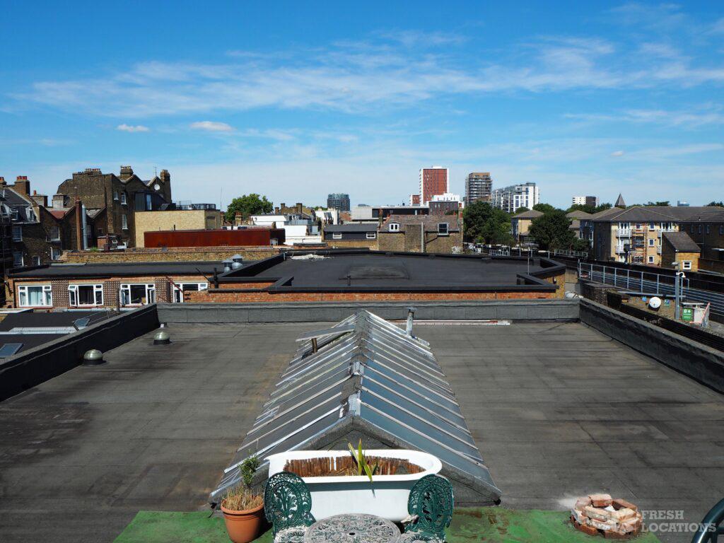 Colourful shoot location house in East London, with two bedrooms, spacious kitchen with dining area, a music studio and roof terrace with city views. London …