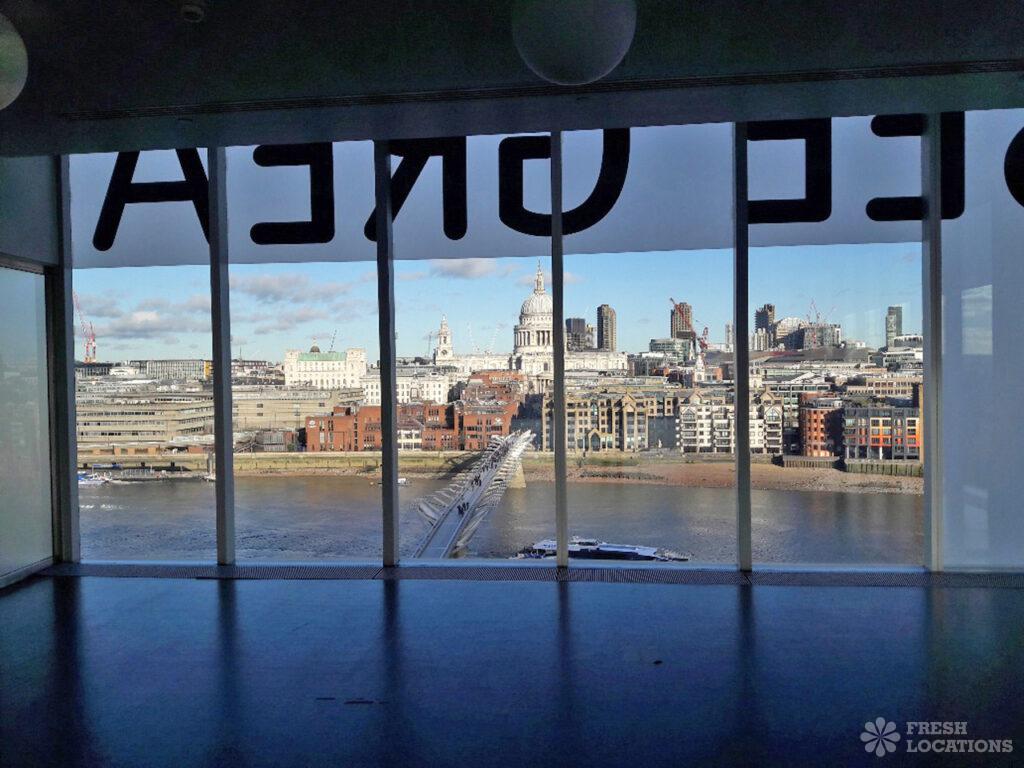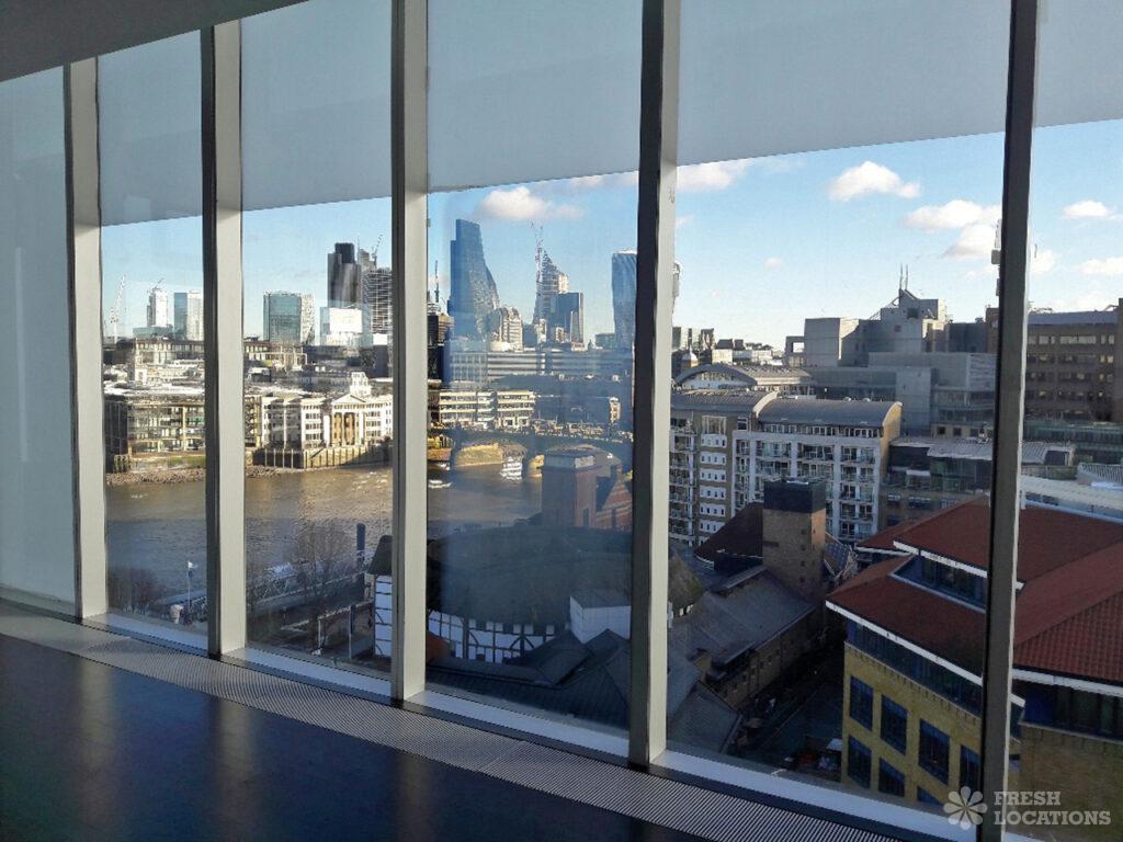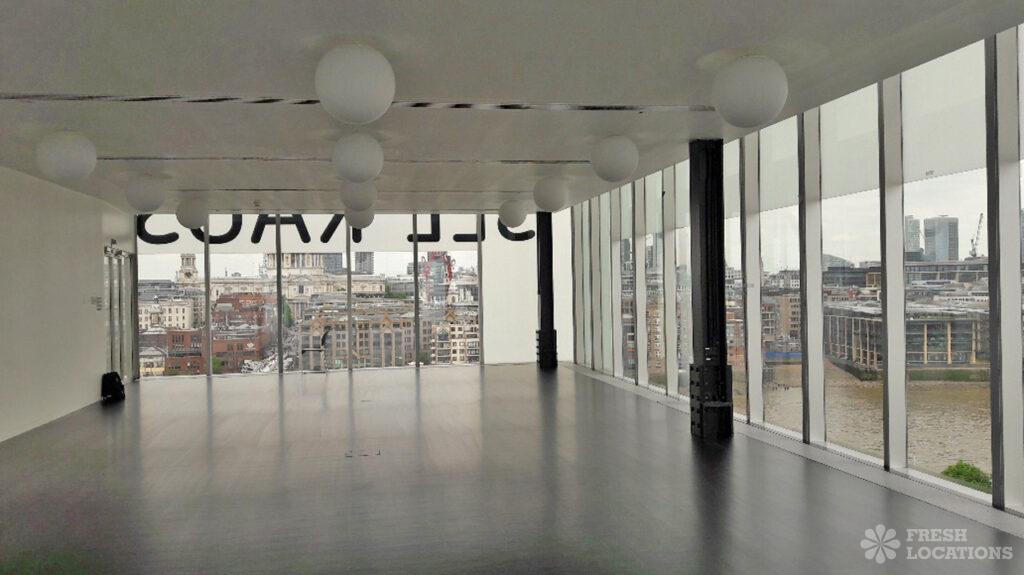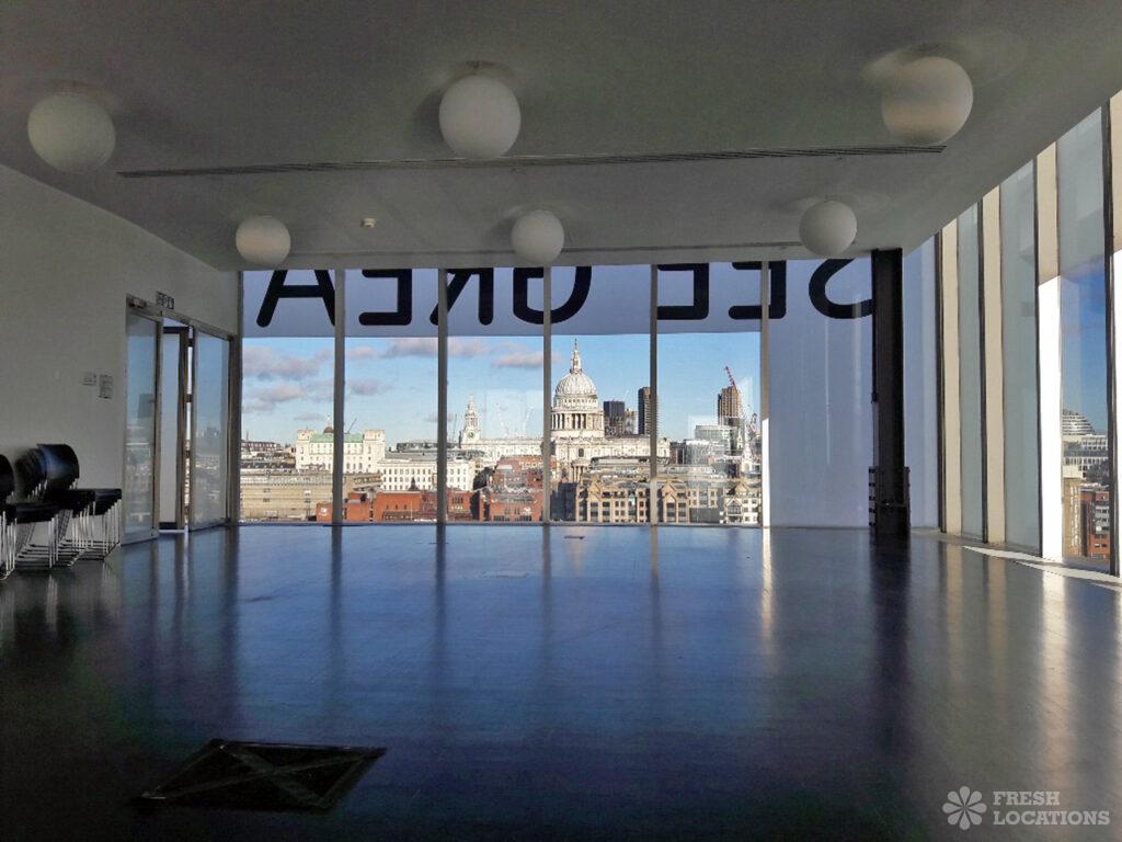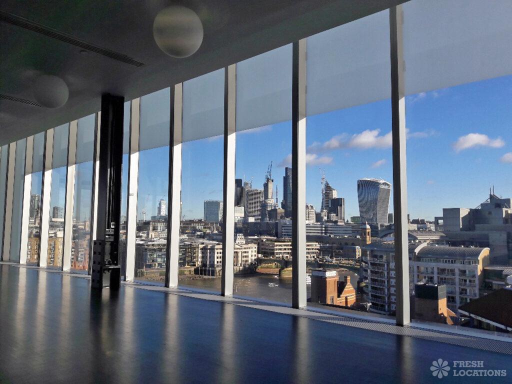 This contemporary gallery space offers views across the city’s skyline. Full height windows and dark floors. London Borough of Southwark.