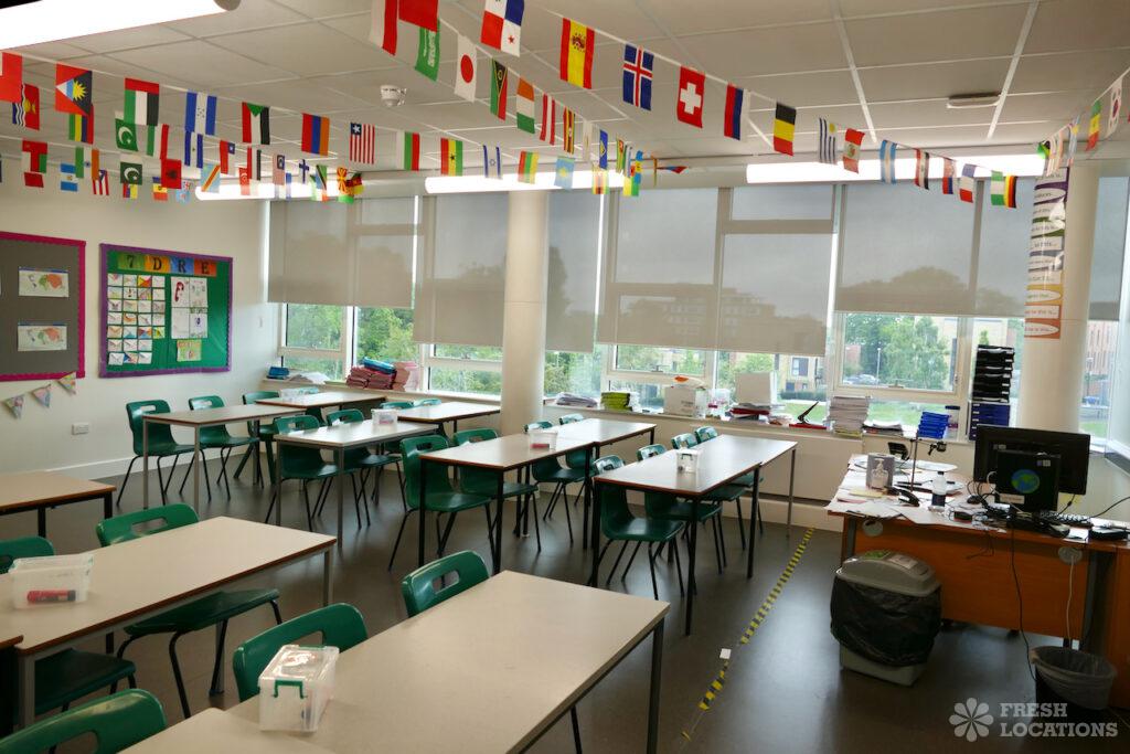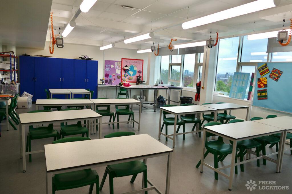 Large modern secondary and Sixth Form school in Putney. Featuring several large classrooms, library, football pitch, playground and city views. London Borough of Wandsworth.