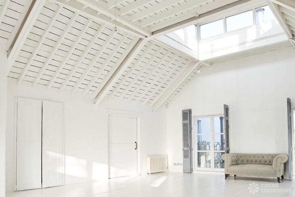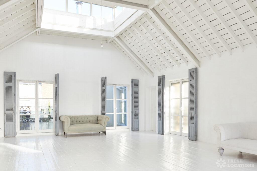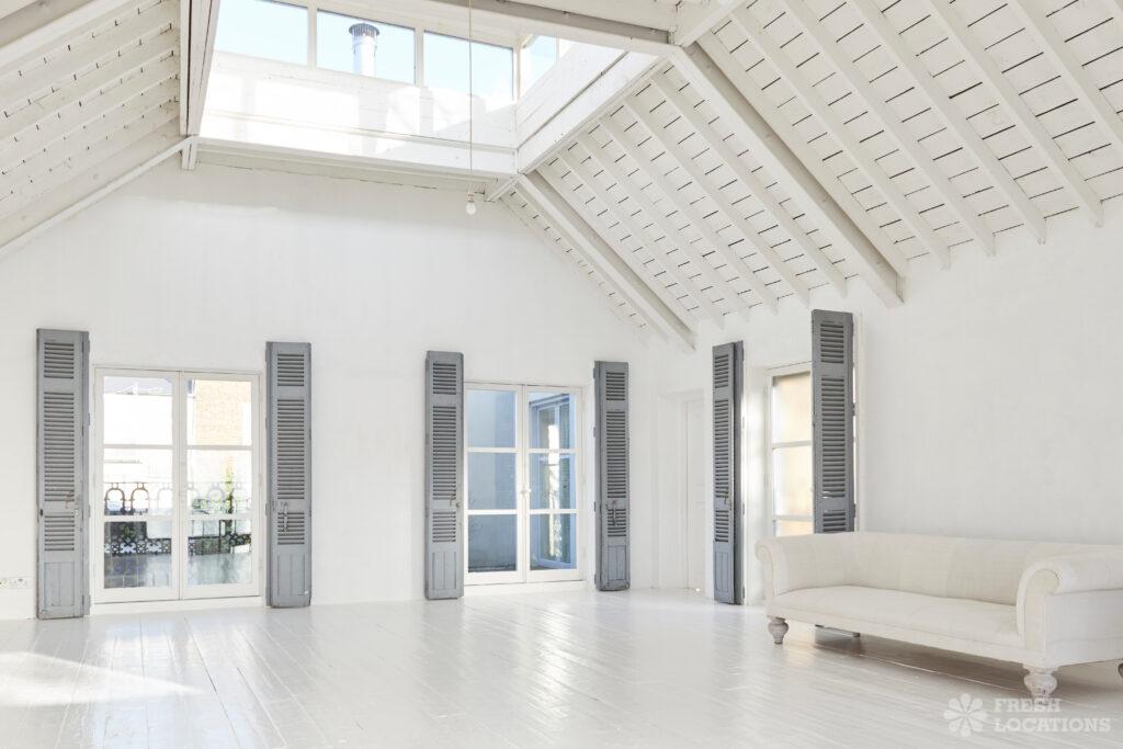 Versatile lifestyle space in Islington. Large upstairs daylight studio with skylight and white wooden floors. Open plan living area, with a mediterranean feel, leads to …