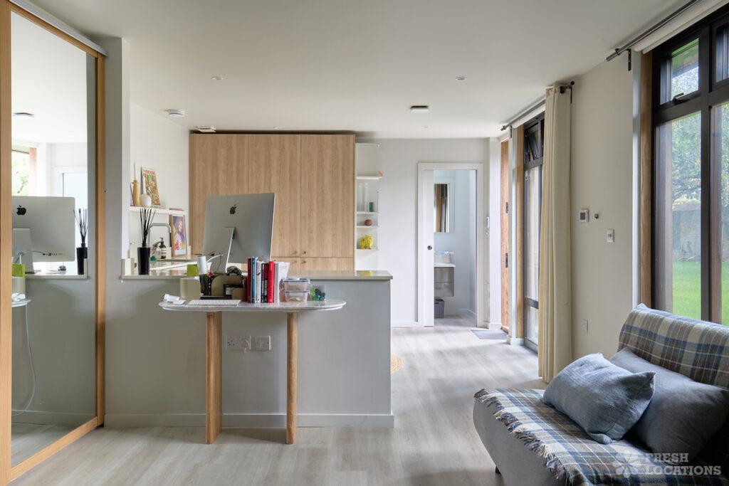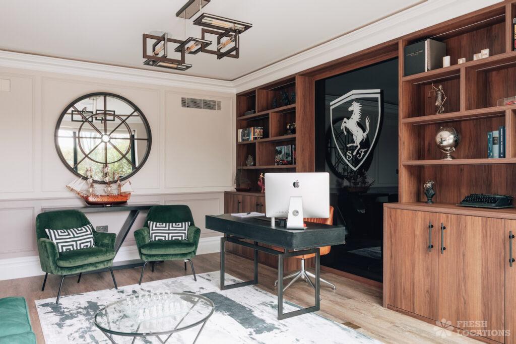 A luxury open-plan designer house shoot location featuring marble detailing and striking Crittall-style arched doors overlooking a beautifully kept garden. The interiors include a wood-clad …