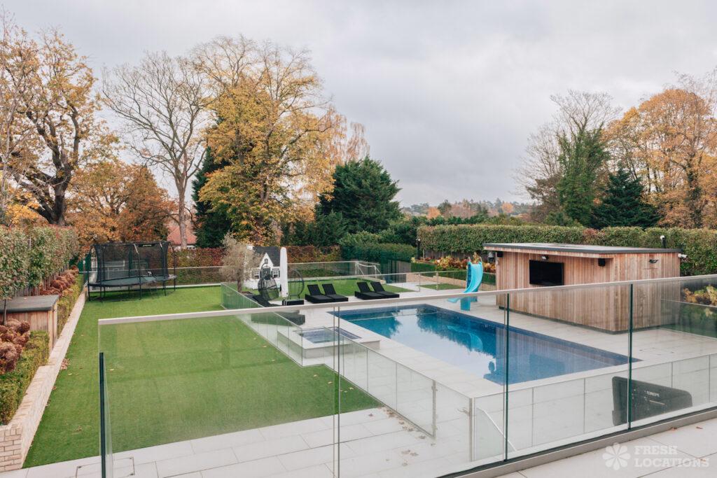 A beautiful detached house shoot location in Bromley featuring four bedrooms and three bathrooms. This elegant family home includes a large outdoor swimming pool, a …