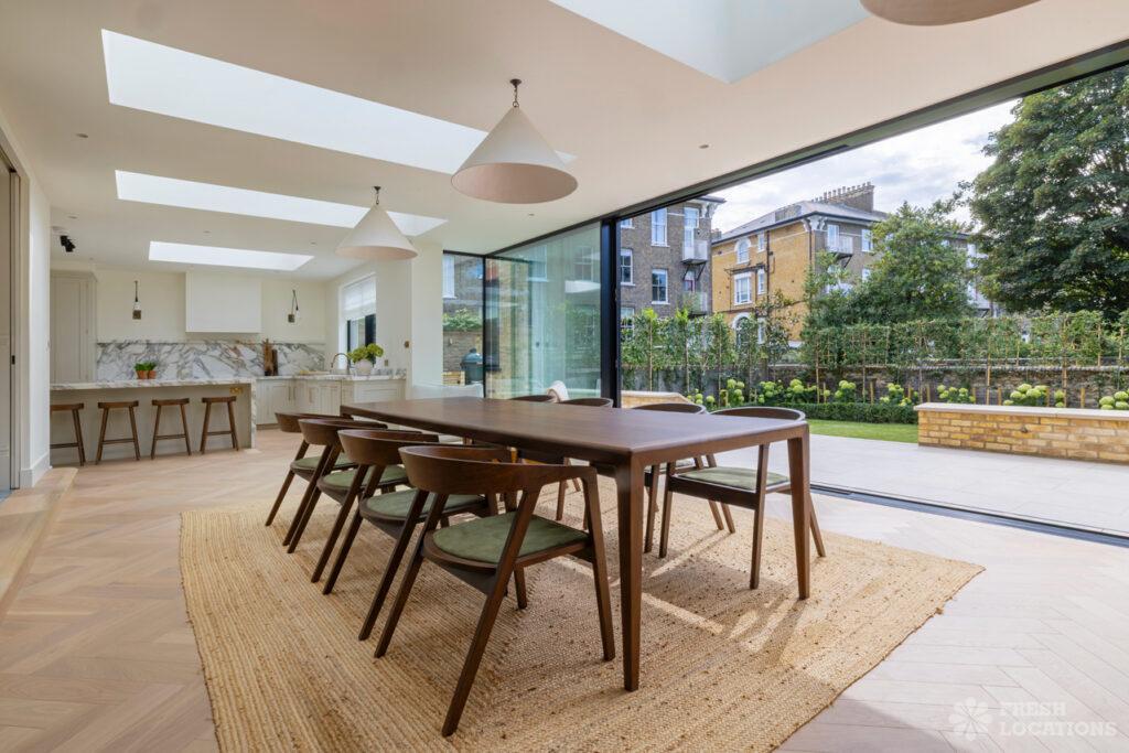 A charming 1930s house shoot location in North West London, featuring a spacious rear kitchen and living area with a vaulted roof and striking oak …