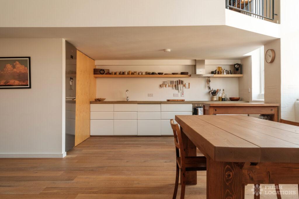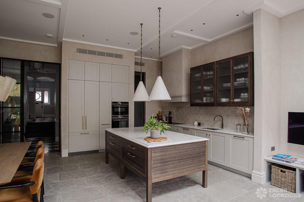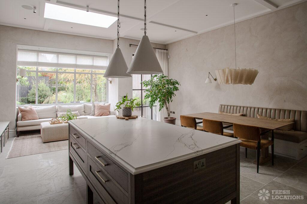 A stylish and contemporary shoot location in South West London, this property features an open-plan kitchen, dining area, and living room located within a modern …