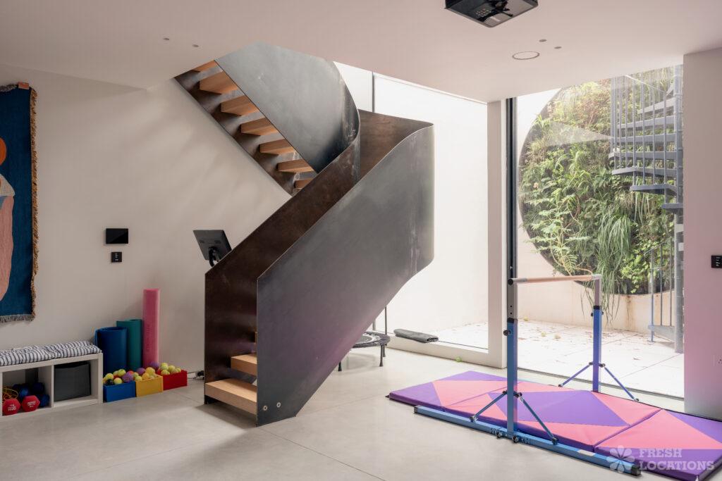 Mid Century detached house in Richmond. This amazing shoot location mixes 70s style with contemporary features. The property includes an open wooden staircase, wood clad …