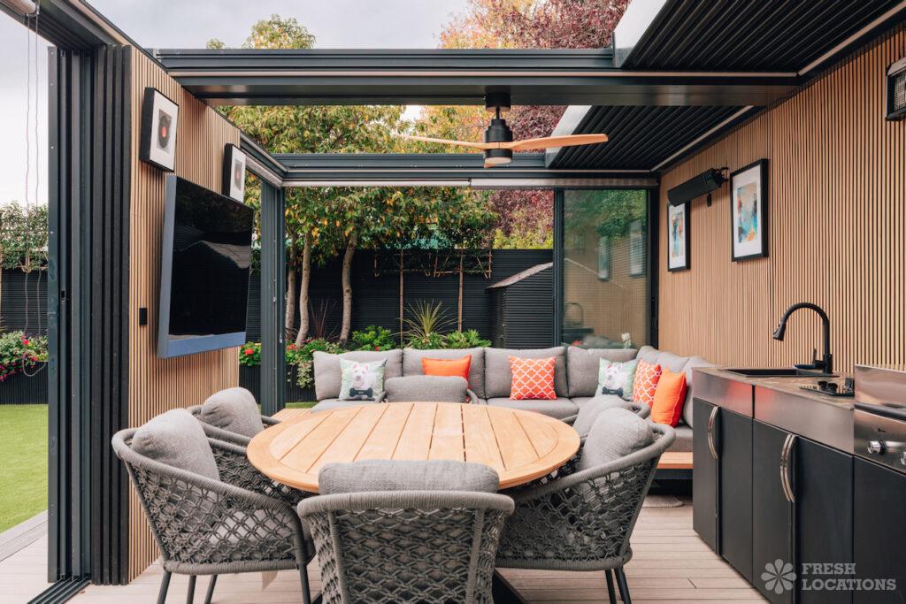 A luxury open-plan designer house shoot location featuring marble detailing and striking Crittall-style arched doors overlooking a beautifully kept garden. The interiors include a wood-clad …