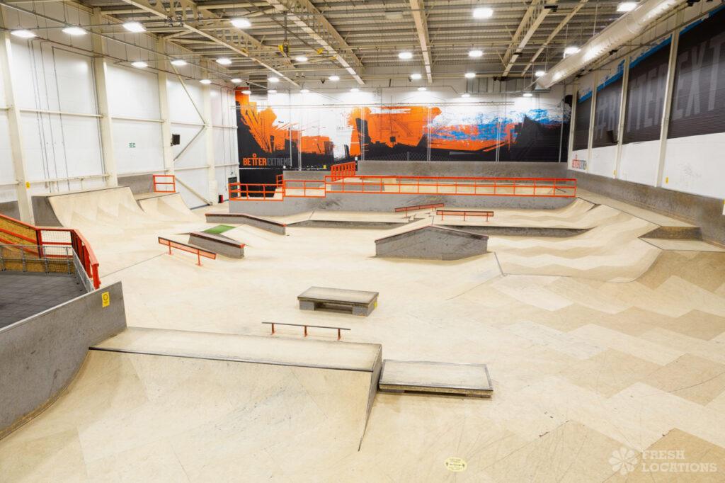 Large sport centre and gym shoot location in East London. Featuring s large studio, sports hall, gym, trampolines, skate park, kids area and cafe. Private …