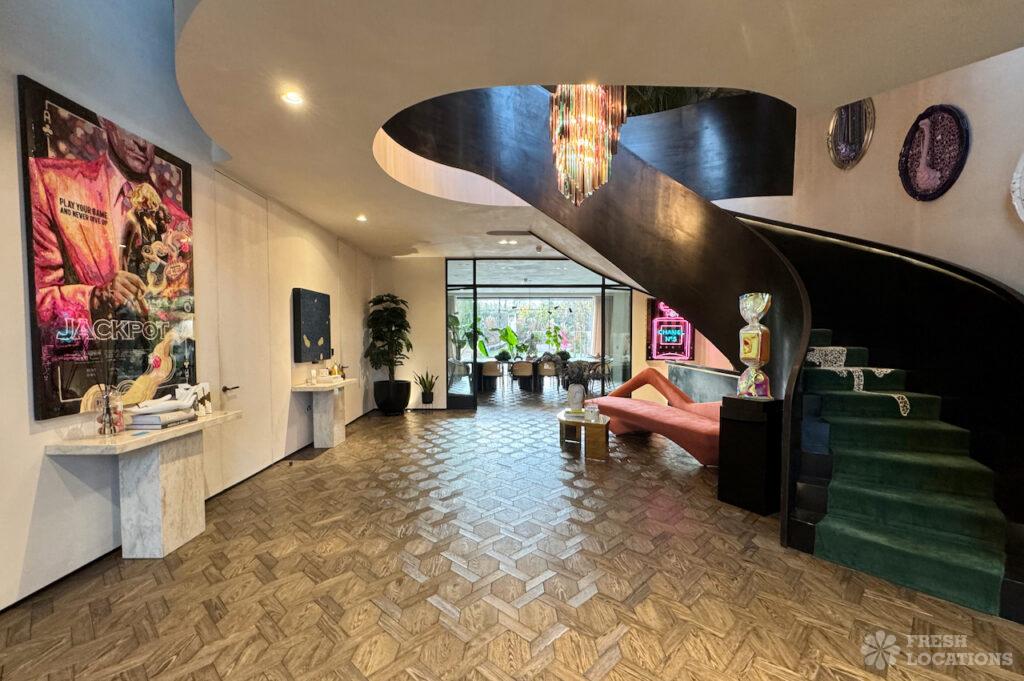 A modern and spacious country house shoot location with a glamorous 70s Slim Aarons feel, complemented by Mid-Century Modern details. The property features seven bedrooms …
