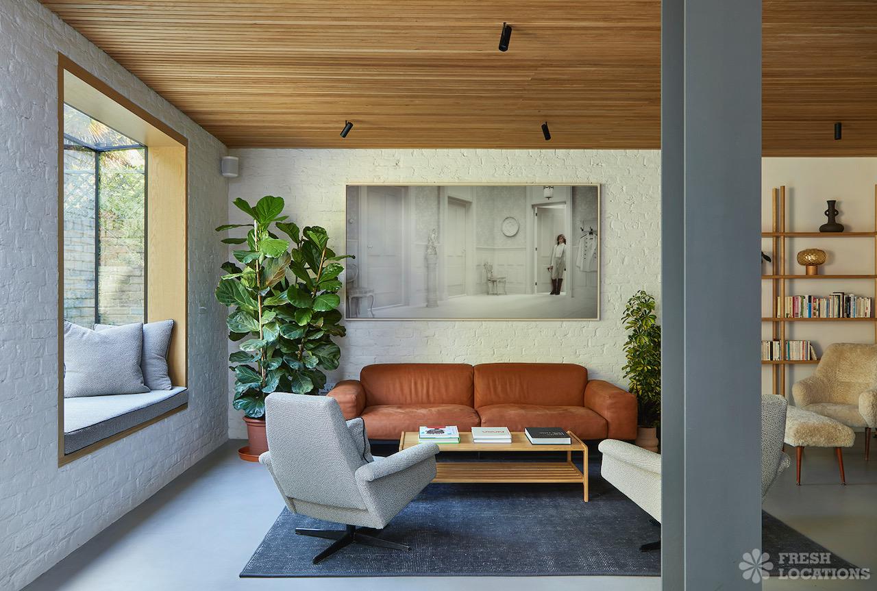 A mid-century modern house shoot location in North West London. This period house has a modern wood and glass double height rear extension, exposed brick …