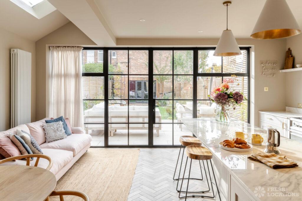 Family home shoot location in North London. Featuring large double reception room leading to bright conservatory and open plan kitchen diner with sliding doors opening …