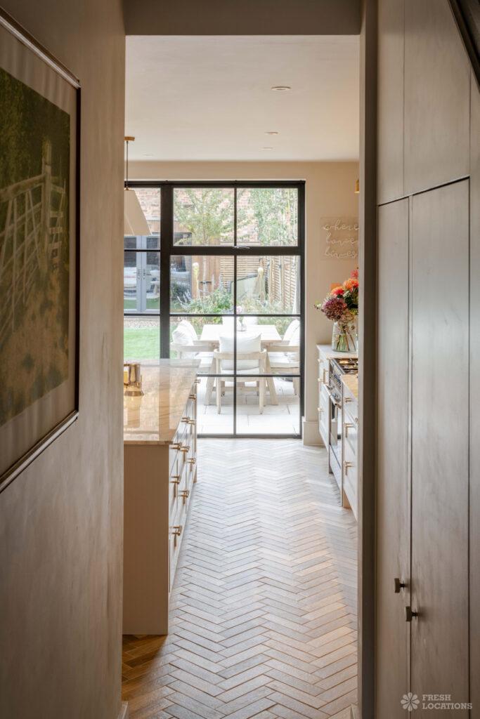 A stylish residential shoot location in North London featuring elegant wood flooring and charming Victorian details. The vibrant kitchen boasts colourful tiled finishes, a kitchen …