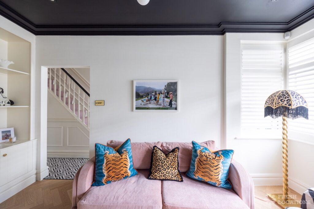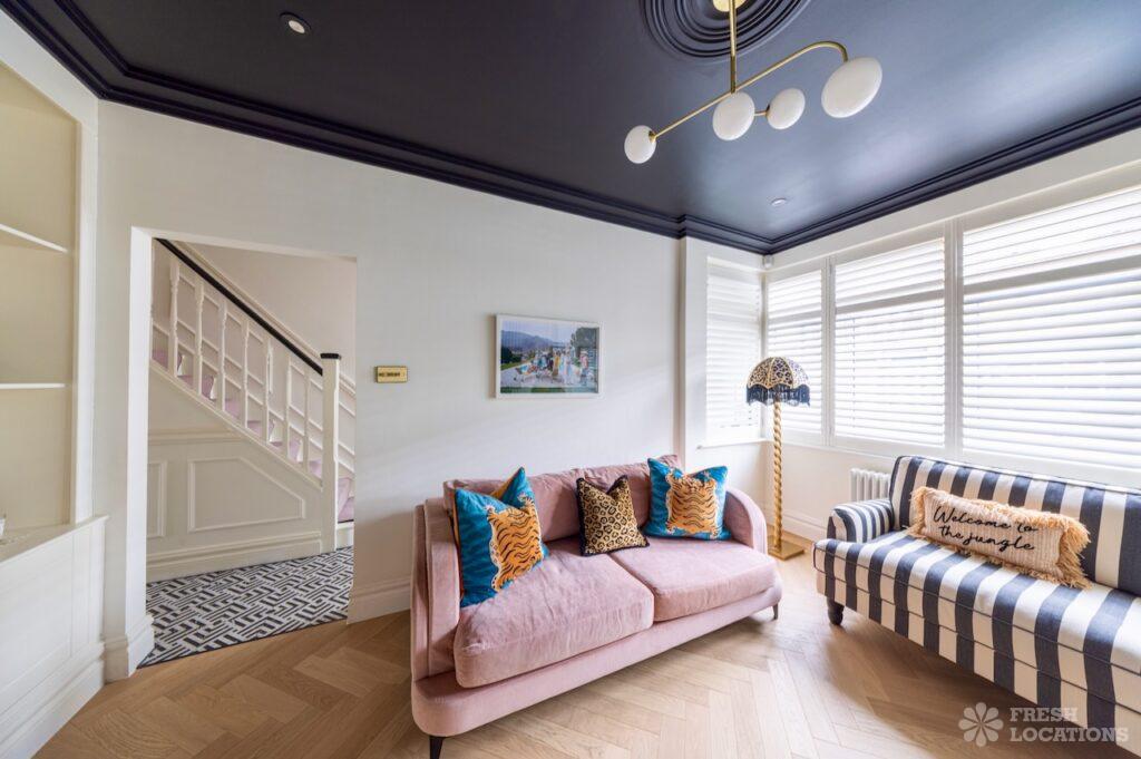 A colourful pink shoot location in South London. This family home has a newly renovated kitchen, a living room with parquet floor and a living …