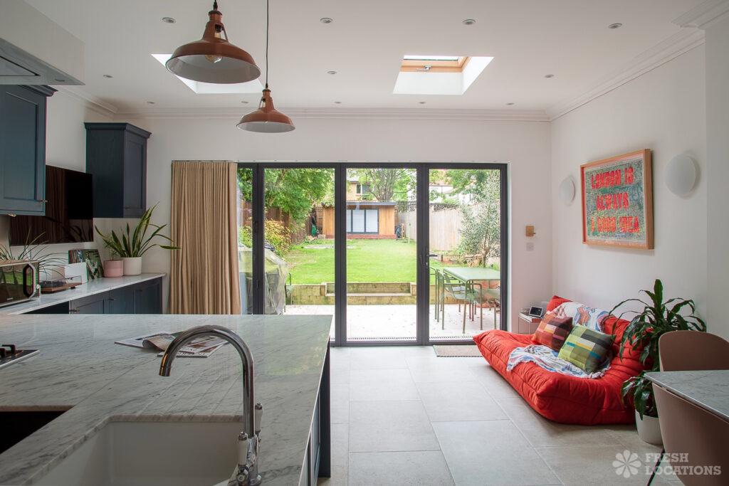 Detached family home shoot location in South East London. Large open plan kitchen/dining area, five bedrooms and a walled garden with a courtyard and tree …