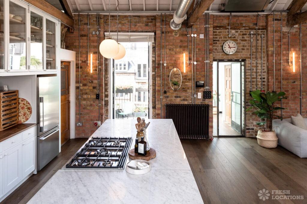A family house shoot location in south west London with a blend of classic and modern furniture. This property has a modern kitchen with a …