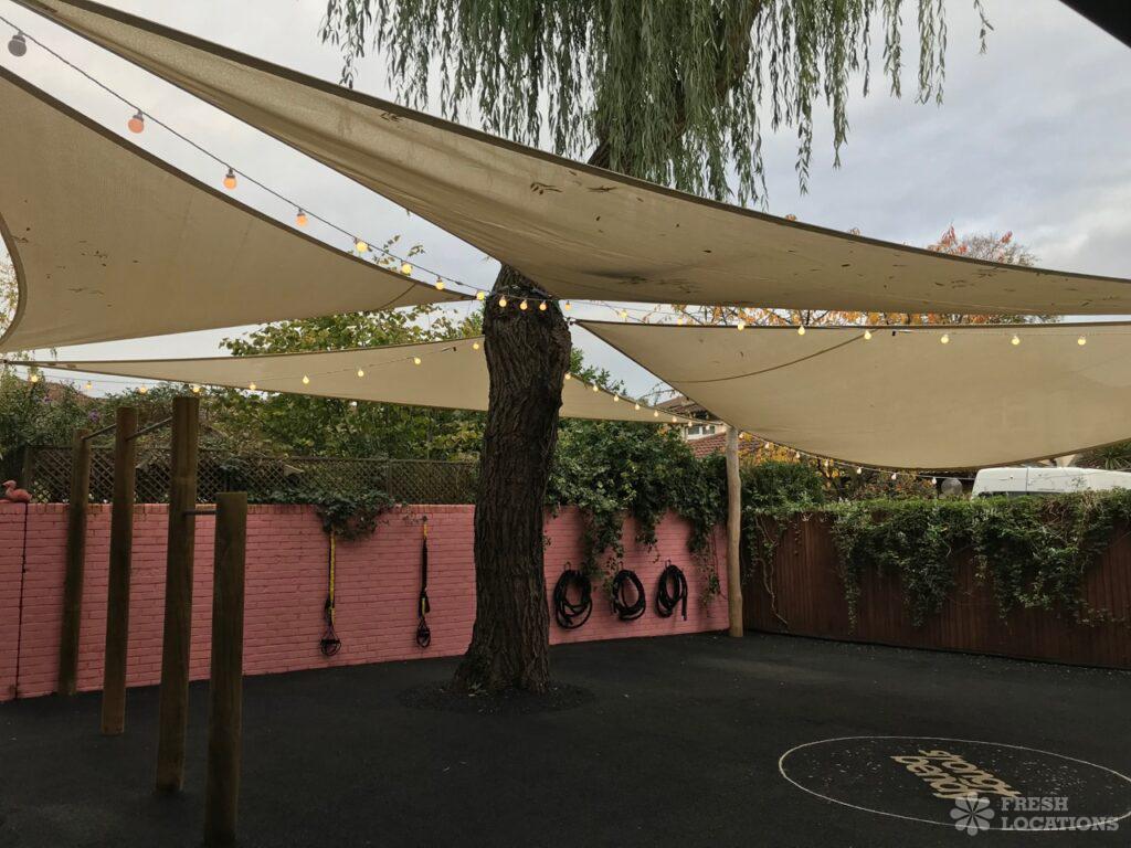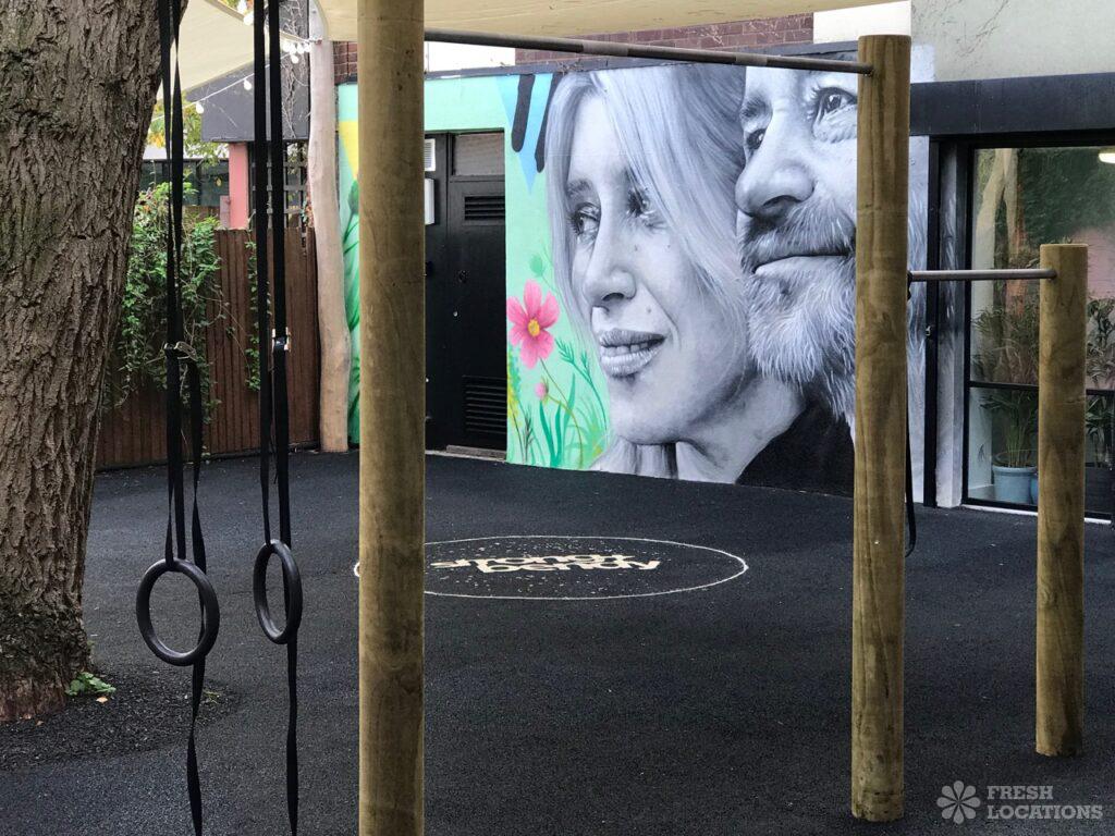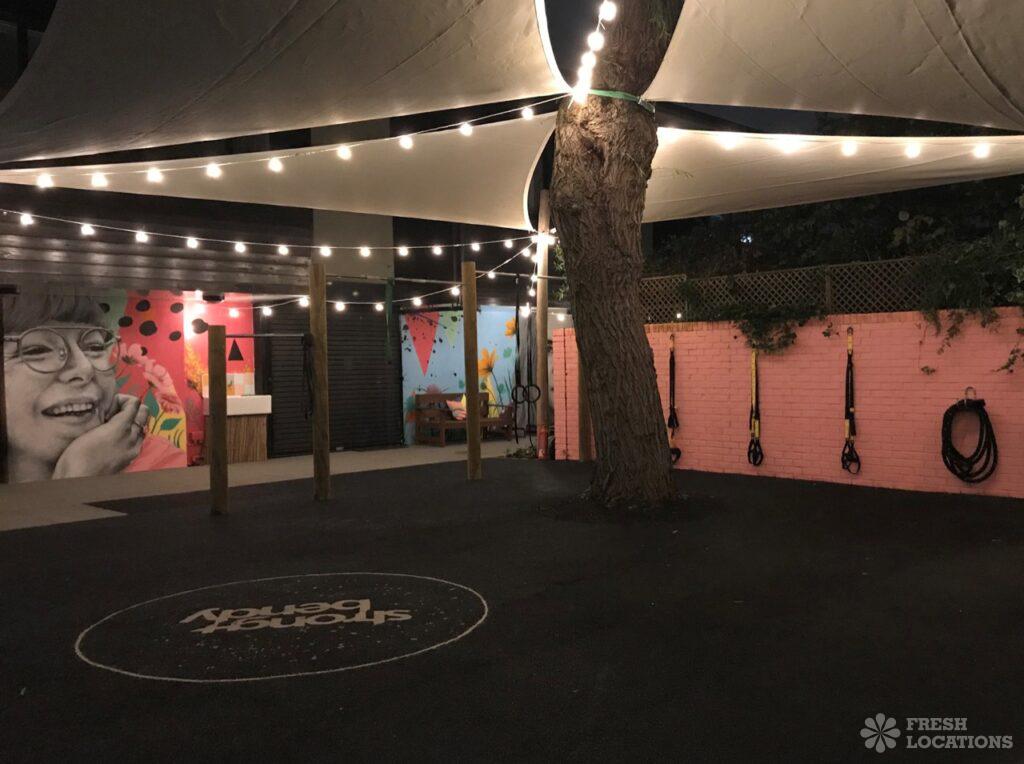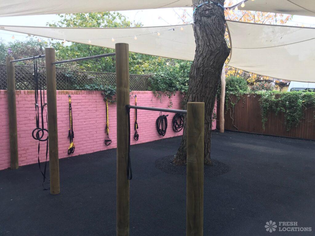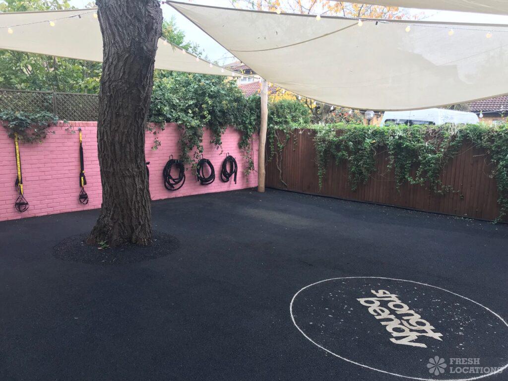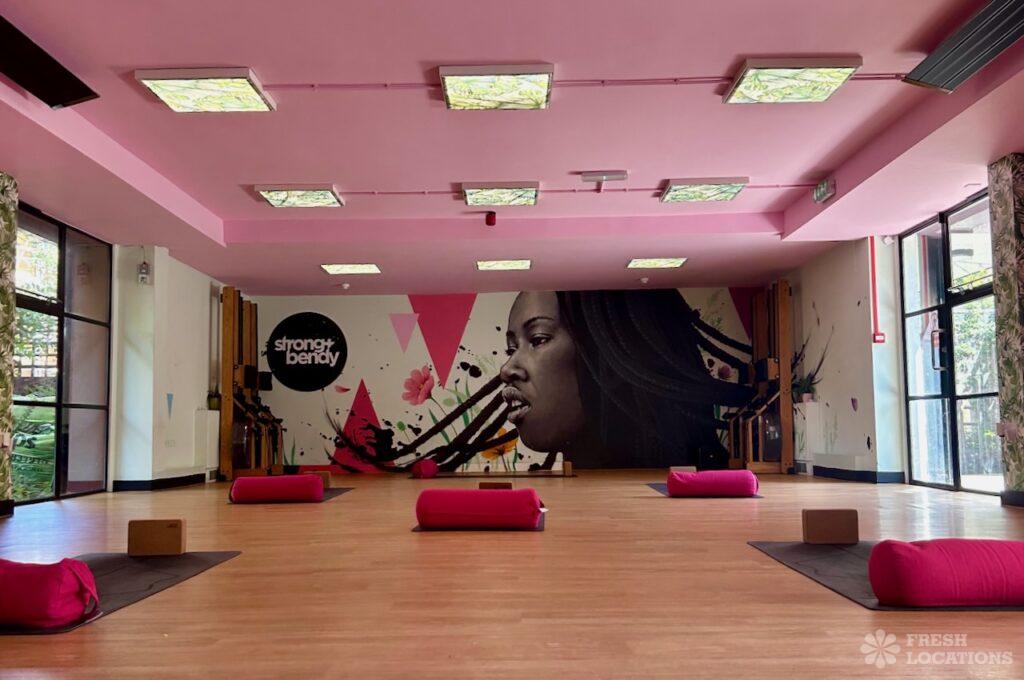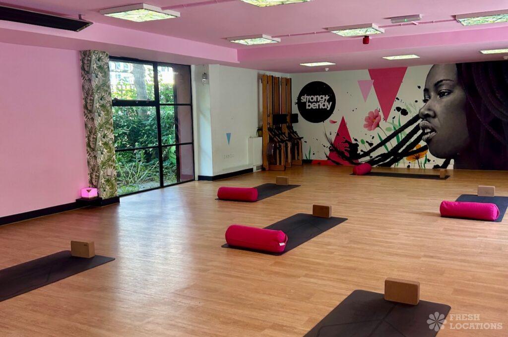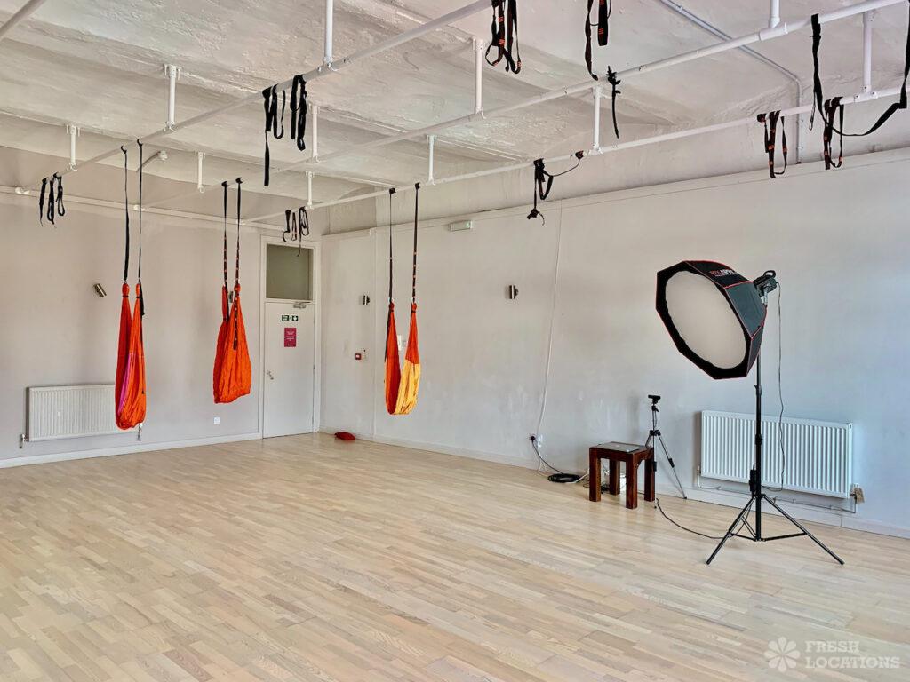 A fitness and yoga studio shoot location in East London. Large indoor studio space with light wooden floors and an outdoor exercise area. London Borough …