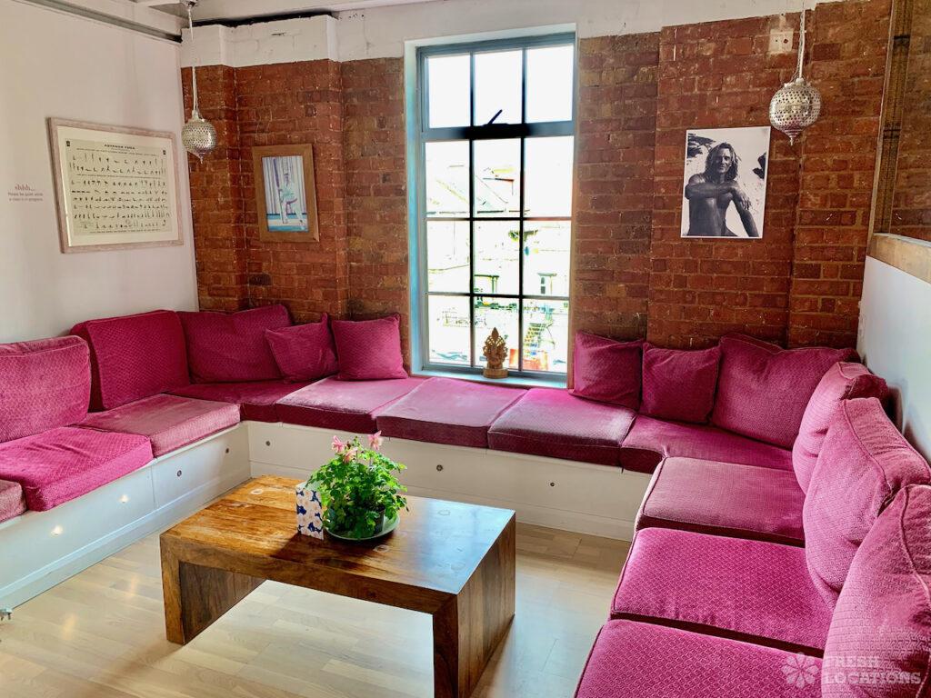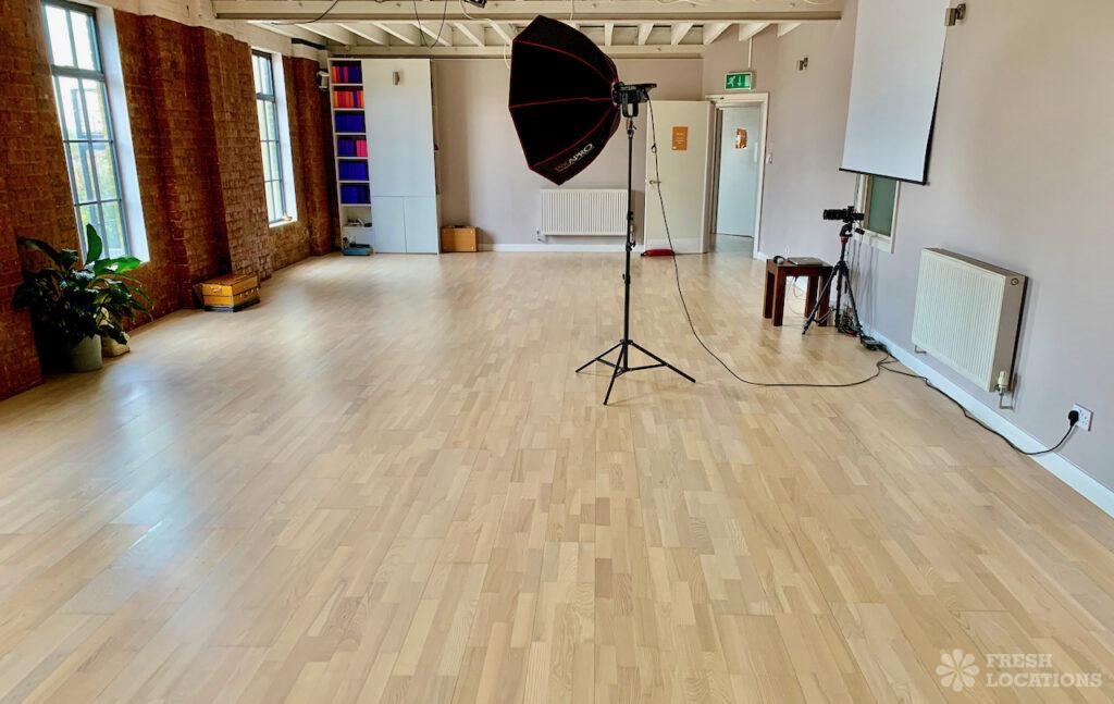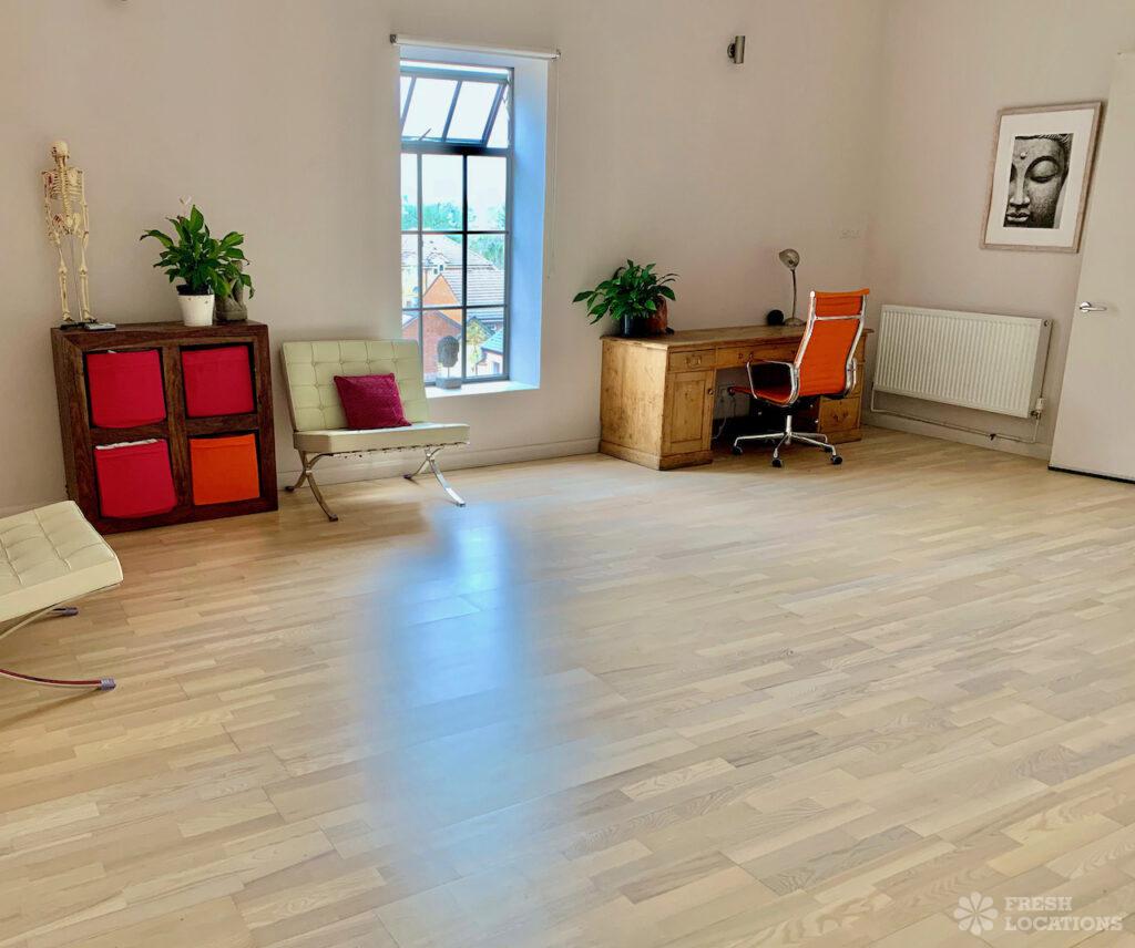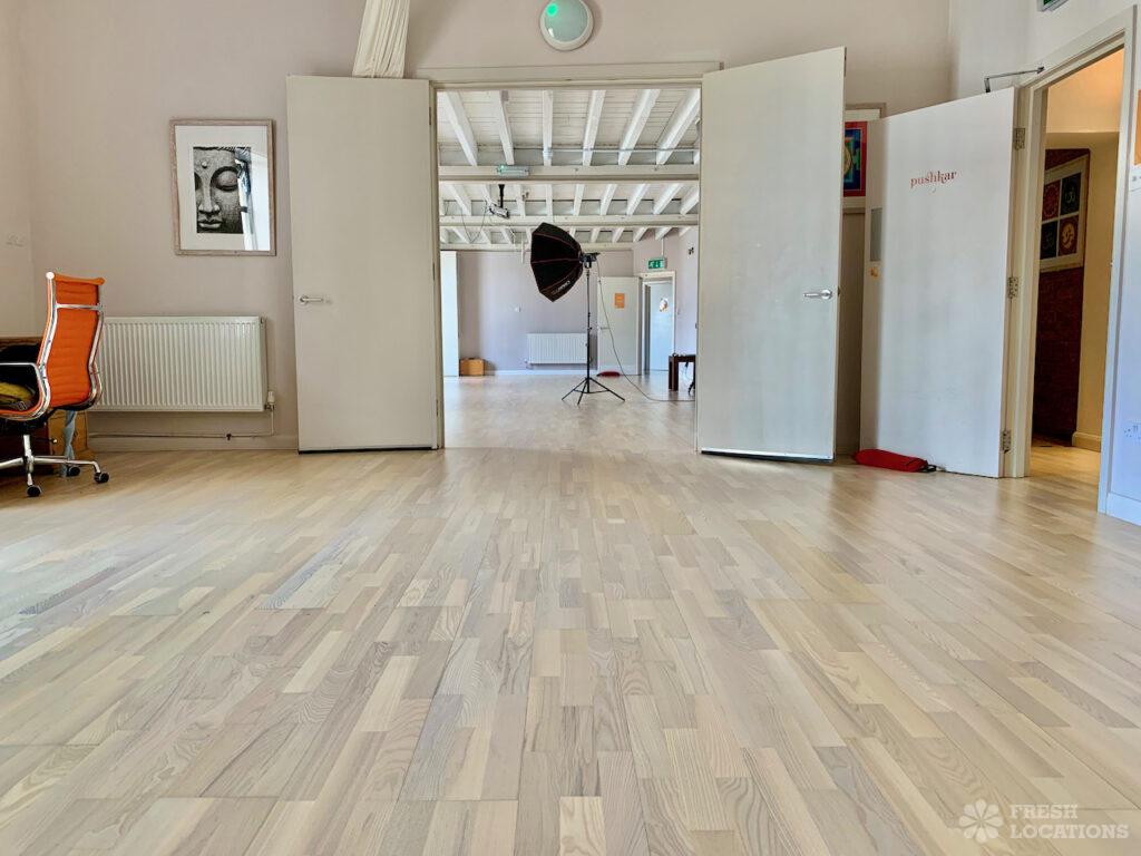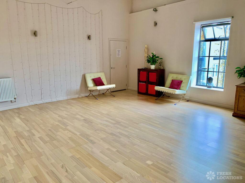 Spacious yoga studio shoot location in South East London. Three light-filled studios within a converted Victorian warehouse featuring light wood floors, reception area and changing …