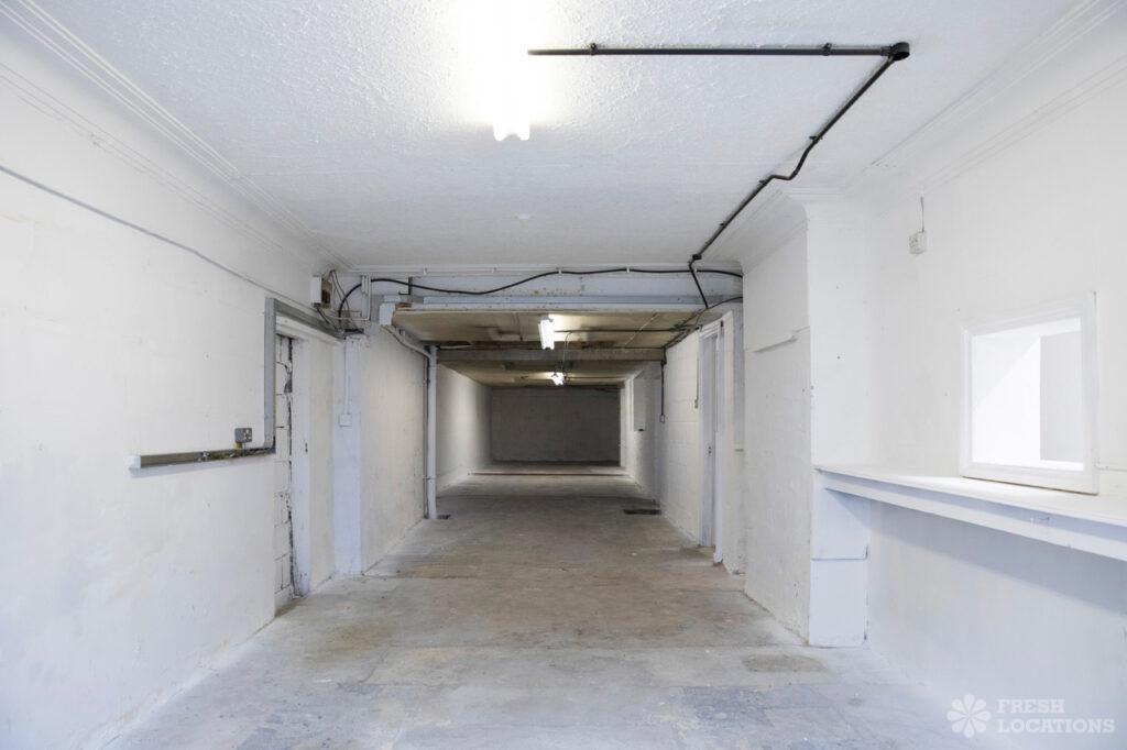 Retro office shoot location with wood panelled meeting room, dining room, and corridors. Old fashioned decor with faded carpets. Featuring an industrial workshop, large garage …