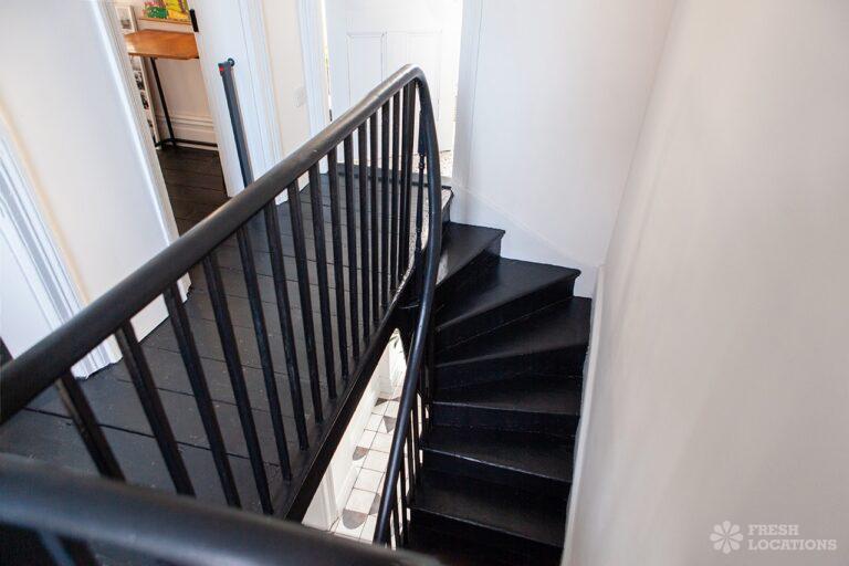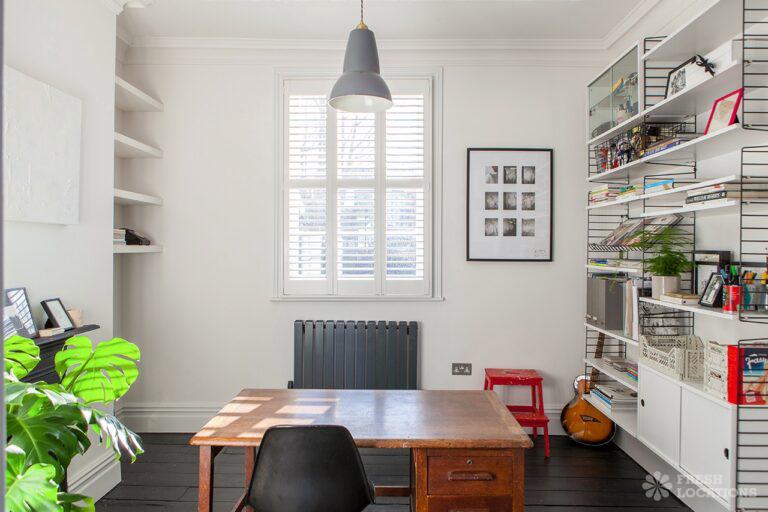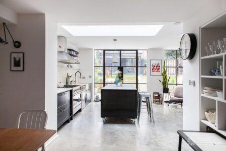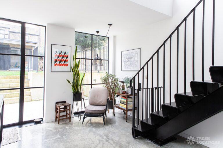 Wood Floors, Dark Wood Floor, Driveway, Fireplace, Full Height Windows, Garden, Gas Hob, Island Kitchen, Moveable Island, Polished Concrete, Skylights, Staircase, Summer House, Walk In ShowerVictorian family home shoot location with modern interiors in East London. Featuring a large open plan kitchen/diner with polished concrete floors, dark units and painted worktops. With crittall style doors opening onto the garden with a sunken terrace and garden shed. Two spacious living rooms, with original fireplaces and panelled shutters and two bedrooms. London Borough of Hackney.