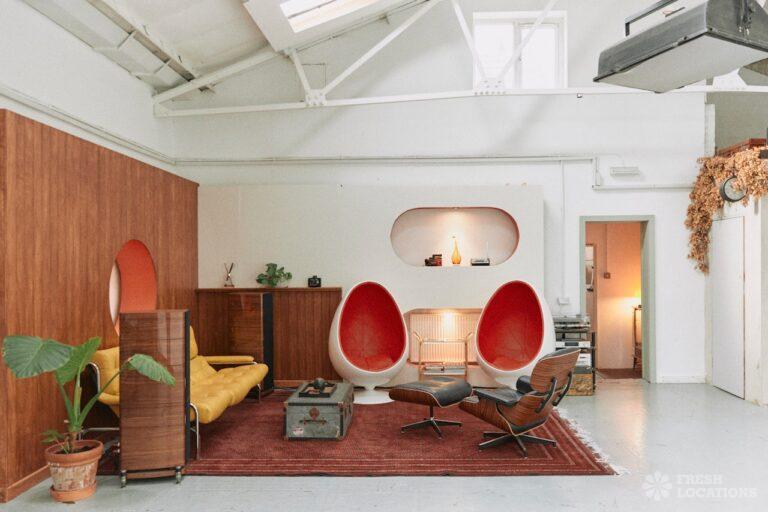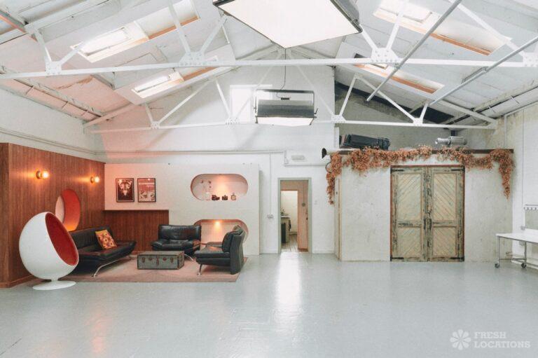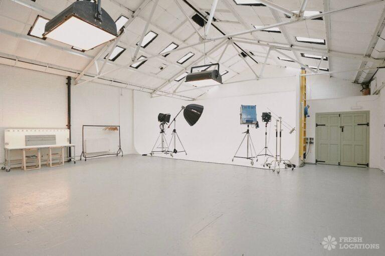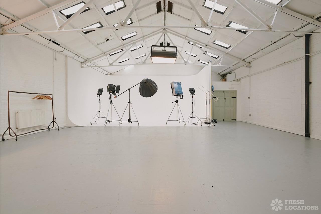 A restored 19th-century warehouse located in North London. This spacious and adaptable space features a three-wall infinity cove as well as many other incredible background textures. Other features include white brick walls and generous warehouse skylights that flood the space with natural light. The 8 by 5-meter cove comes complete with an overhead lighting rig and industrial power outlets. Situated within the same complex as Art Studio, Cook Studio, and Green Studio, this space can also be hired together with them. London Borough of Barnet.