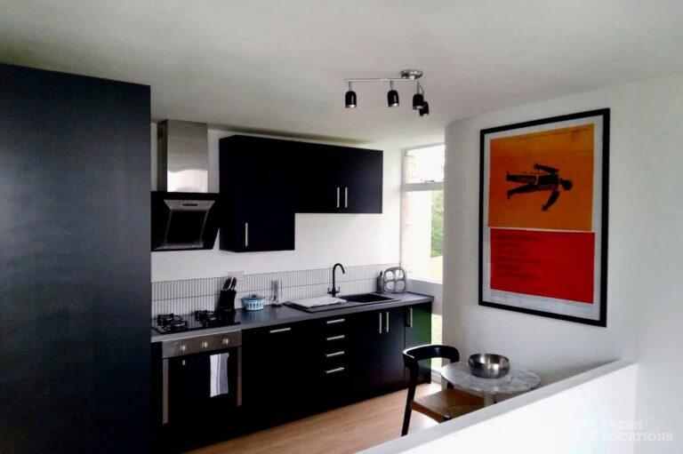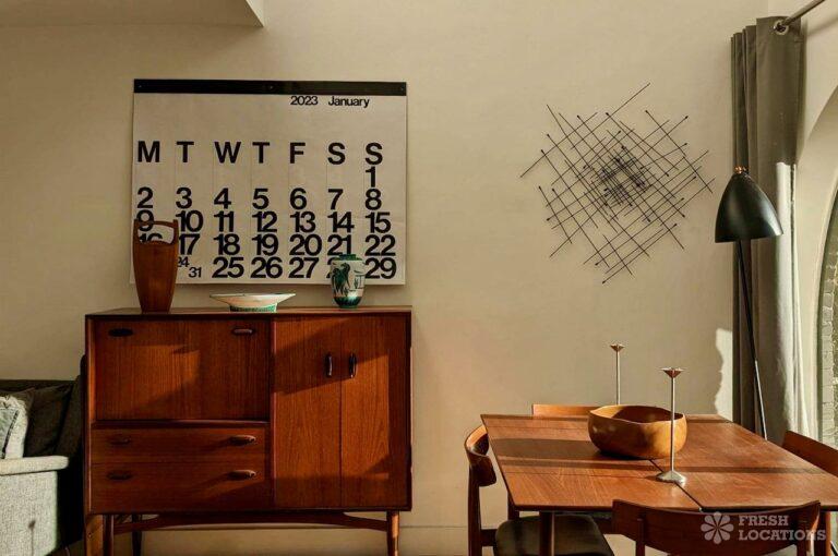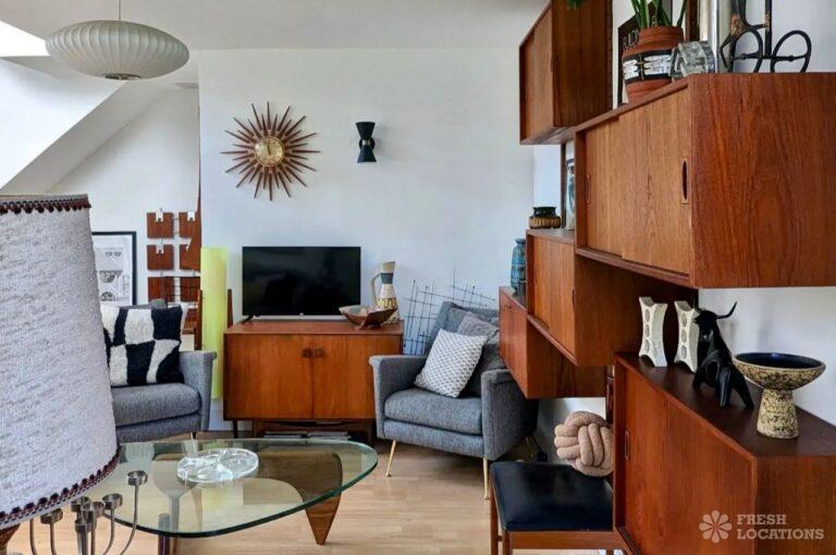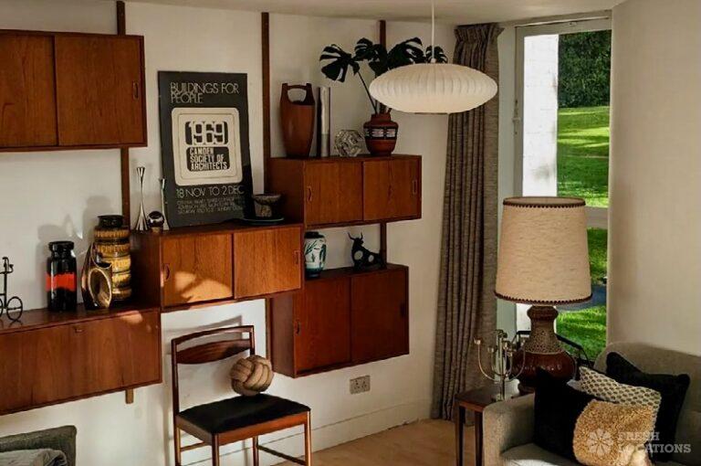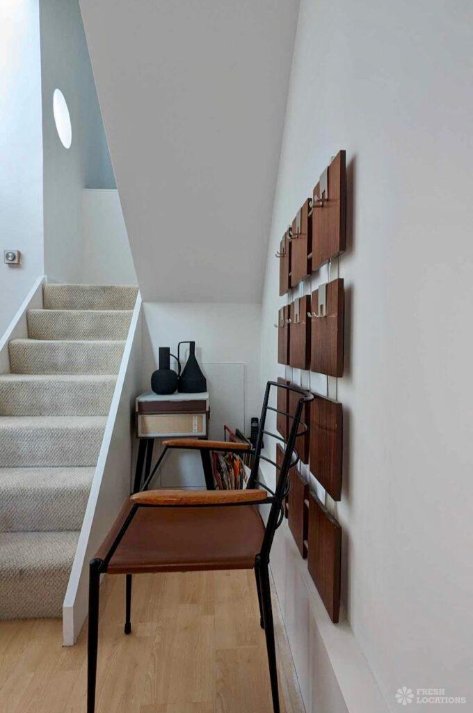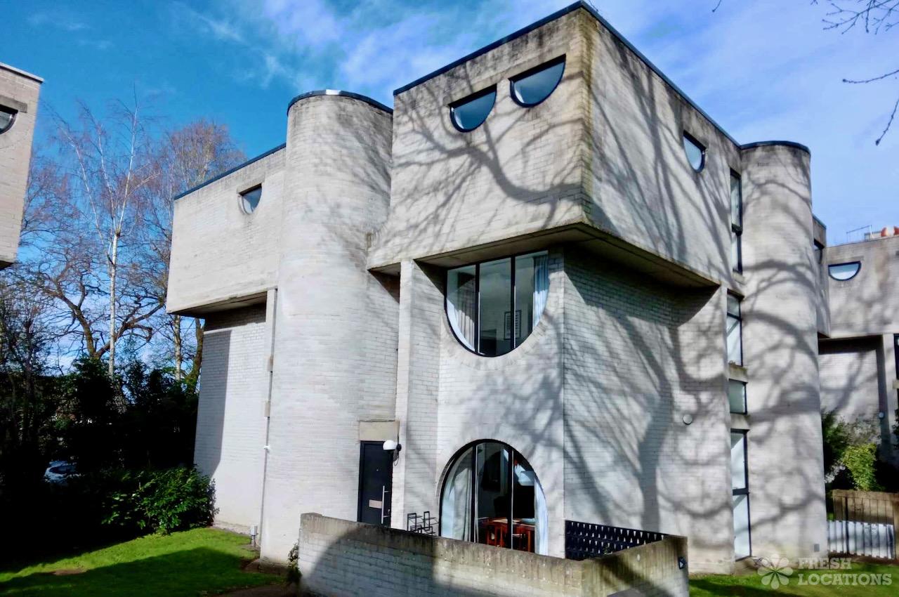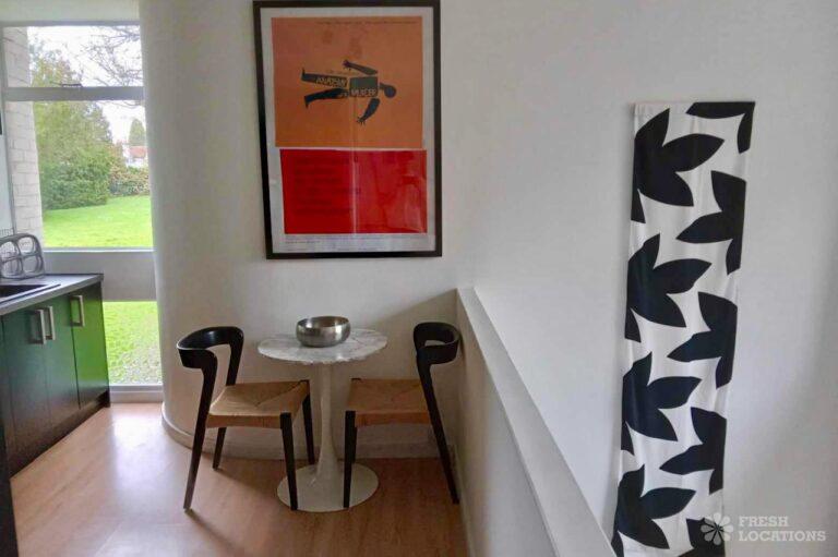 A Midcentury Brutalist house shoot location in Surrey. This property was designed by the Brutalist Architect Laurie Abbot and features a mezzanine interior with many vintage pieces throughout. This unique location house boasts a striking exterior, characterized by its bold lines and raw concrete façade, providing an unforgettable backdrop for any film or television production seeking an edgy aesthetic. Inside there is a meticulously curated mid-century interior, exuding warmth and sophistication with its clean lines, organic shapes, and iconic furniture pieces.