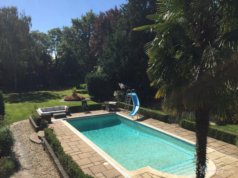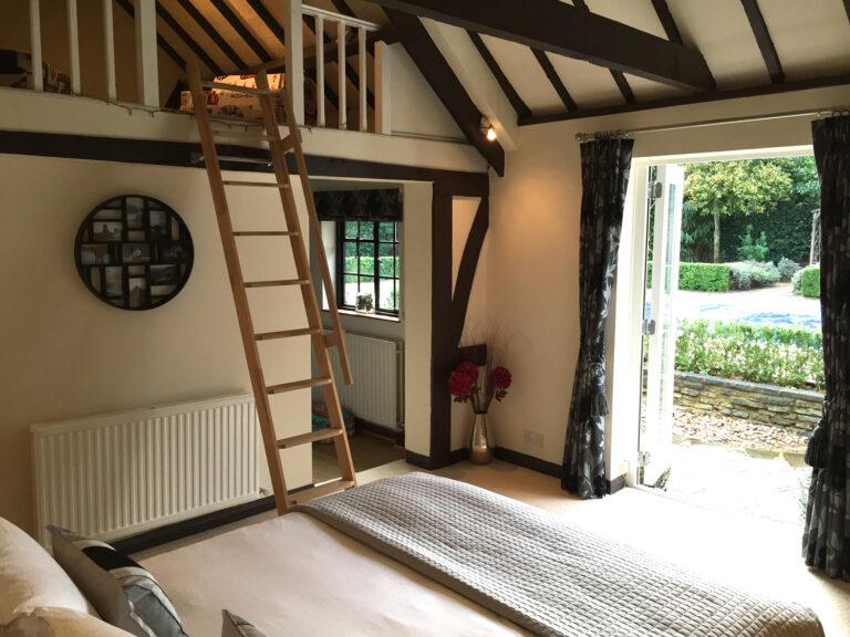 Wood Floors, Exposed Beams, Garage, Garden, Home Office, Island Kitchen, Light Wood Floor, Open Plan, Skylights, Swimming Pool, Walk In Shower, Walk In WardrobeA detached, mock-tudor, family house in Surrey constructed almost 100 years ago, with a contemporary extension and an outdoor swimming pool set within a large garden. The original part of the house has many features including mezzanine levels and exposed timbers. The recent extension provides an alternative modern feel and plenty of light and space.