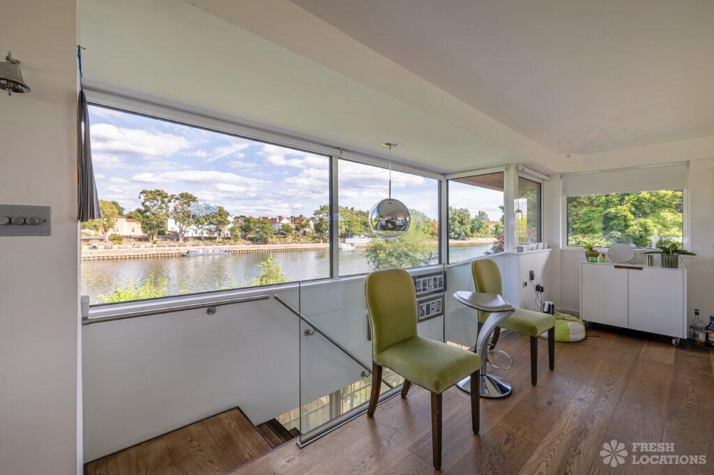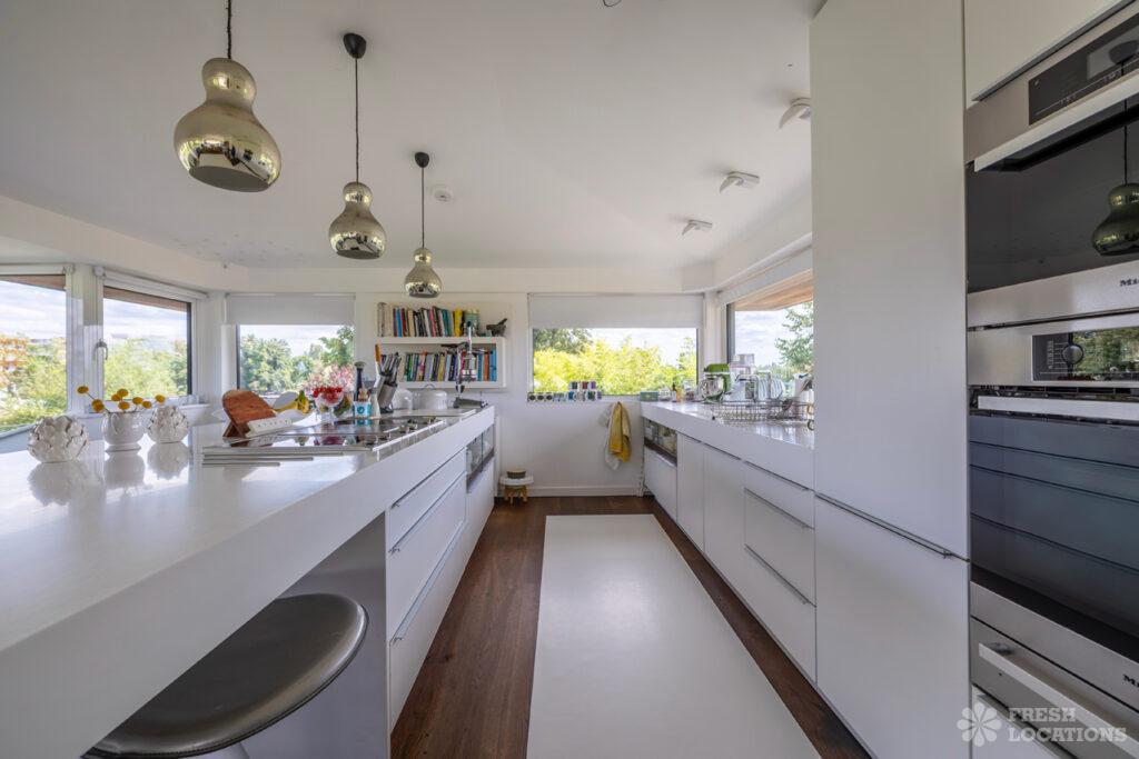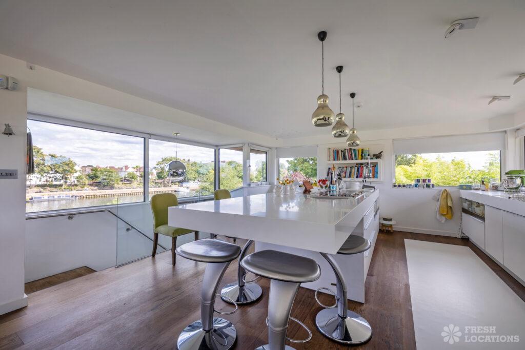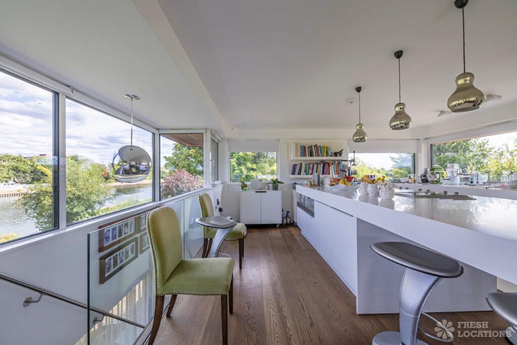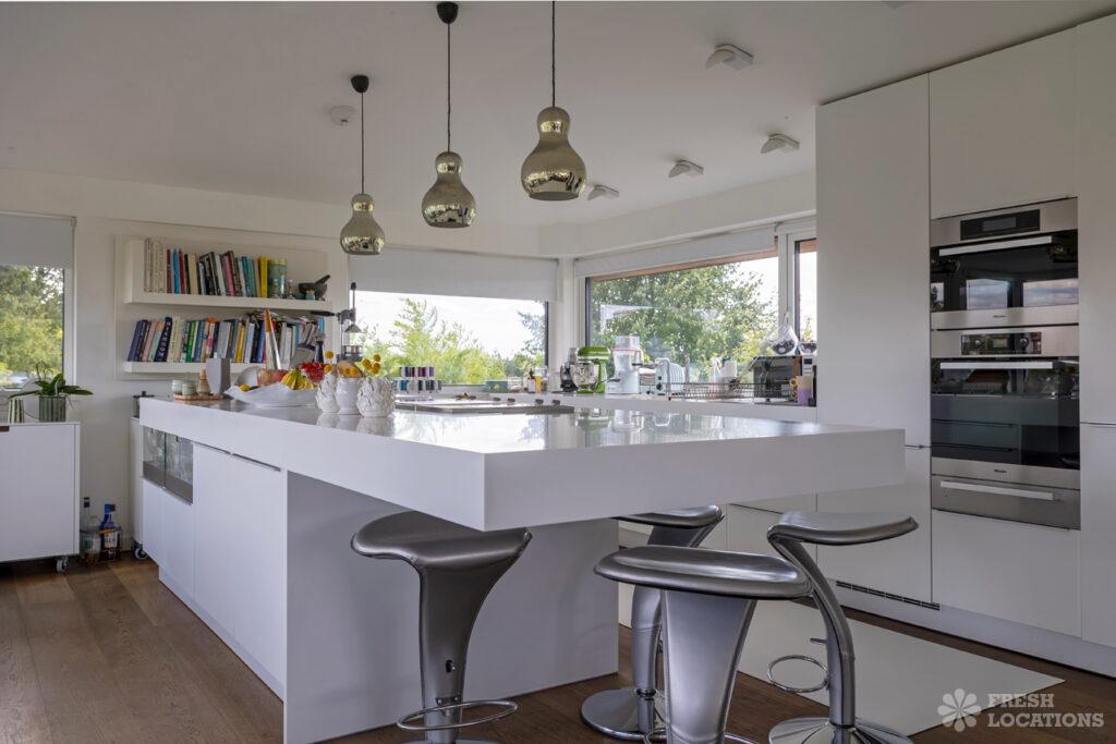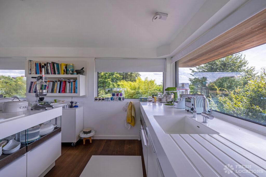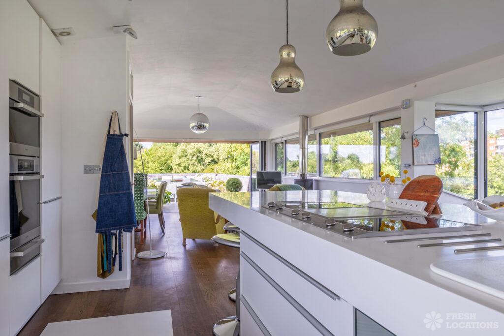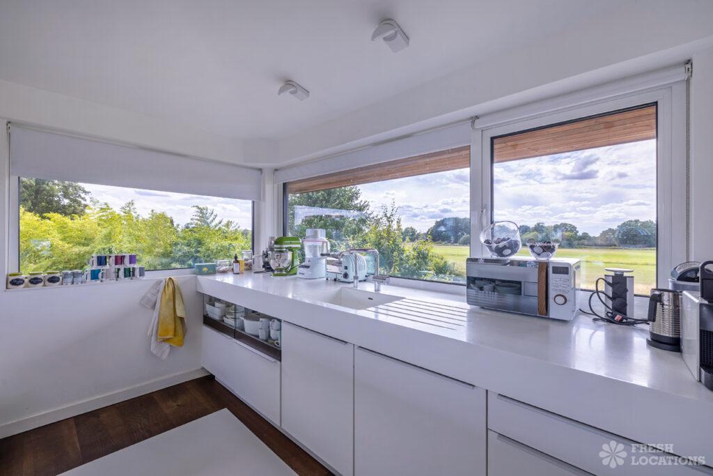 Light Wood Floor, Dark Wood Floor, Decked Terrace, Driveway, Garden, Island Cooker, Island Kitchen, Skylights, Tiled FloorModern shoot location house in Farnham. Extraordinary five- bedroom house surrounded by pine woodland. 3400sq ft of internal space, open plan kitchen/dining area with stunning views accross the valley. below.