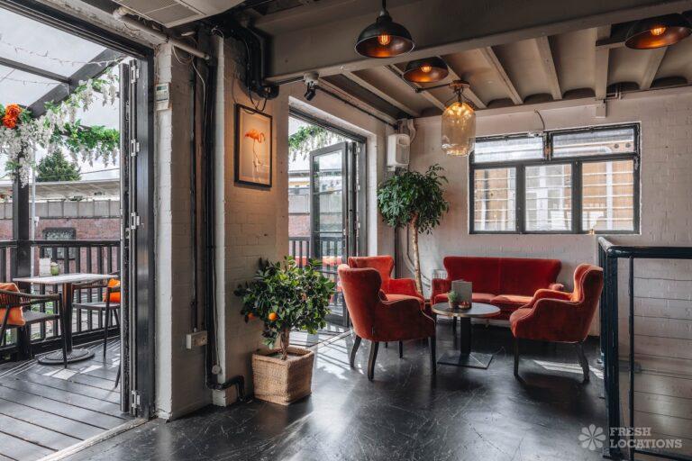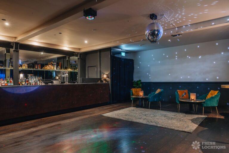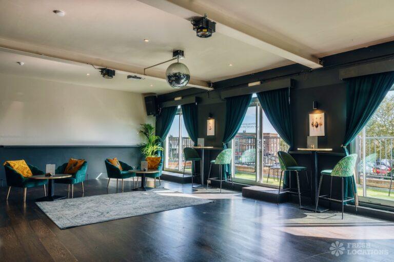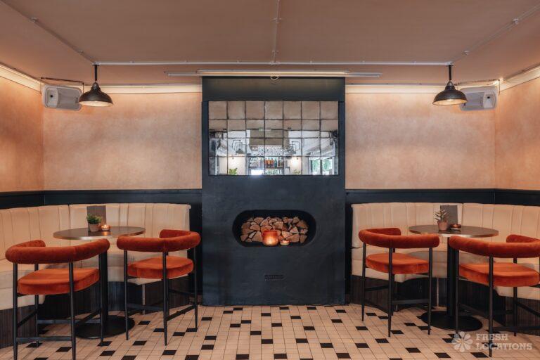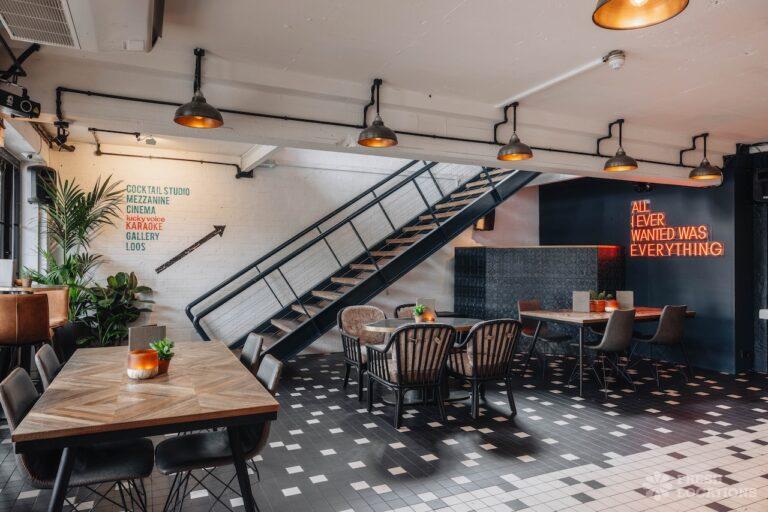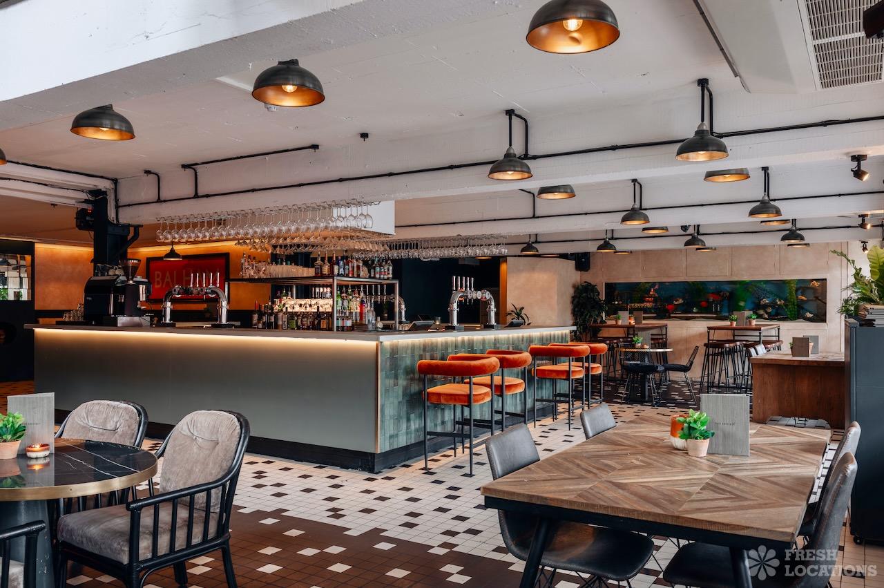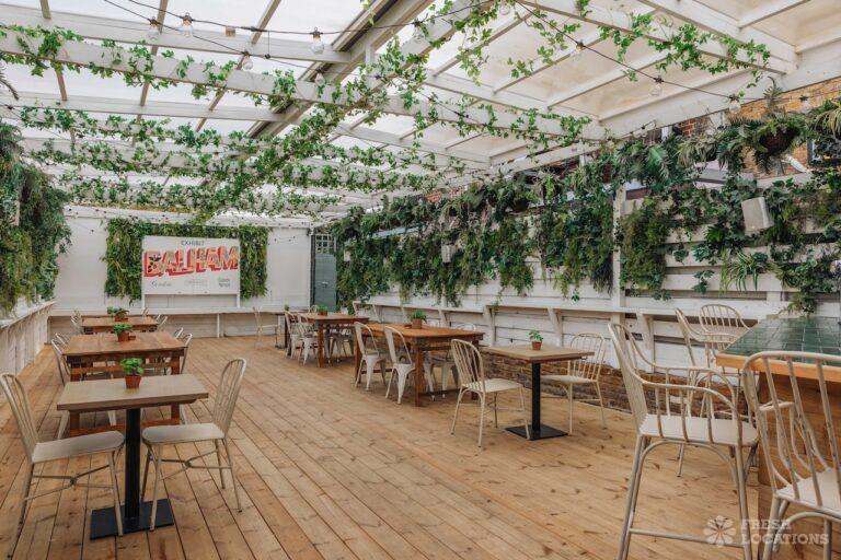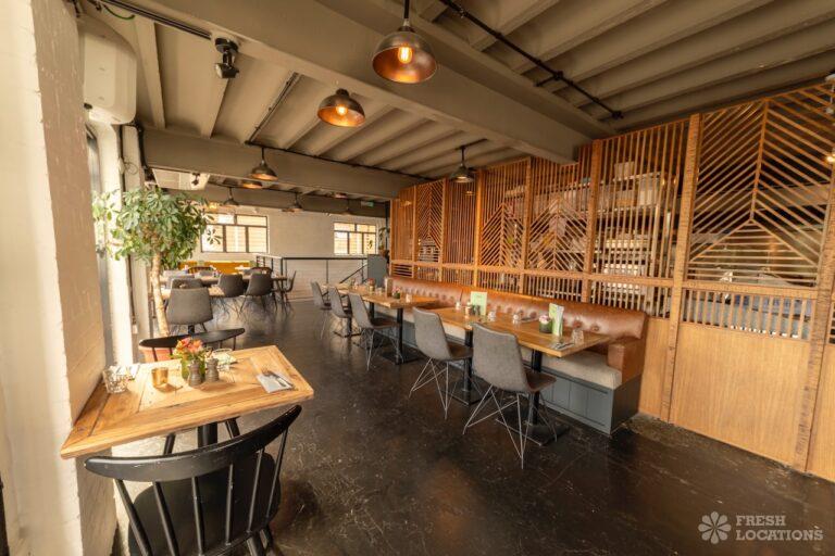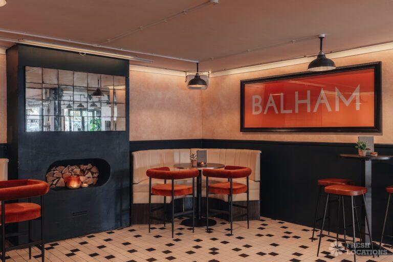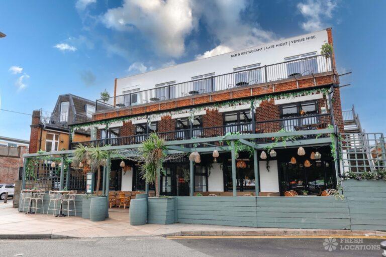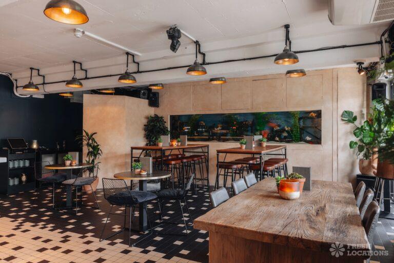 Bar, restaurant and coworking space in South West London. Featuring dining areas, a cinema space, a dance floor, decked terrace and balcony. Wood floors throughout. London Borough of Wandsworth.