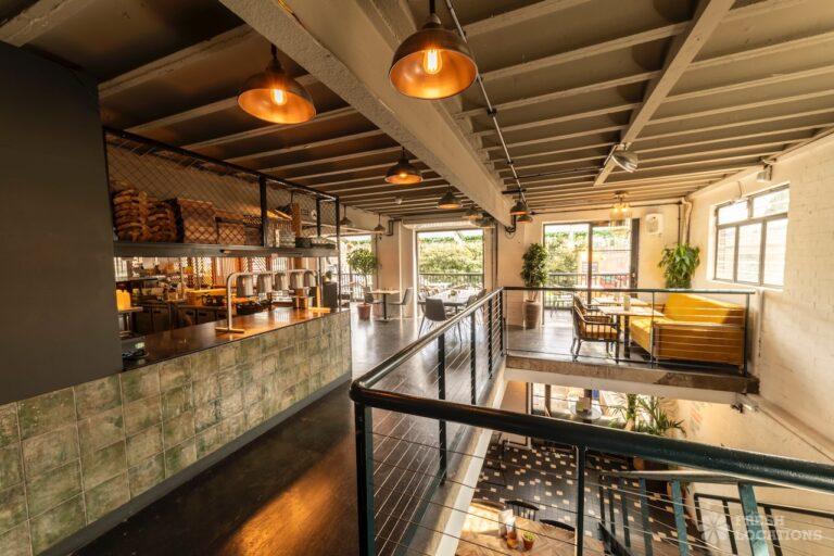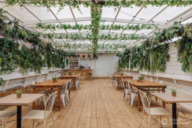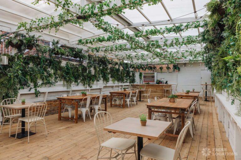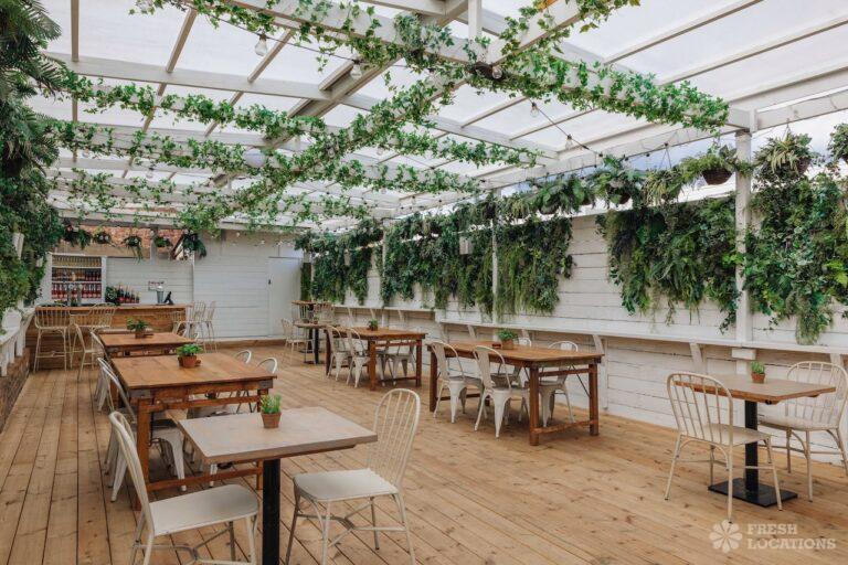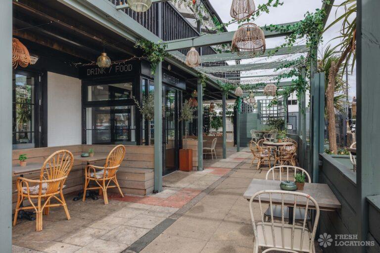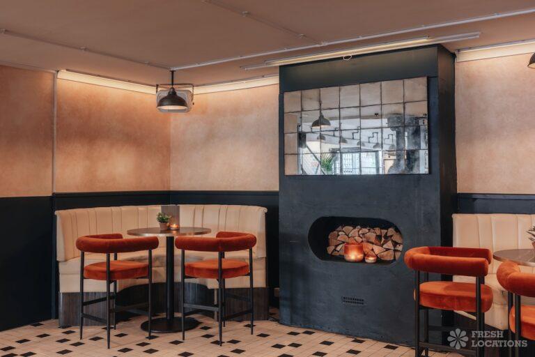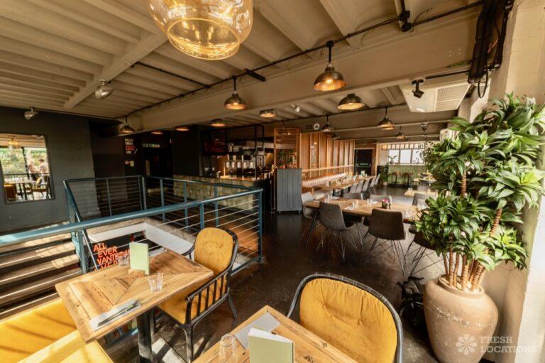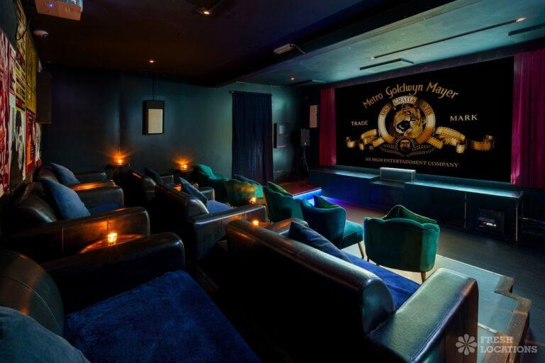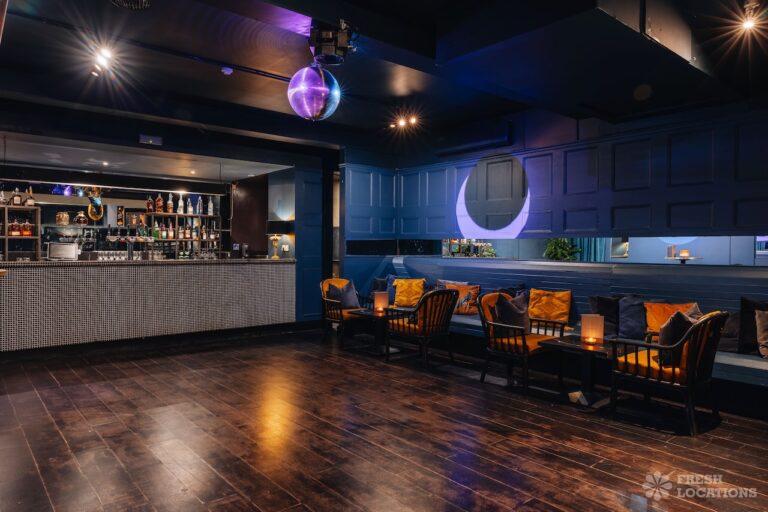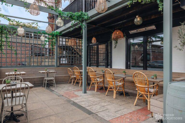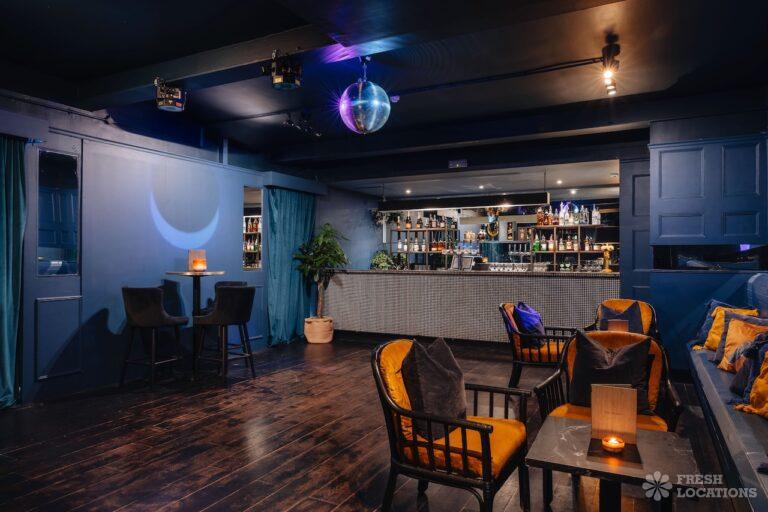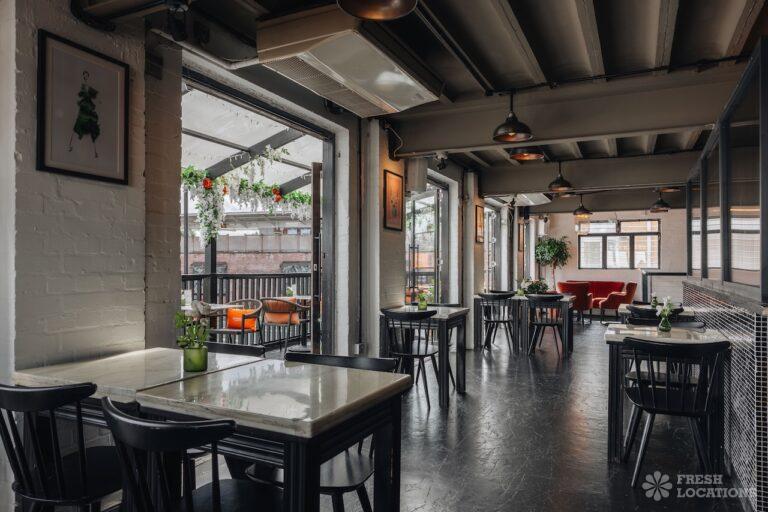 Bar, restaurant and coworking space in South West London. Featuring dining areas, a cinema space, a dance floor, decked terrace and balcony. Wood floors throughout. London Borough of Wandsworth.