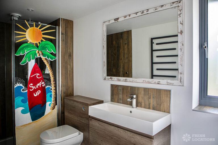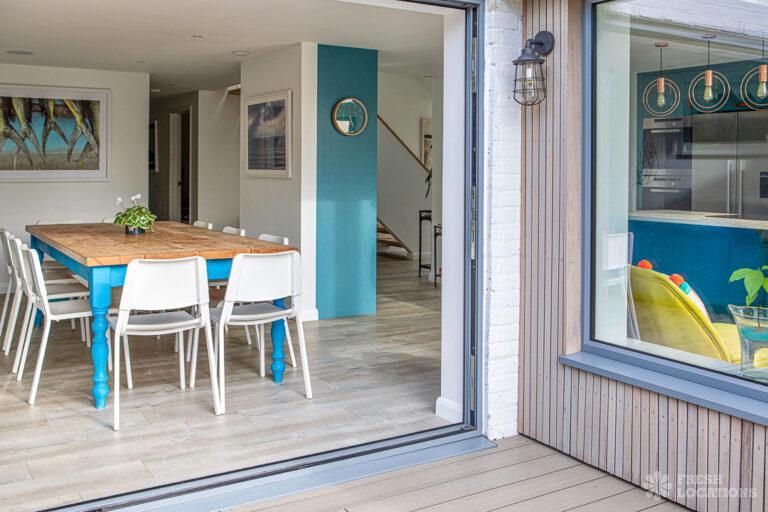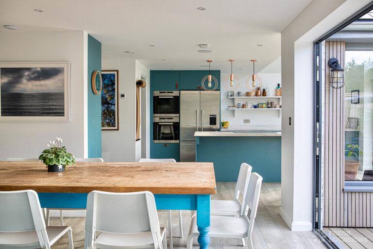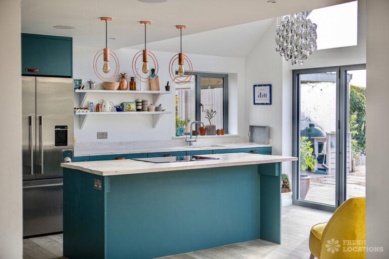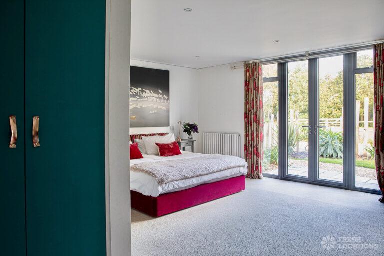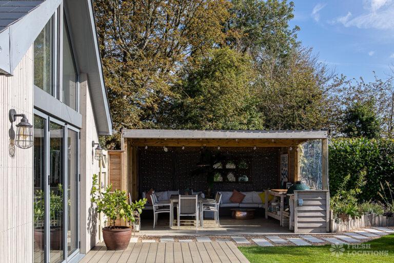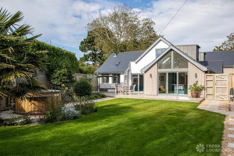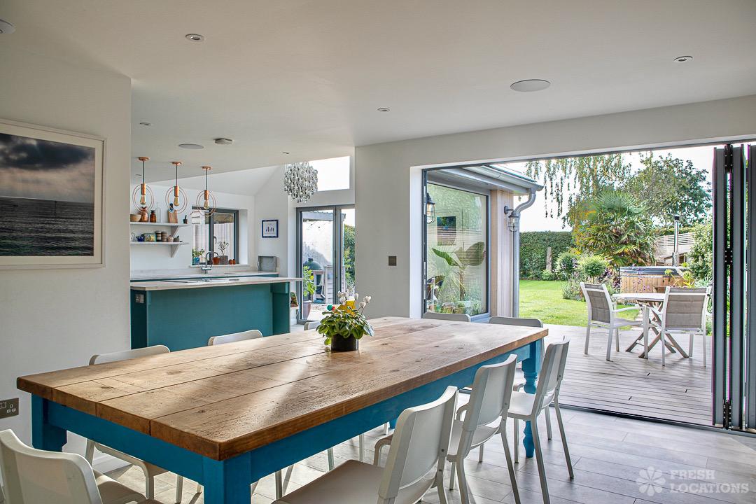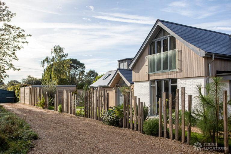 Wood Floors, Colourful Kitchen, Ensuite, Garden, Island Cooker, Island Kitchen, Large Bedroom, Staircase, Tiled Floor, Walk In ShowerModern house five minutes from West Wittering Beach. Bright shoot location featuring open plan island kitchen/diner, with bifold doors opening onto large garden with patio and outdoor dining area. Large driveway.
