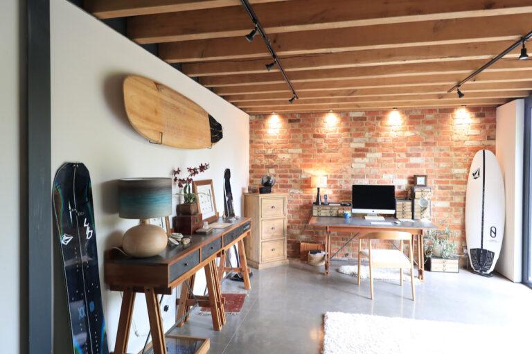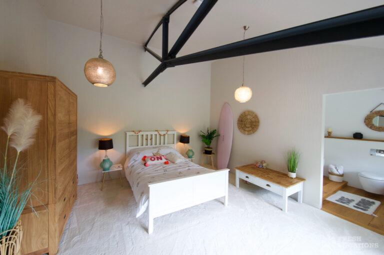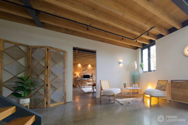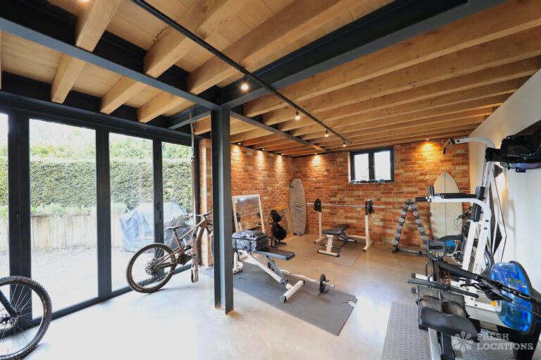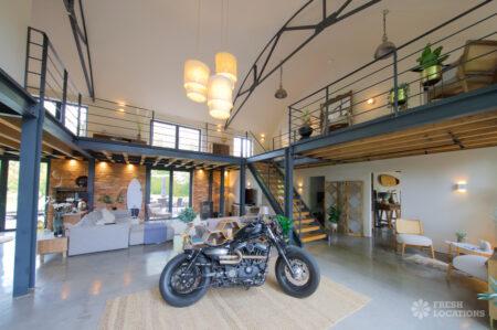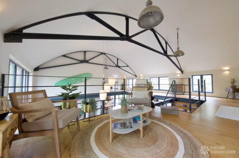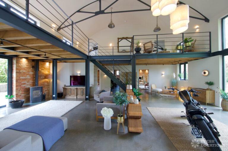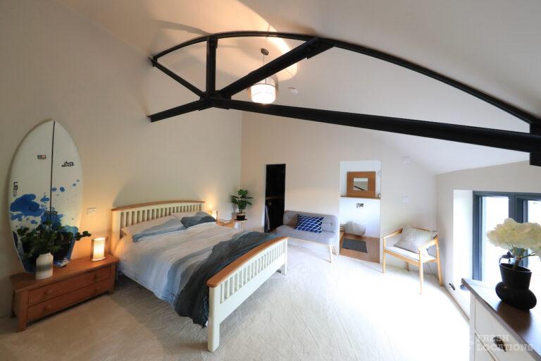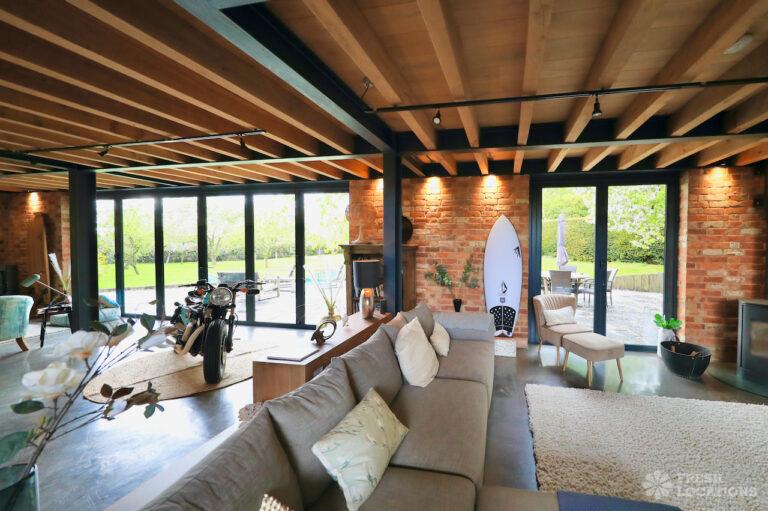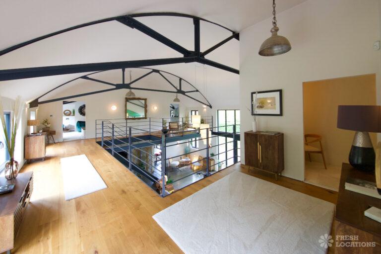 Ensuite, Exposed Beams, Exposed Brick, Home Gym, Home Office, Island Cooker, Island Kitchen, Large Bedroom, Large Kitchen, Multiple Bedrooms, Open Staircase, Polished Concrete, Staircase, Wood FloorsModern converted barn in Leicestershire. This spacious home features an open plan ground floor with high ceilings, exposed brick and a mezzanine. 1.5 hours drive from London. Shoot and stay possible.