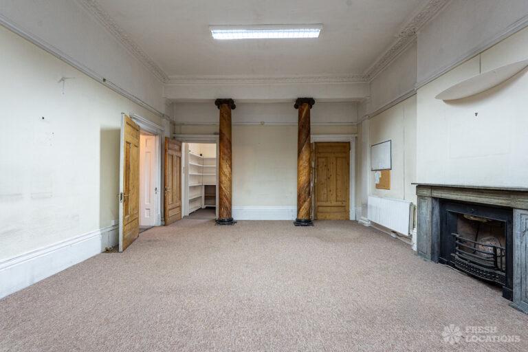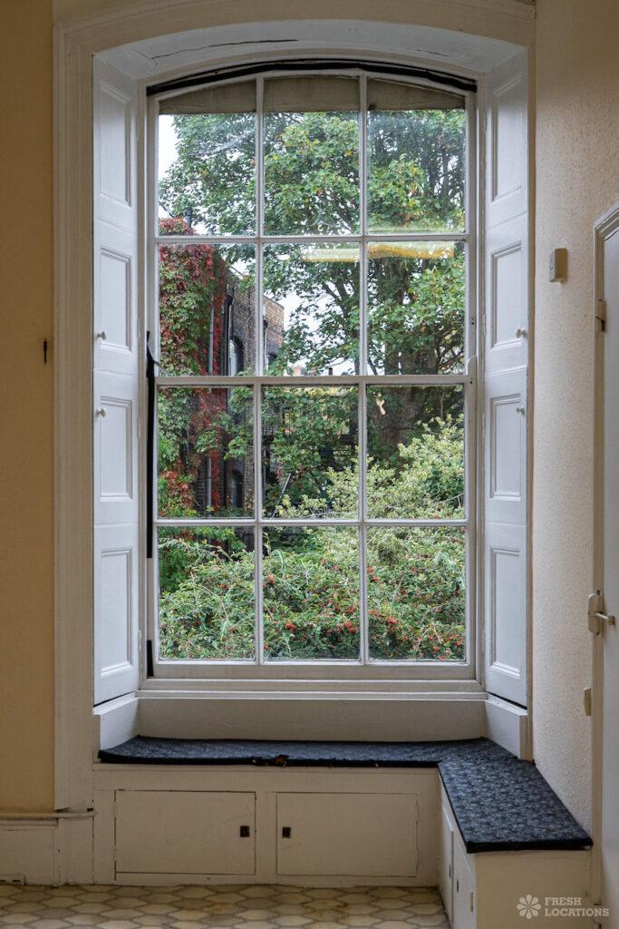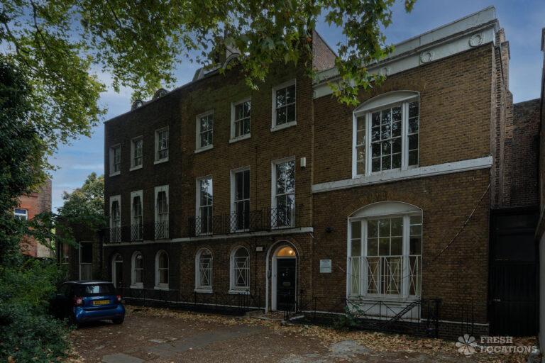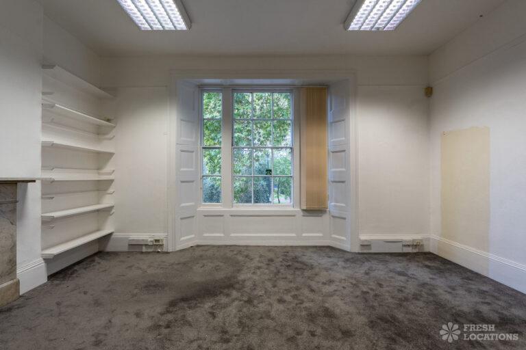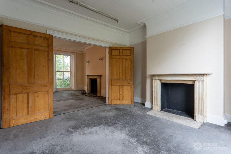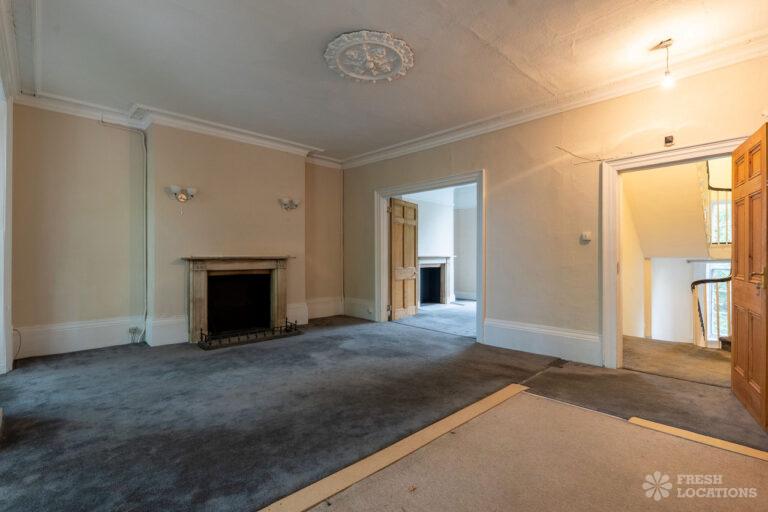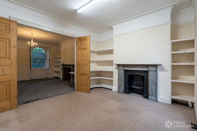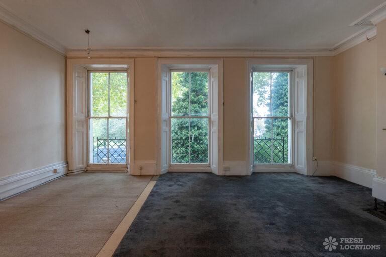 A stunning five-storey Georgian house shoot location in the London borough of Hackney, currently unoccupied and available to be painted or dressed as required. The property boasts impressive proportions on the ground floor, including a large drawing room with beautiful fireplaces and huge windows overlooking a green space. Additional features include front and back gardens, providing space for tents, scaffolding, or blackout setups. With its elegant period details and versatile interiors, this Georgian home offers a striking backdrop for a wide range of shoots. London Borough of Hackney.