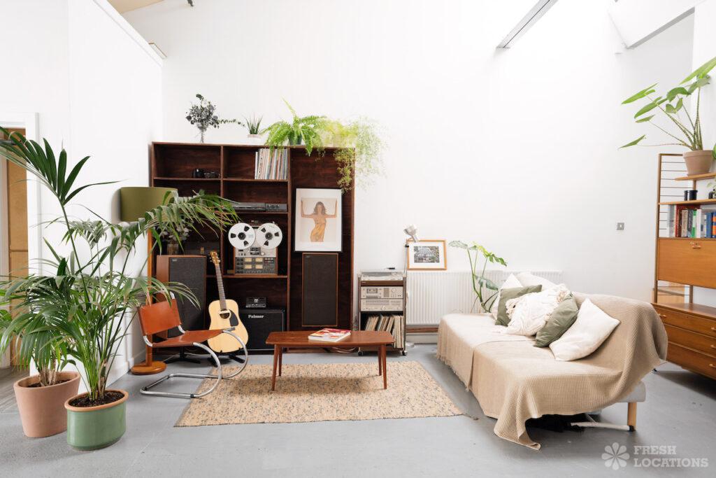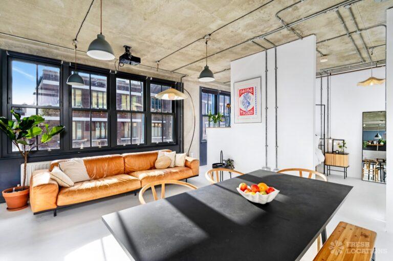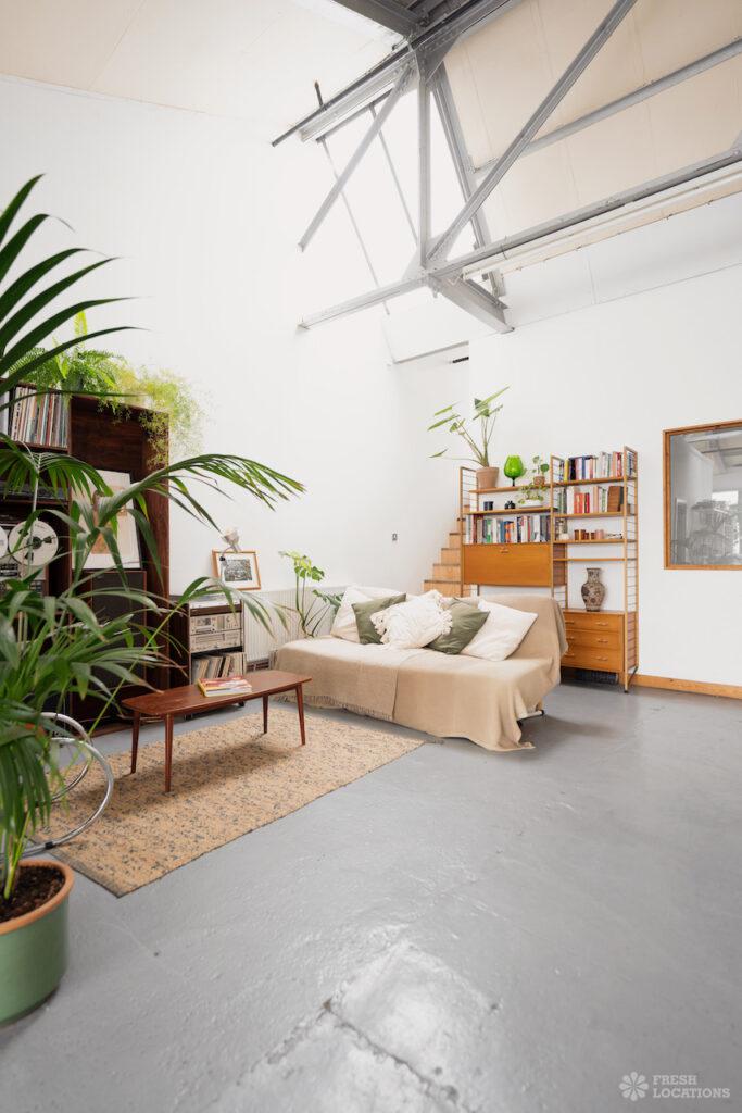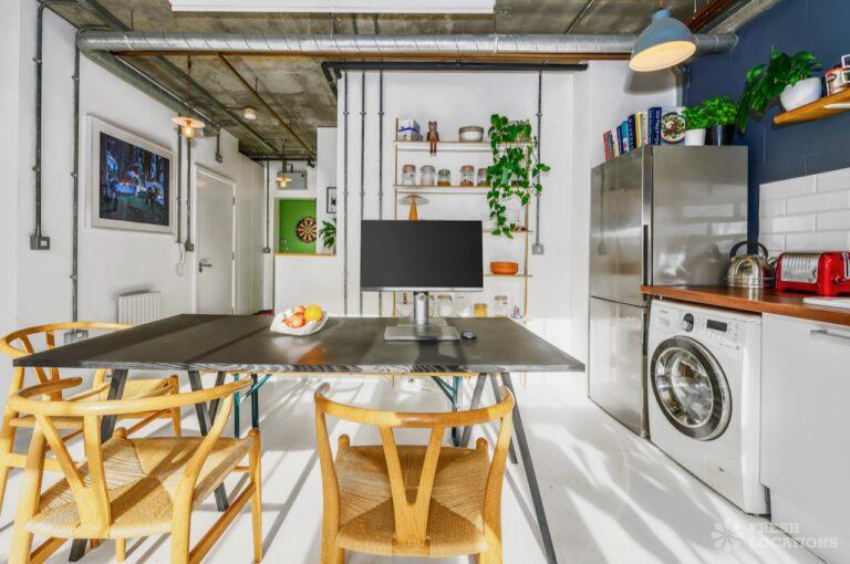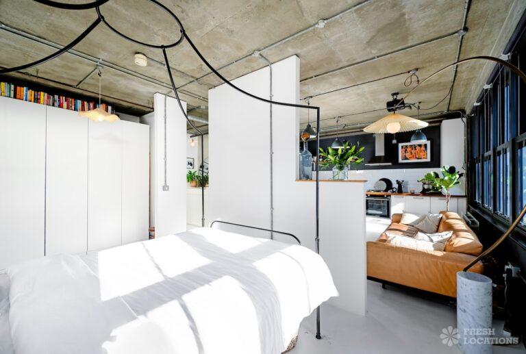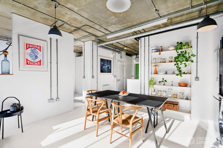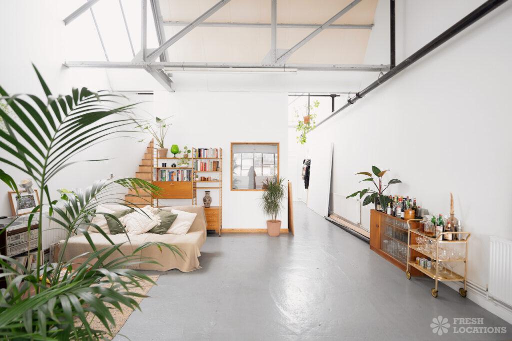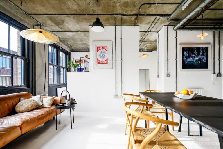 Open PlanAn urban open plan apartment shoot location in London. This property has a light and airy main living space with a kitchen and living area. Featuring hanging industrial style lighting. London Borough of Hackney.