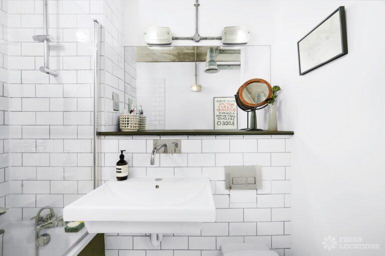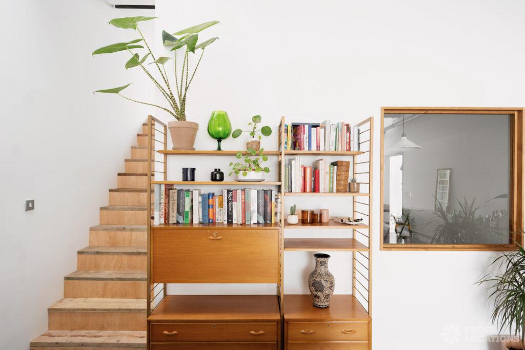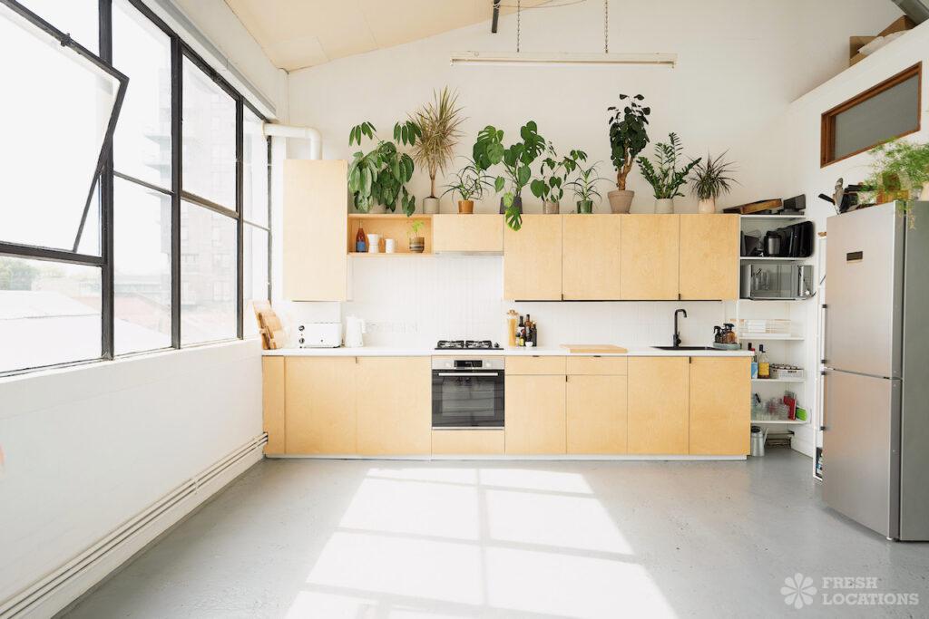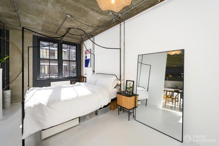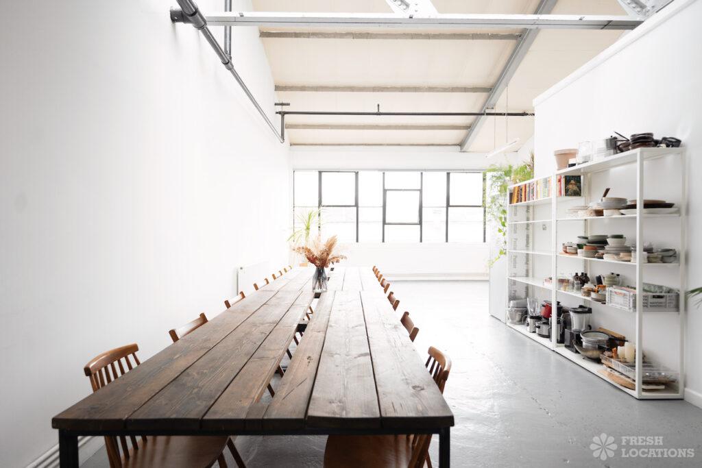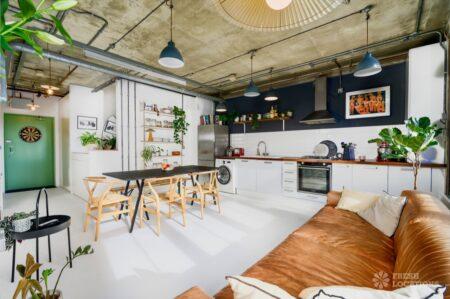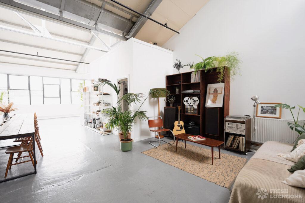 Open PlanAn urban open plan apartment shoot location in London. This property has a light and airy main living space with a kitchen and living area. Featuring hanging industrial style lighting. London Borough of Hackney.