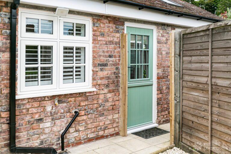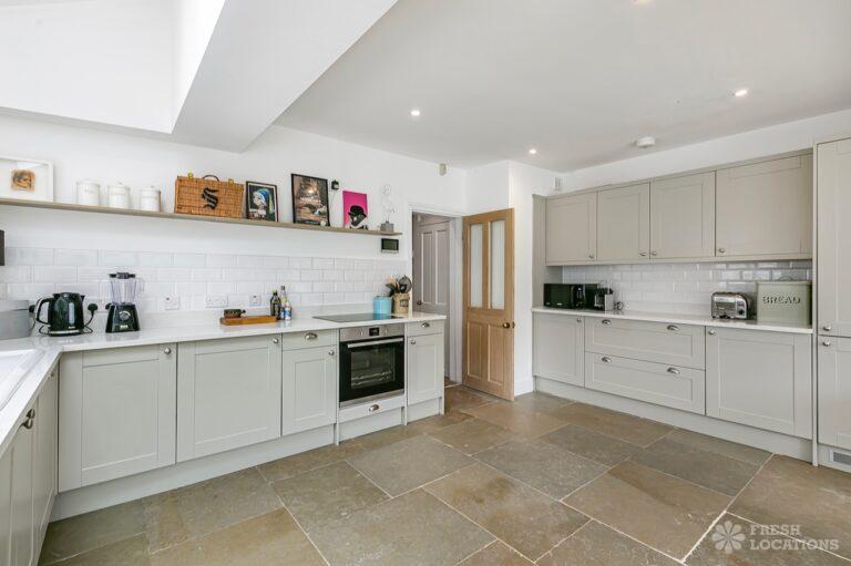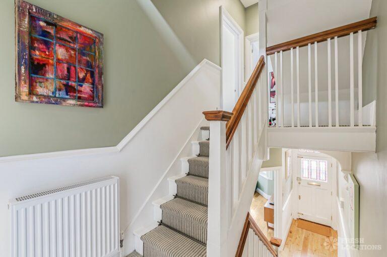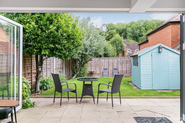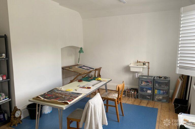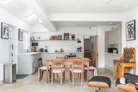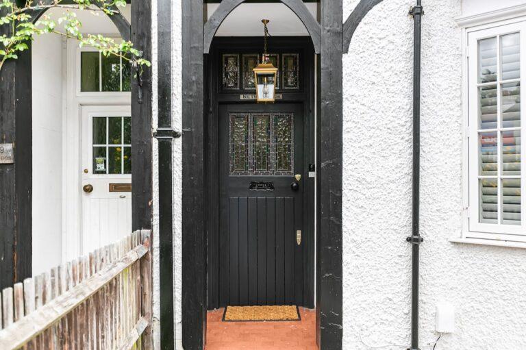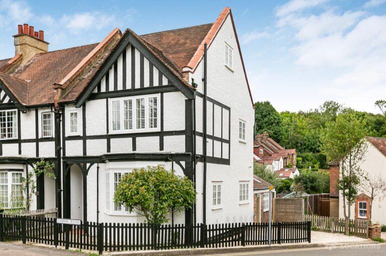 Tudor timber frame style, Edwardian end of terrace house in Hertfordshire. Set across three floors, it features a country style kitchen/dining area, a small art studio, four bedrooms and a garden with side access.