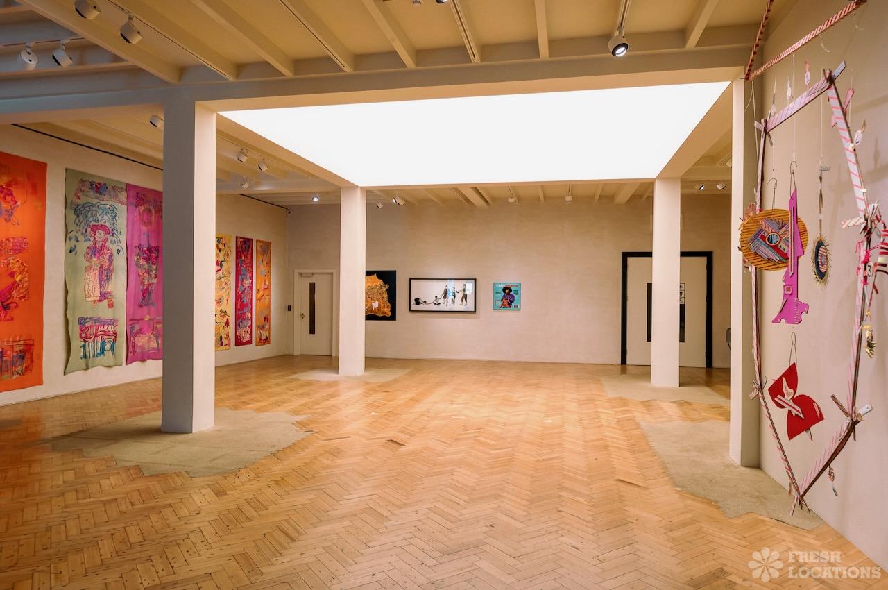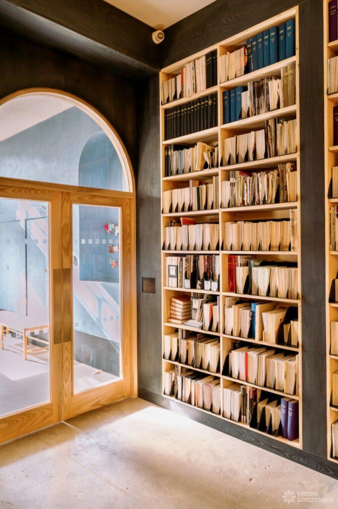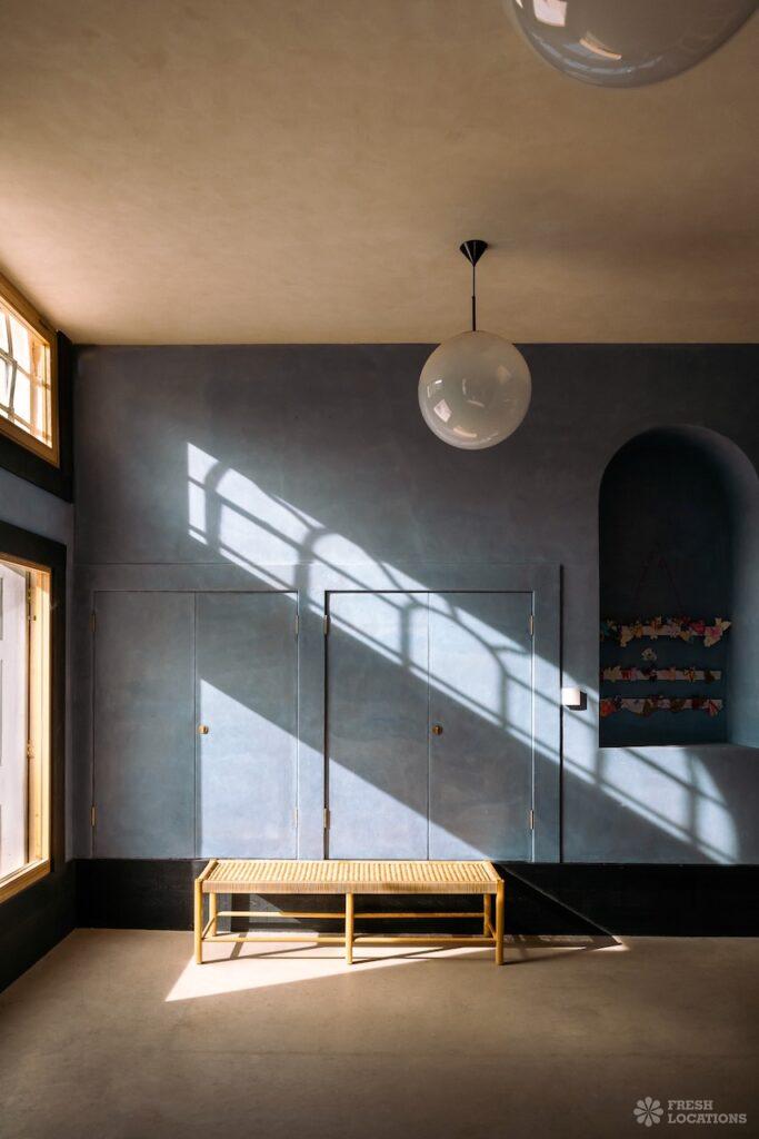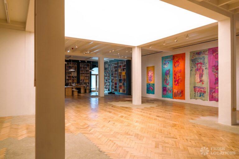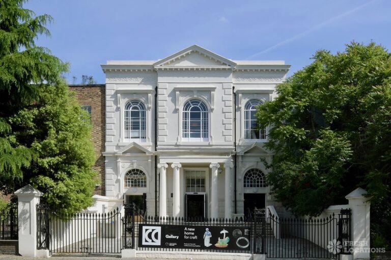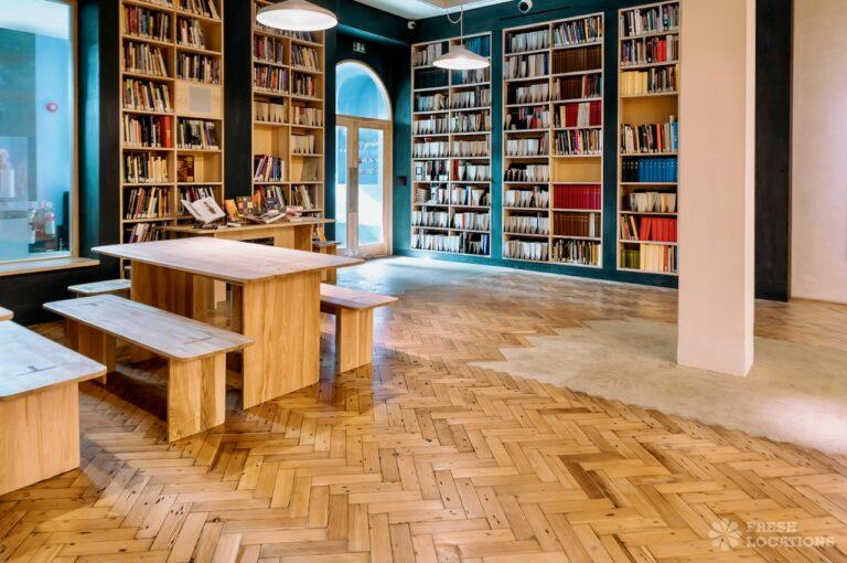 A Gallery shoot location in North London. The space has been recently restored from an 18th century chapel and includes a library space, wooden parquet flooring, pillars and a Georgian front. London Borough of Islington.