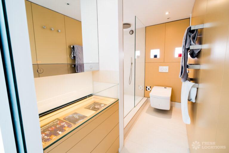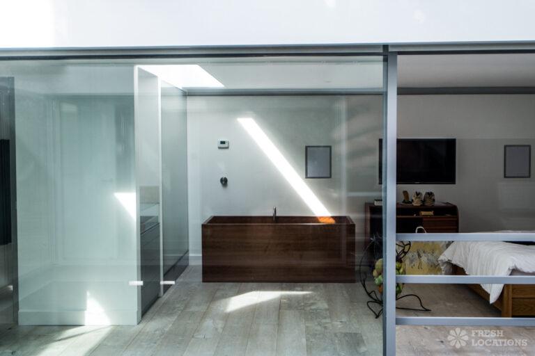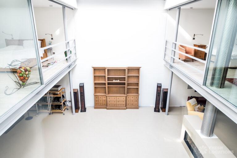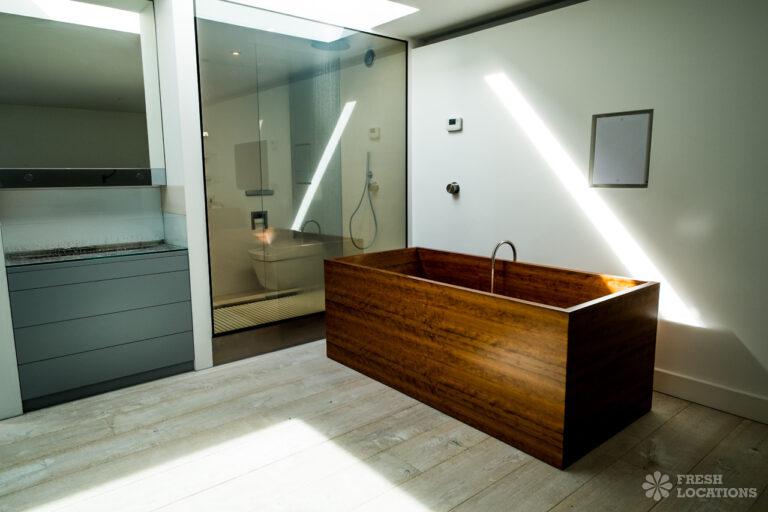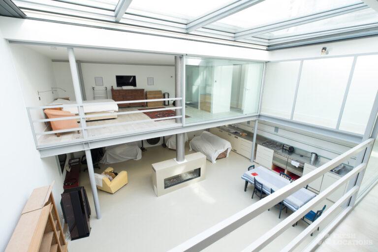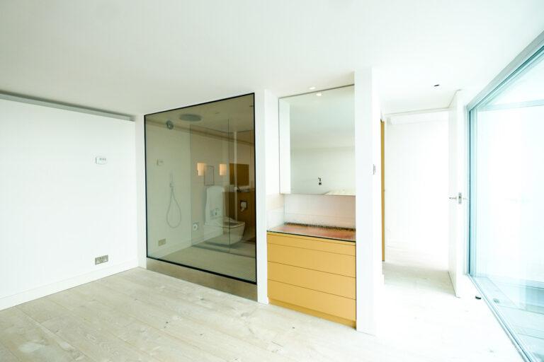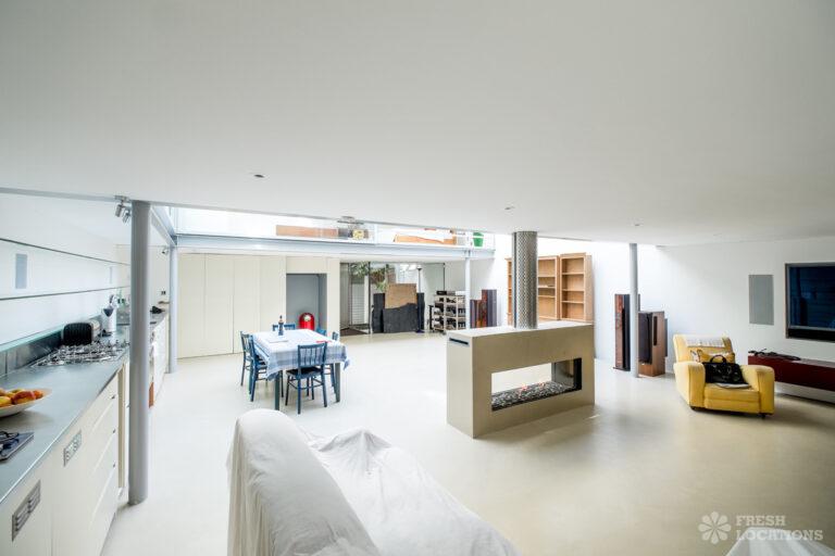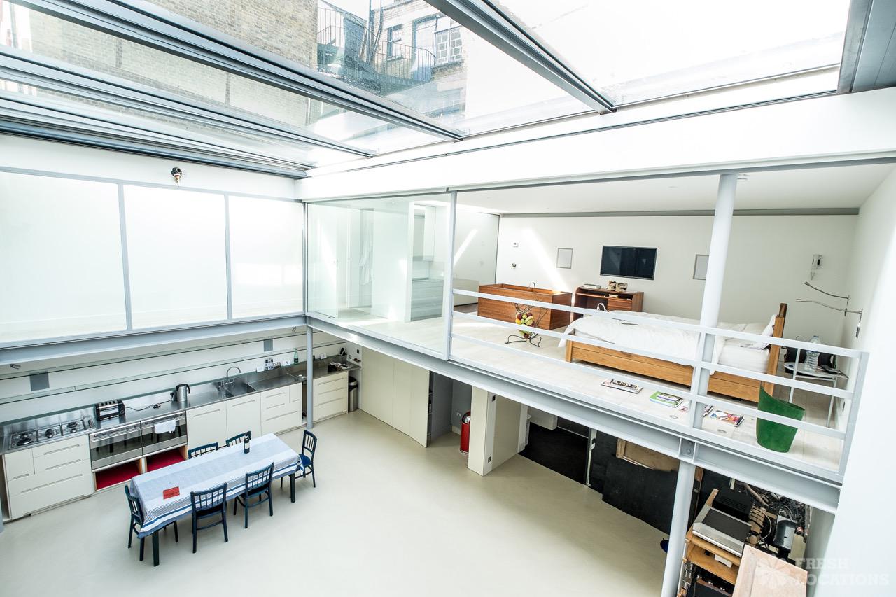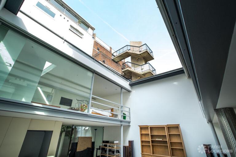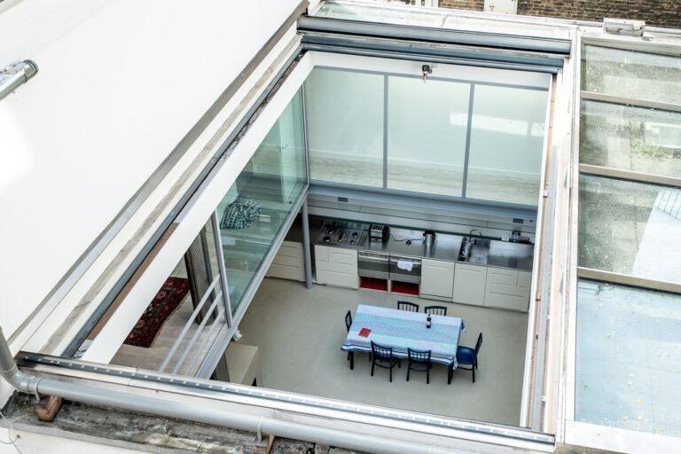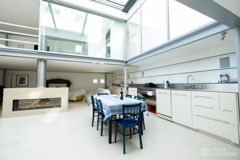 Wood Floors, Large Kitchen, Light Wood Floor, Open Plan, Skylights, Walk In Shower, White KitchenA unique and modern courtyard house with spacious open plan living. The property is designed around a double height atrium with a retractable glass roof, which gives wonderful natural light and opens the house to the sky in dry weather. Two main bedrooms are situated on the first floor and there is additional space on second floor with a hinged roof leading out to the roof terrace. London Borough of Islington.