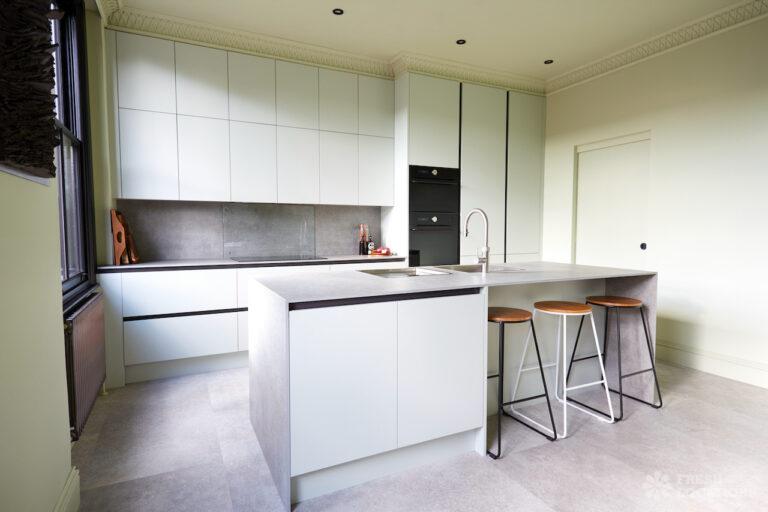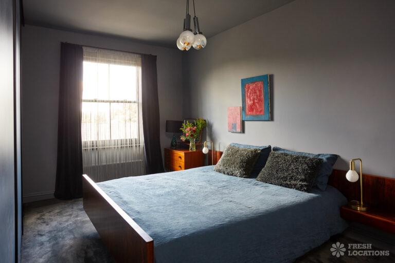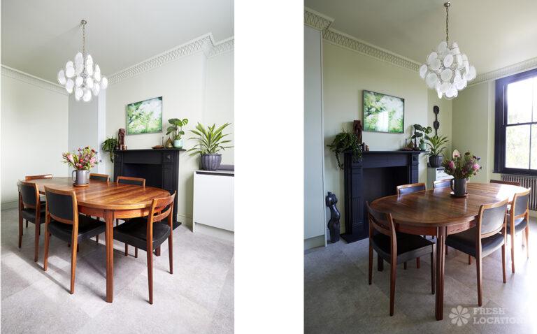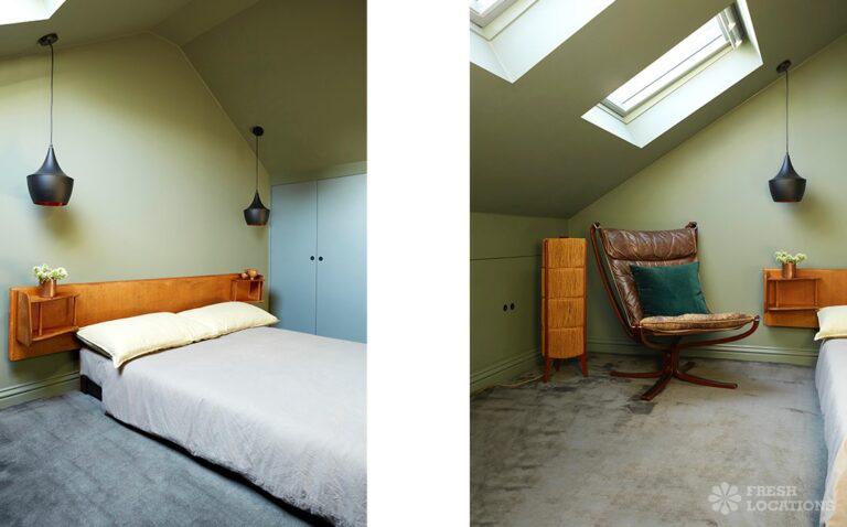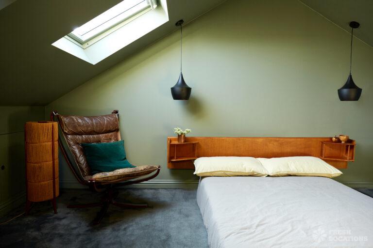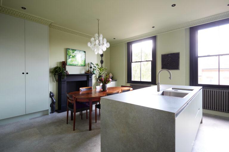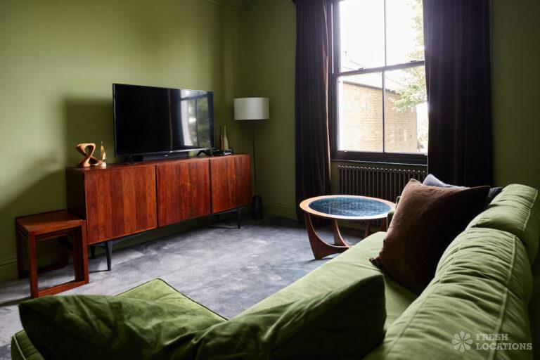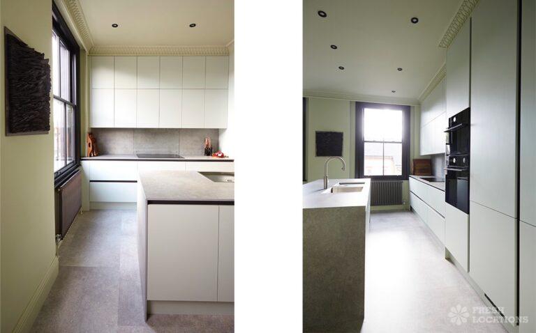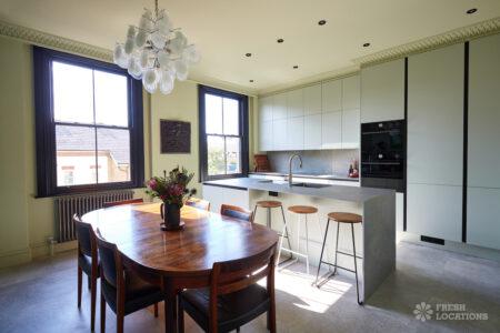 Tiled Floor, Ensuite, Fireplace, Island Kitchen, Large Bathroom, Large Bedroom, Large Kitchen, Open Plan, Staircase, Walk In ShowerThree-storey apartment shoot location in East London. Modern interiors with a light open plan kitchen/dining room, multiple bedrooms including a master bedroom and ensuite. London Borough of Hackney.