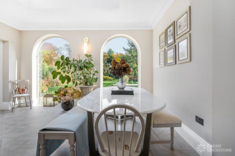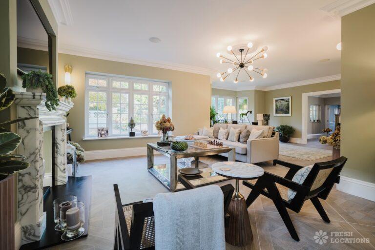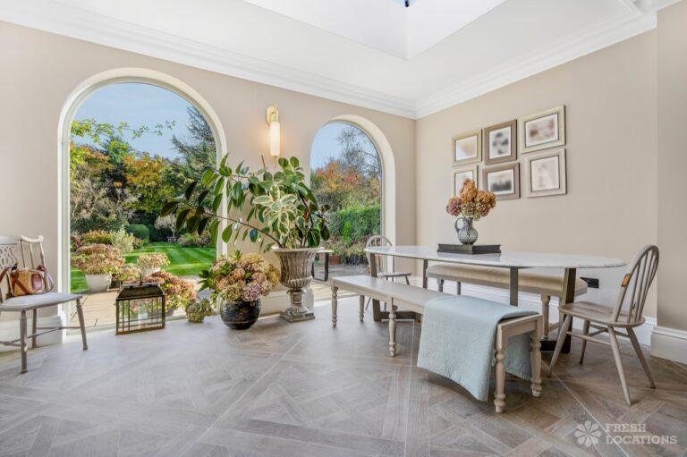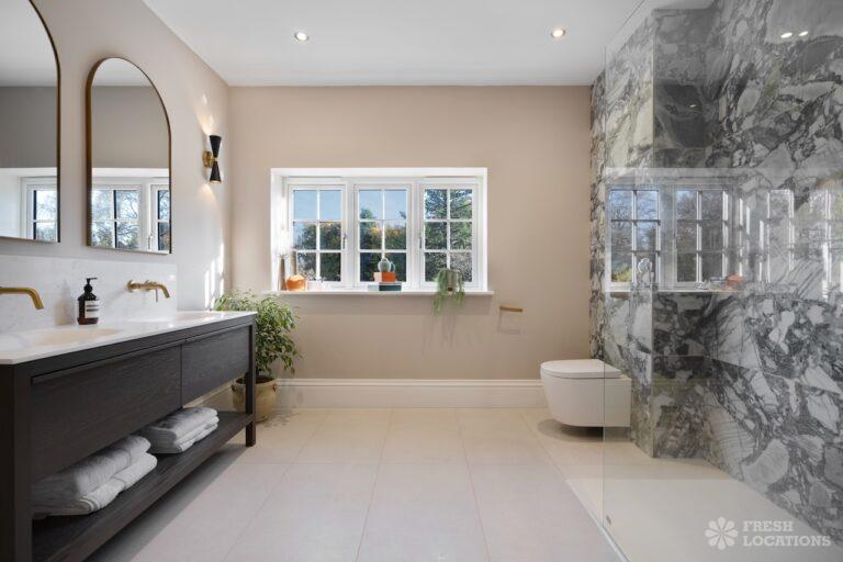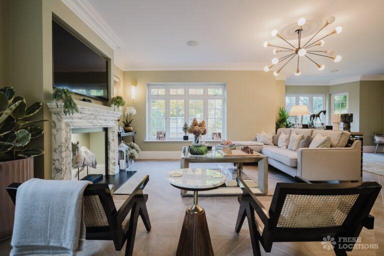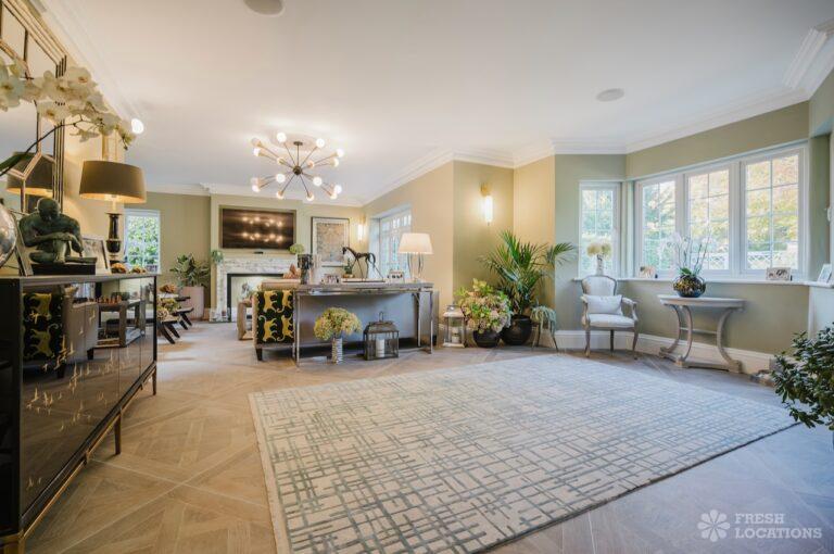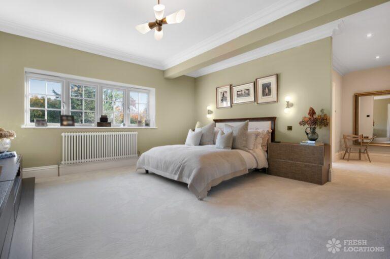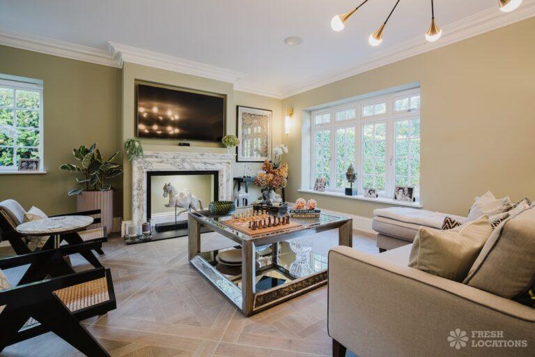 A Buckinghamshire shoot location, offering a blend of modern elegance and timeless charm. The spacious living area features arched windows that flood the space with natural light, highlighting the luxurious neutral decor and cozy fireplace. The bathroom has a sophisticated design with marble accents, gold fixtures, and large windows for soft daylight. The serene bedroom combines soft green tones, plush carpeting, and classic furnishings, creating a peaceful atmosphere. With its beautifully styled interiors and abundant natural light, this location is ideal for capturing refined, versatile visuals.