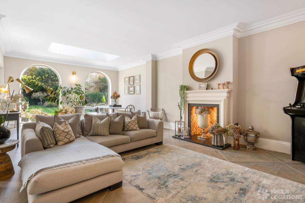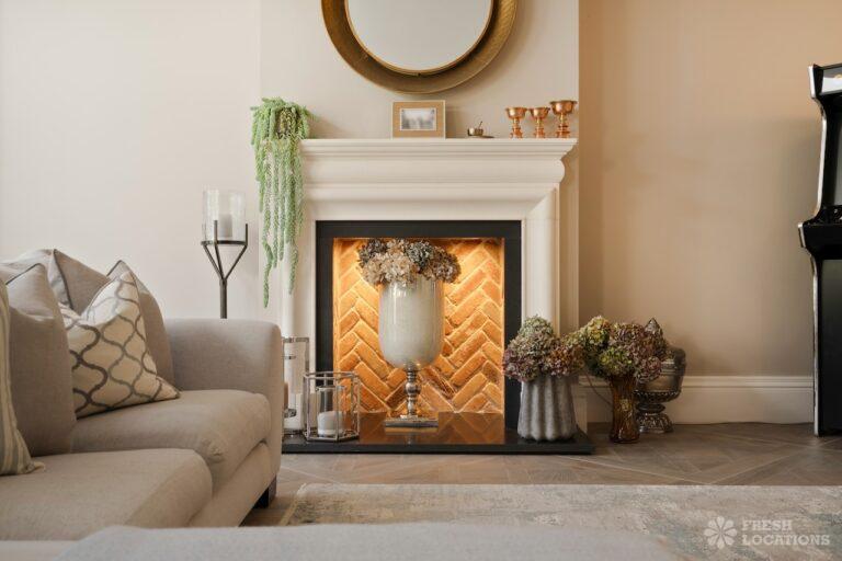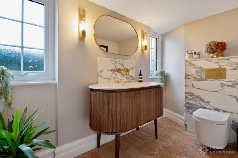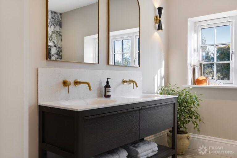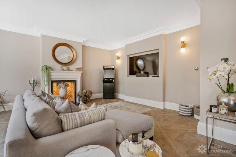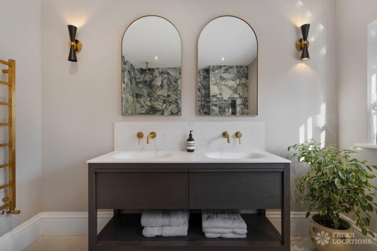 A Buckinghamshire shoot location, offering a blend of modern elegance and timeless charm. The spacious living area features arched windows that flood the space with natural light, highlighting the luxurious neutral decor and cozy fireplace. The bathroom has a sophisticated design with marble accents, gold fixtures, and large windows for soft daylight. The serene bedroom combines soft green tones, plush carpeting, and classic furnishings, creating a peaceful atmosphere. With its beautifully styled interiors and abundant natural light, this location is ideal for capturing refined, versatile visuals.