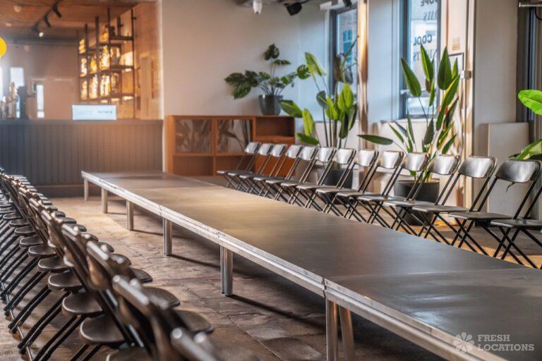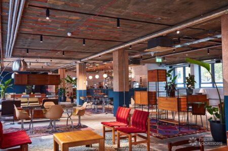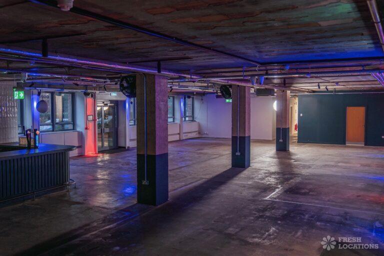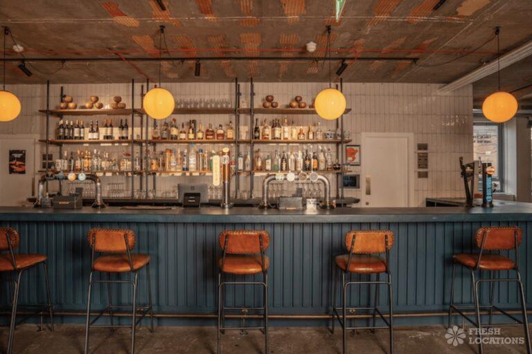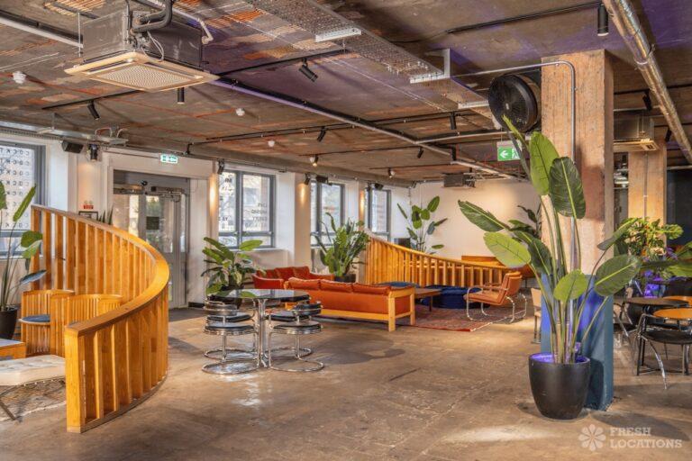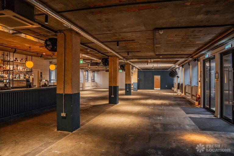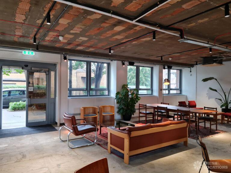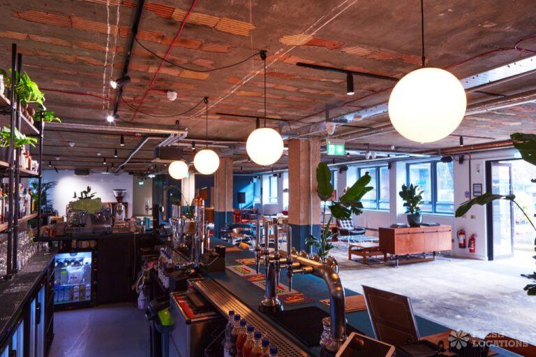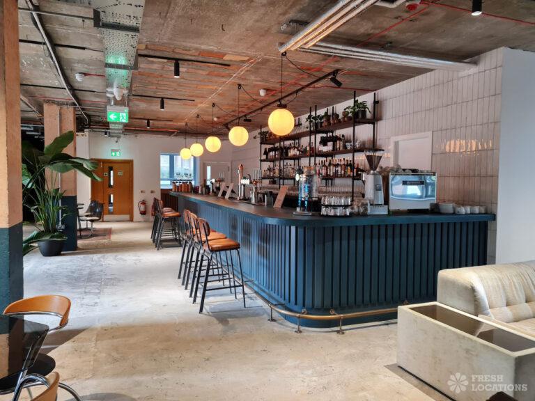Bar and workspace shoot location in Barking. This large, open plan space features a modern bar, plenty of seating and workspace as well as concrete floors throughout. Furniture can be removed. London Borough of Barking.