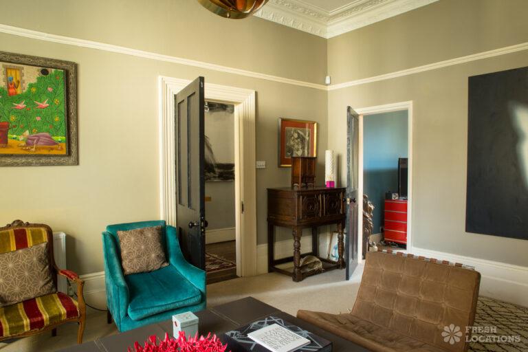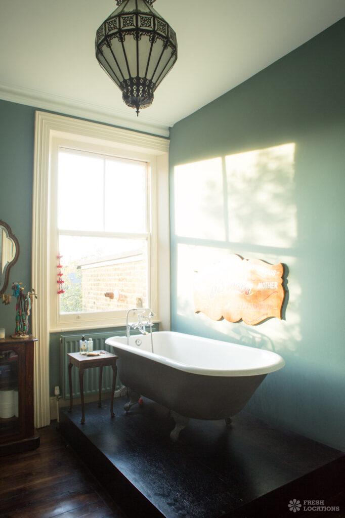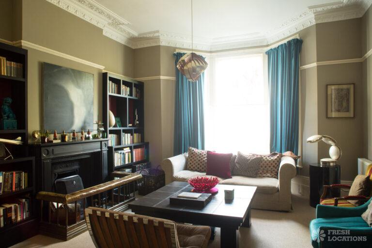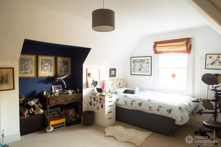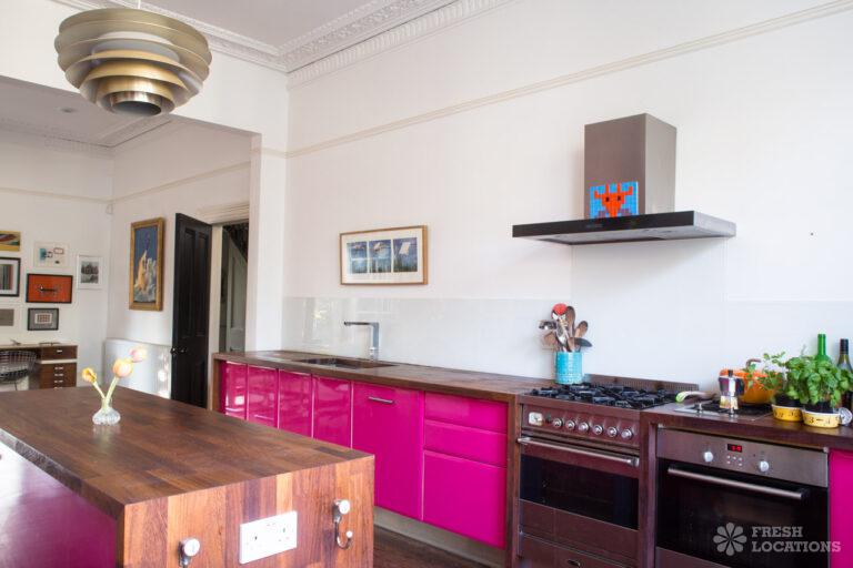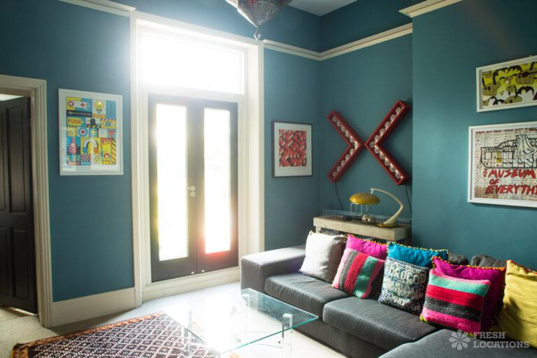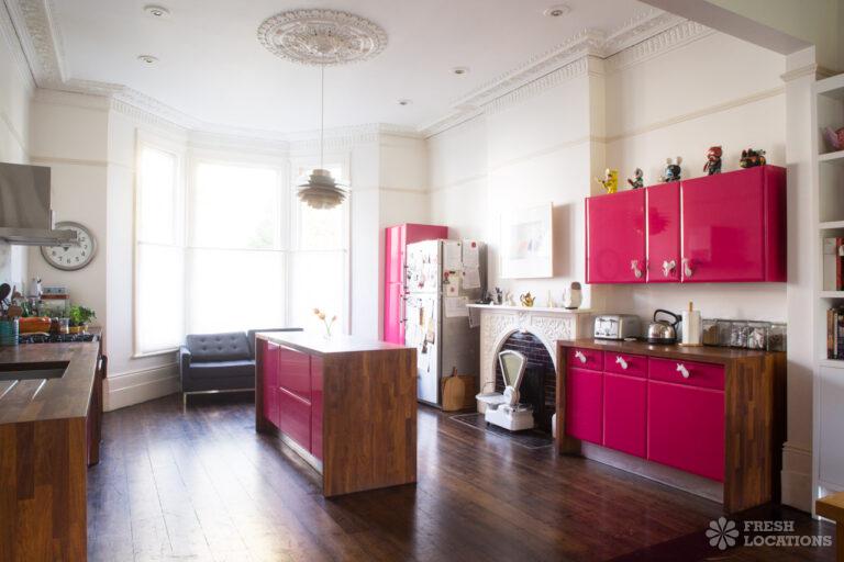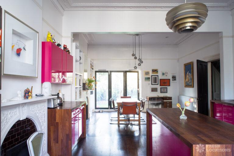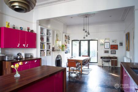 Wood Floors, Bay Window, Dark Wood Floor, Ensuite, Fireplace, Garden, Gas Hob, Island Kitchen, Large Bathroom, Large Bedroom, Large Kitchen, Open Plan, StaircaseLarge West London location house. Colourful, open plan kitchen and diner, home office, childrens bedrooms. Great for interior shoots and commercials. Stylish and colourful decor, large bathrooms and a large garden with play area. London Borough of Ealing.