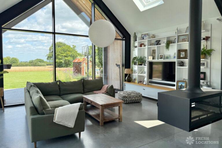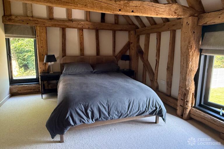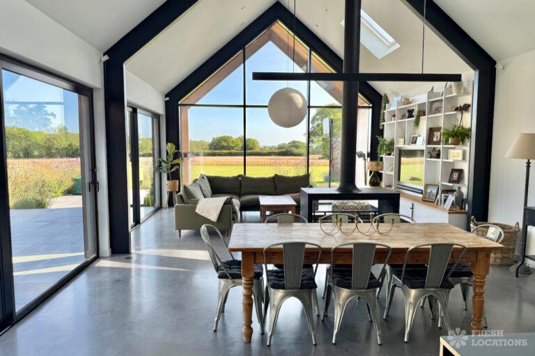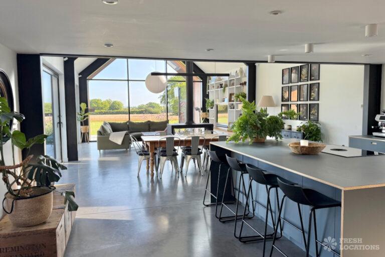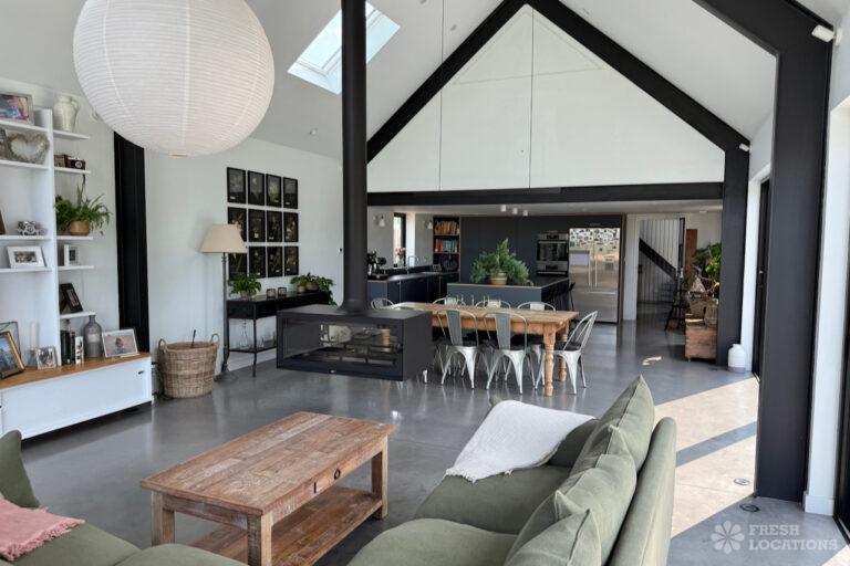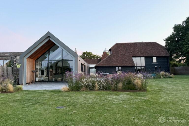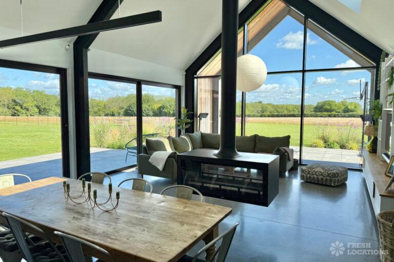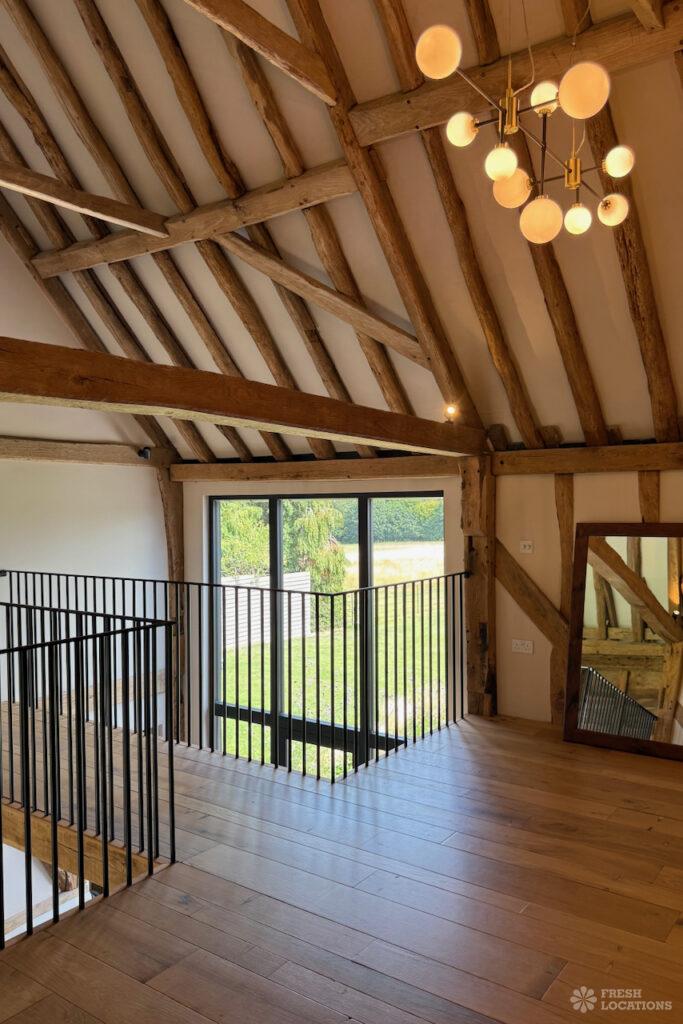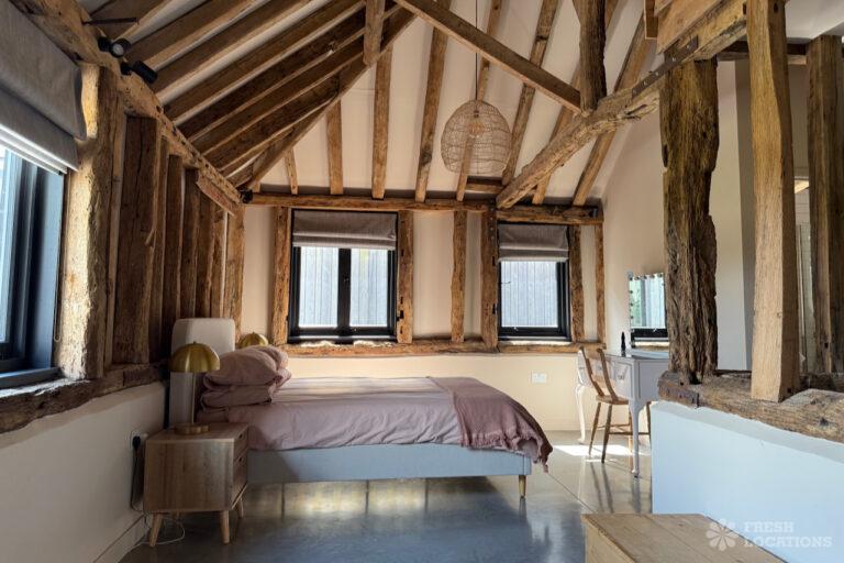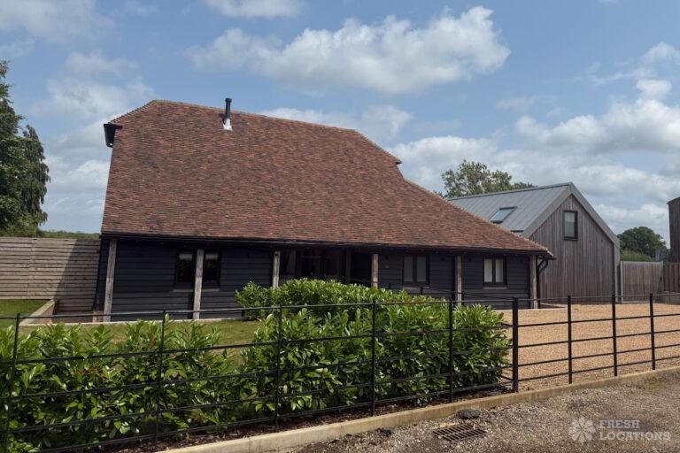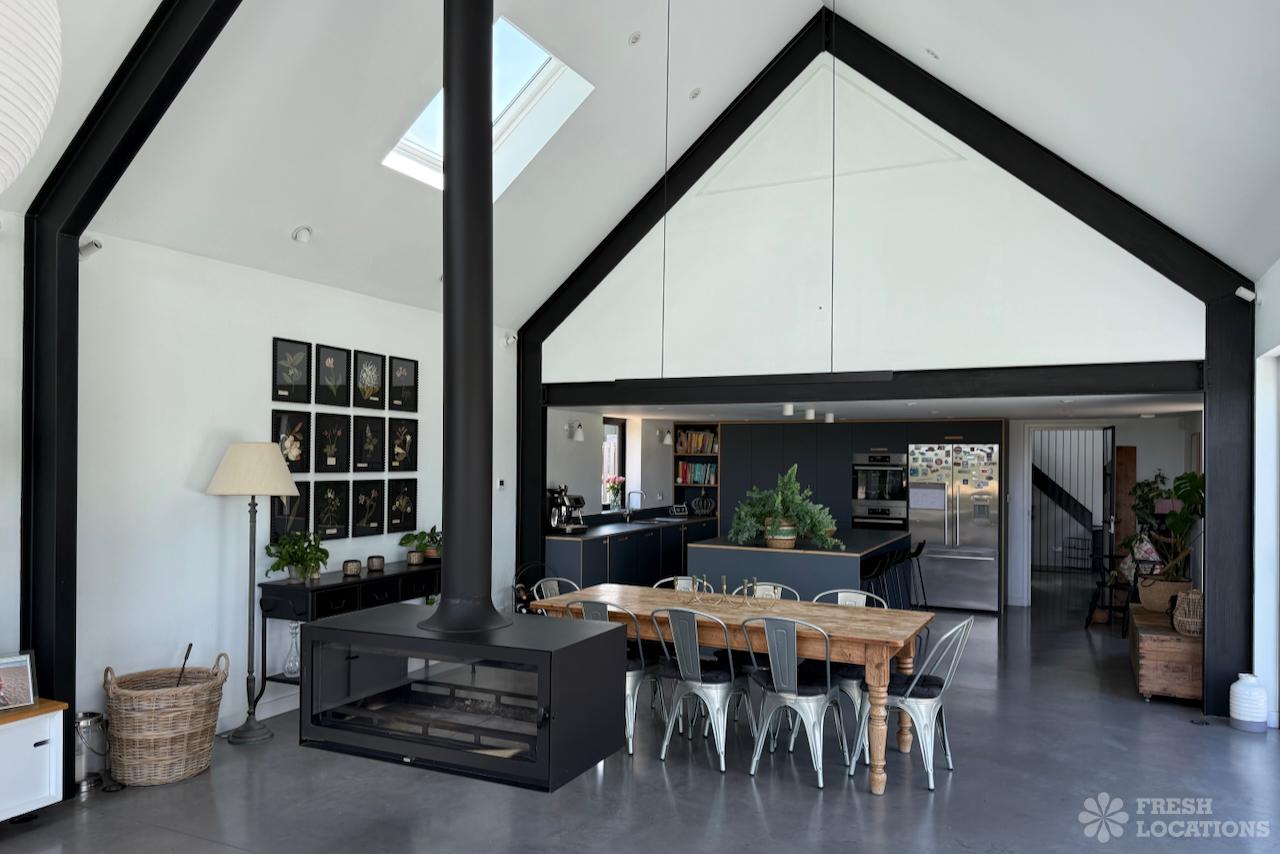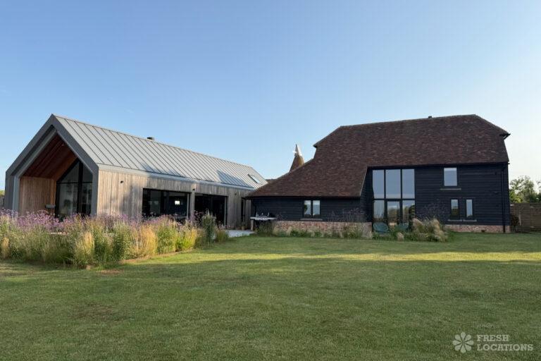 Driveway, Exposed Beams, Fireplace, Full Height Windows, Garden, Island Cooker, Island Kitchen, Large Driveway, Large Kitchen, Multiple Bathrooms, Multiple Bedrooms, Multiple Living Rooms, Open Plan, Polished Concrete, Staircase, Walk In ShowerA beautifully restored 17th-century barn shoot location in Kent, originally an apple store, now converted into a unique modern home. The property blends historic timber beams and original features with striking architectural additions in timber and steel. It features four bedrooms, five bathrooms, and expansive open-plan living spaces with vaulted ceilings, a suspended wood-burning stove, and polished concrete floors. Floor-to-ceiling glass, mezzanine walkways, and sliding doors frame sweeping countryside views, making this an atmospheric and versatile backdrop for shoots.