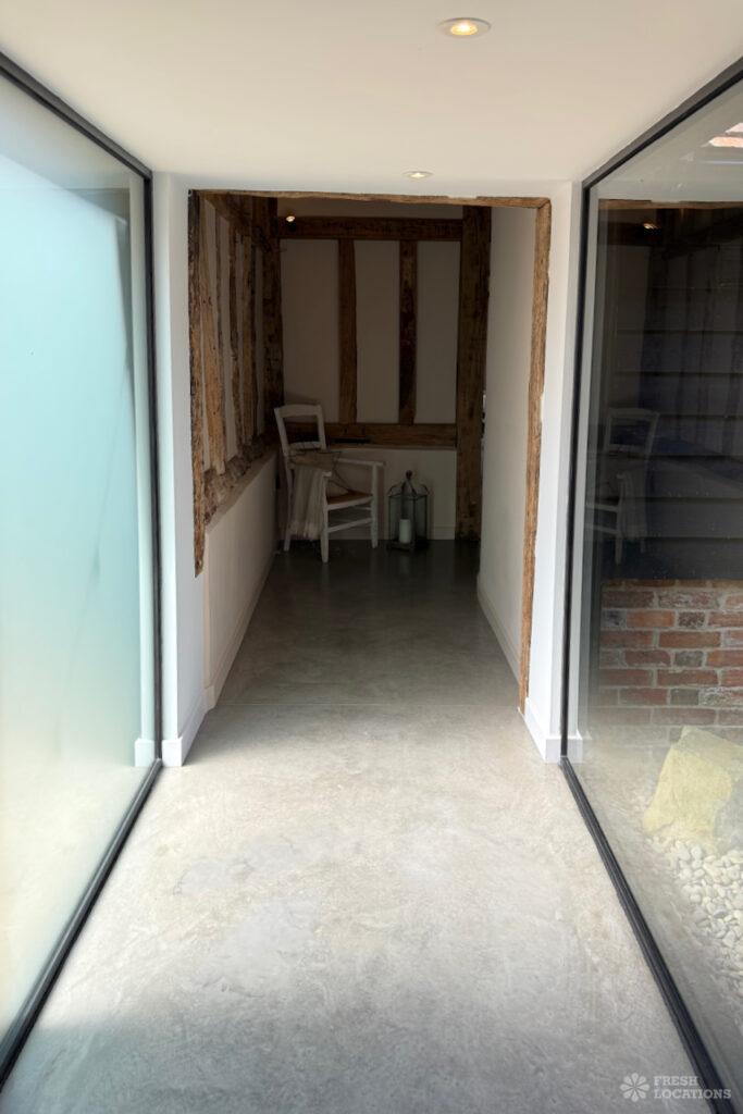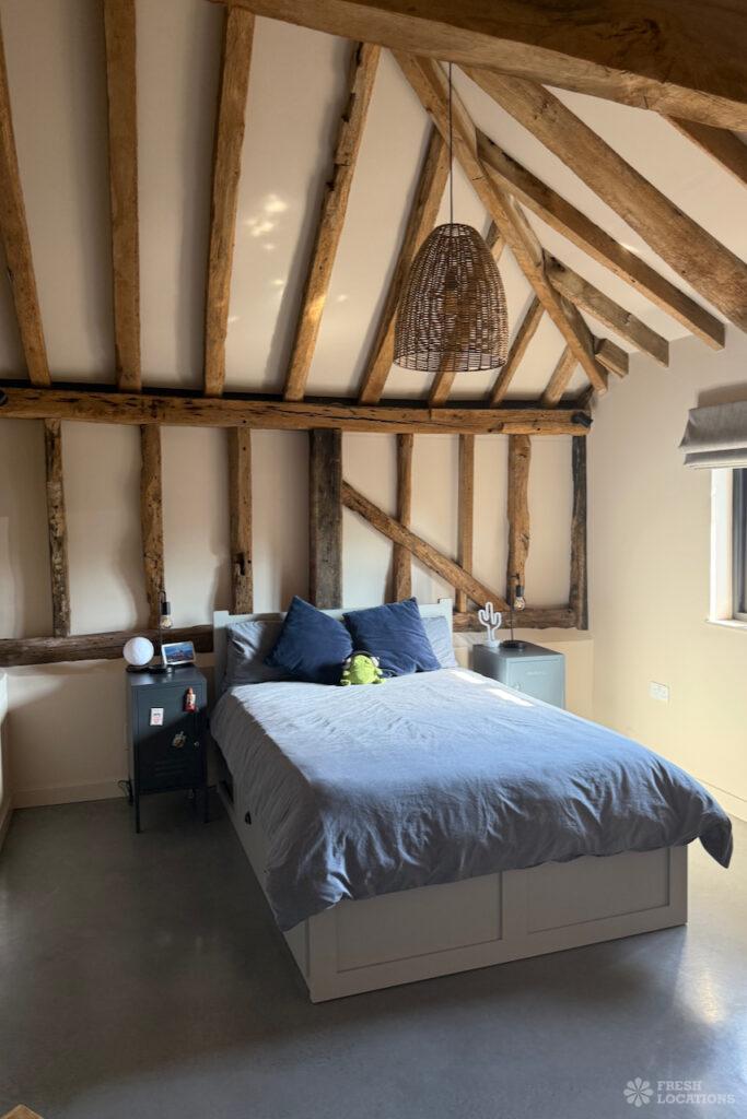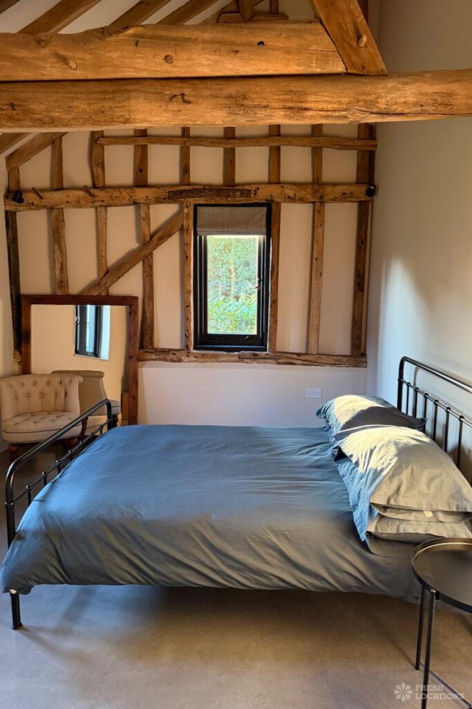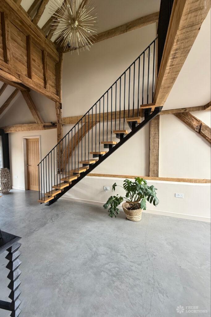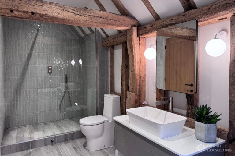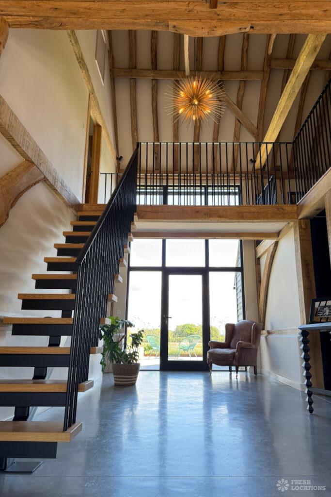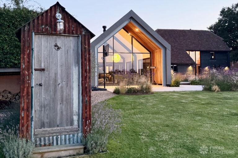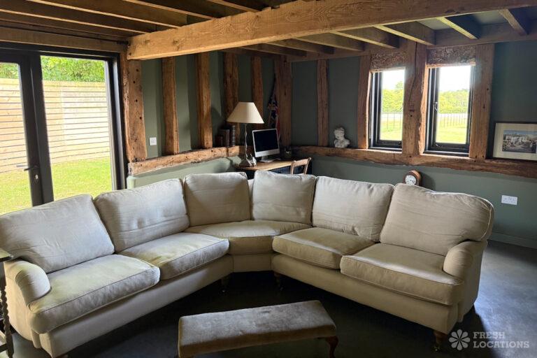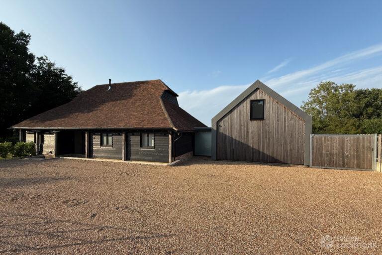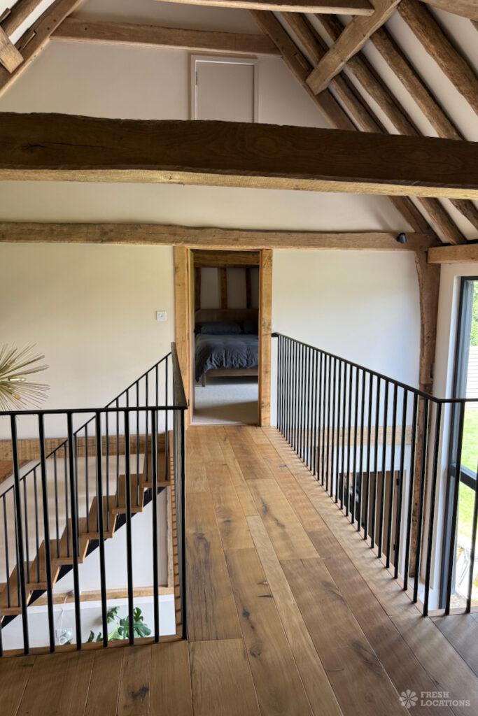 Driveway, Exposed Beams, Fireplace, Full Height Windows, Garden, Island Cooker, Island Kitchen, Large Driveway, Large Kitchen, Multiple Bathrooms, Multiple Bedrooms, Multiple Living Rooms, Open Plan, Polished Concrete, Staircase, Walk In ShowerA beautifully restored 17th-century barn shoot location in Kent, originally an apple store, now converted into a unique modern home. The property blends historic timber beams and original features with striking architectural additions in timber and steel. It features four bedrooms, five bathrooms, and expansive open-plan living spaces with vaulted ceilings, a suspended wood-burning stove, and polished concrete floors. Floor-to-ceiling glass, mezzanine walkways, and sliding doors frame sweeping countryside views, making this an atmospheric and versatile backdrop for shoots.