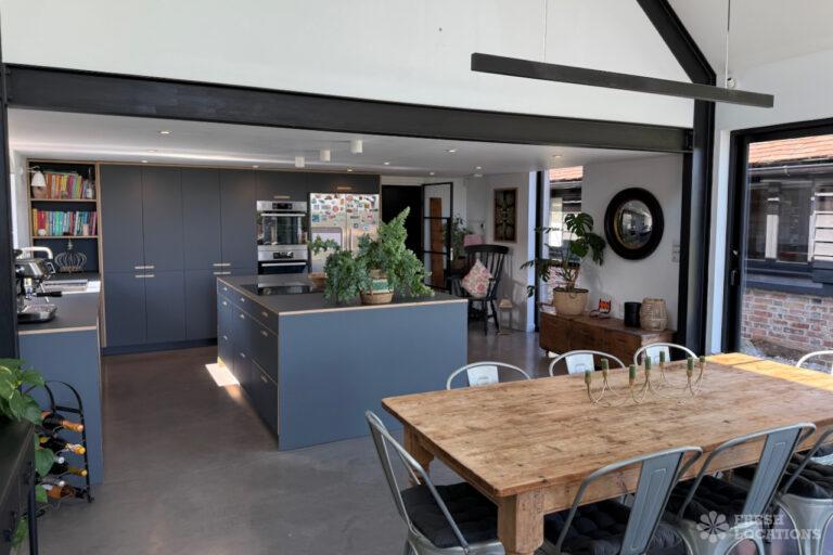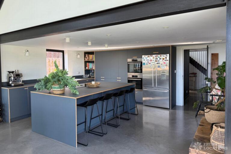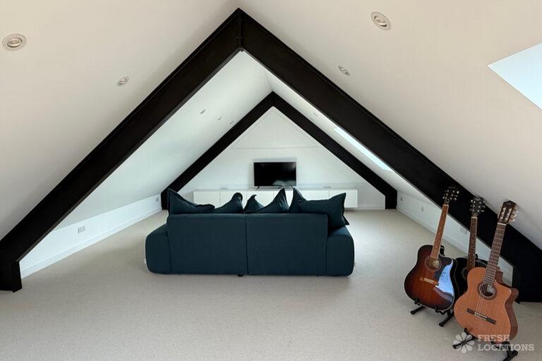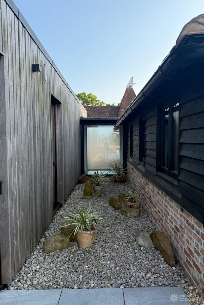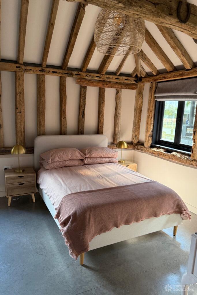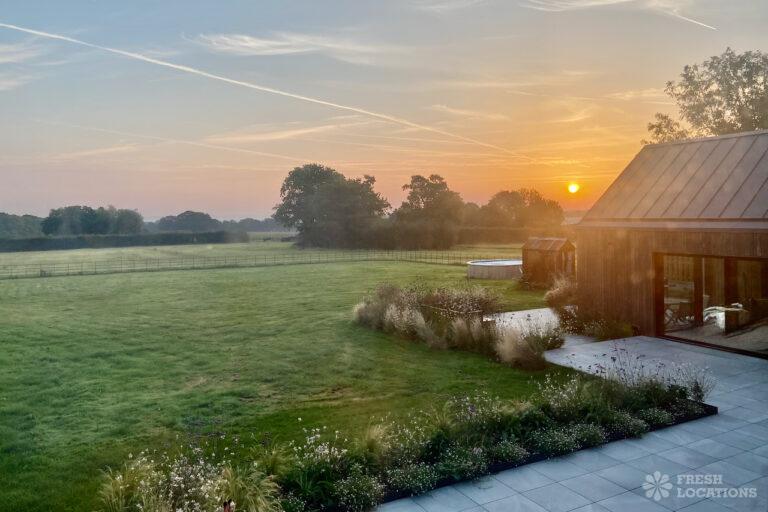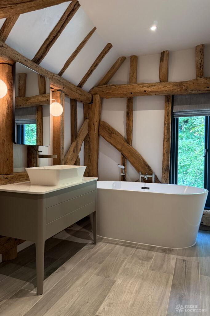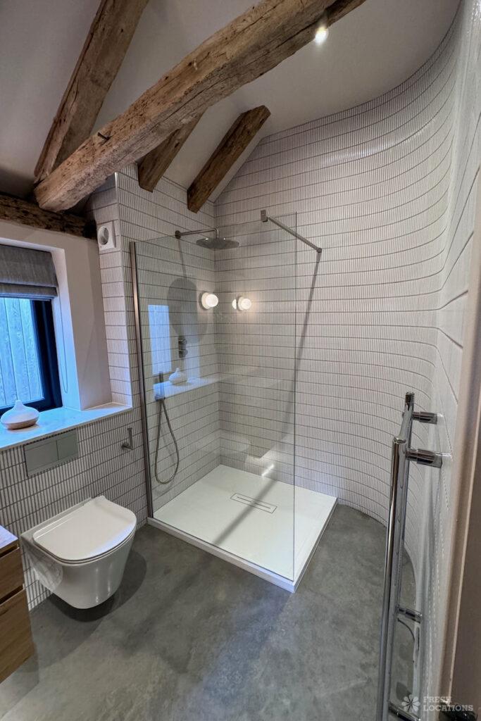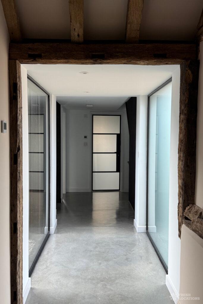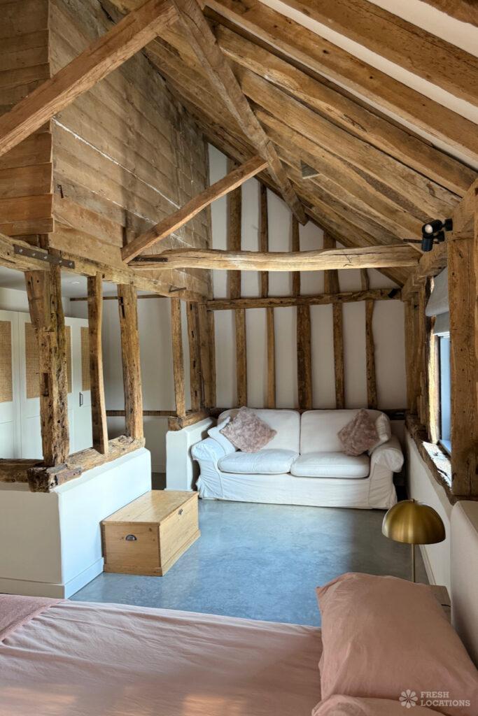 Driveway, Exposed Beams, Fireplace, Full Height Windows, Garden, Island Cooker, Island Kitchen, Large Driveway, Large Kitchen, Multiple Bathrooms, Multiple Bedrooms, Multiple Living Rooms, Open Plan, Polished Concrete, Staircase, Walk In ShowerA beautifully restored 17th-century barn shoot location in Kent, originally an apple store, now converted into a unique modern home. The property blends historic timber beams and original features with striking architectural additions in timber and steel. It features four bedrooms, five bathrooms, and expansive open-plan living spaces with vaulted ceilings, a suspended wood-burning stove, and polished concrete floors. Floor-to-ceiling glass, mezzanine walkways, and sliding doors frame sweeping countryside views, making this an atmospheric and versatile backdrop for shoots.