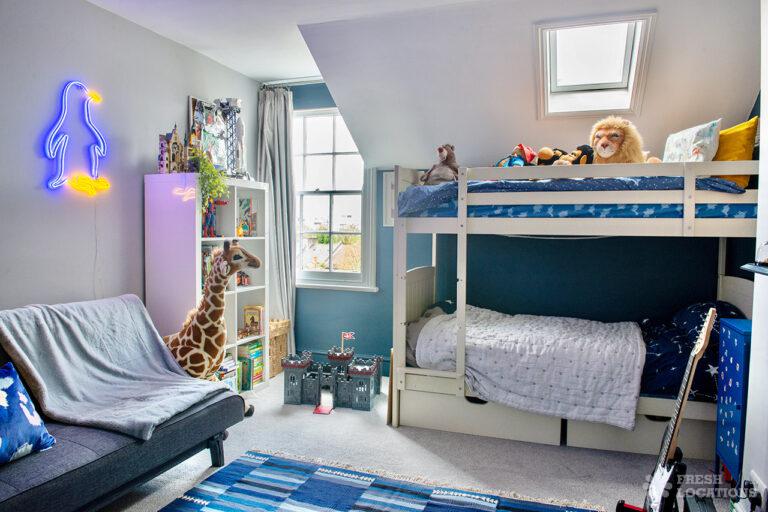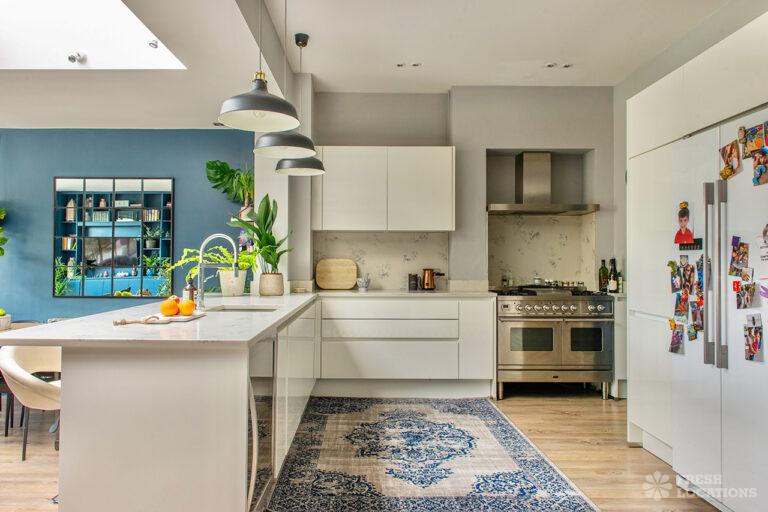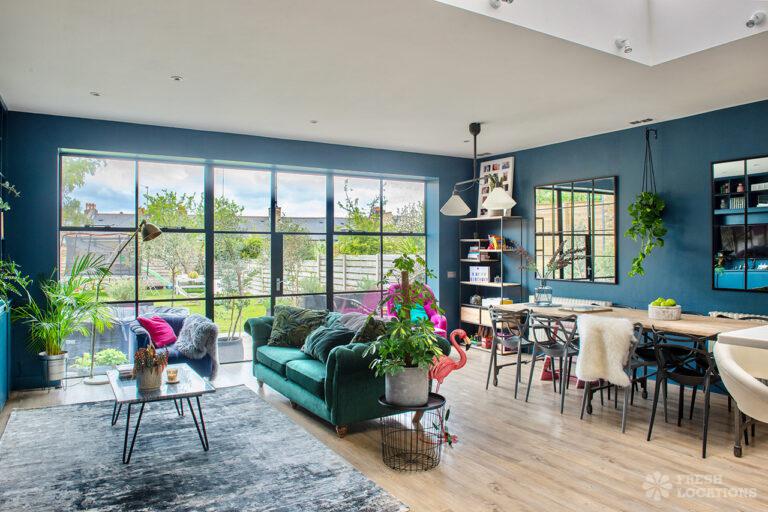 Bright and modern family home shoot location in South East London. Featuring a kitchen diner and living room with crittal doors leading to a large patio and garden. There is another separate living room and 5 bedrooms, including children’s bedrooms. London Borough of Lambeth.
