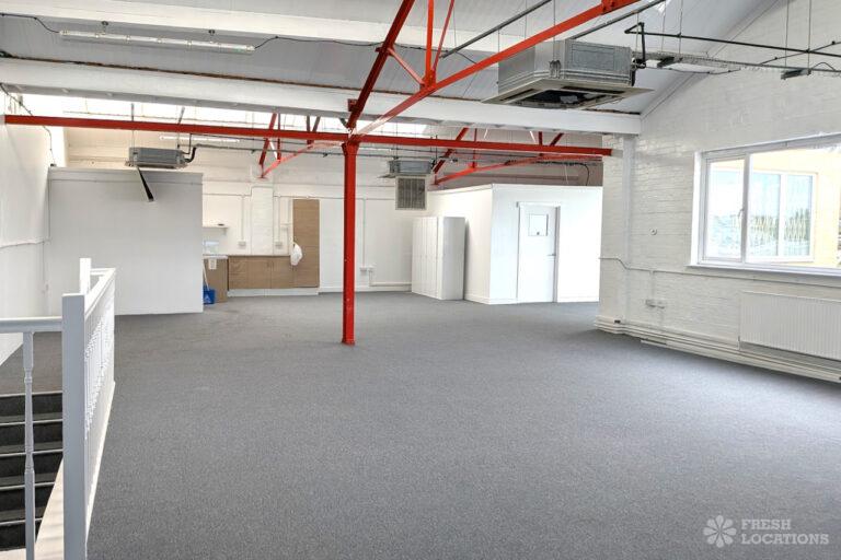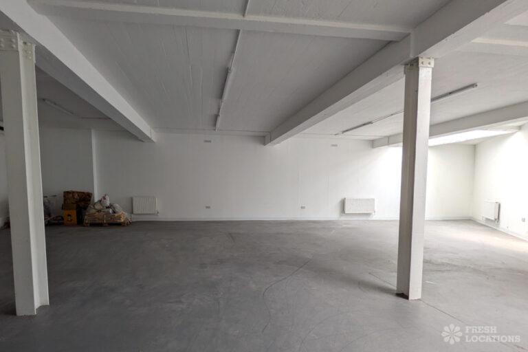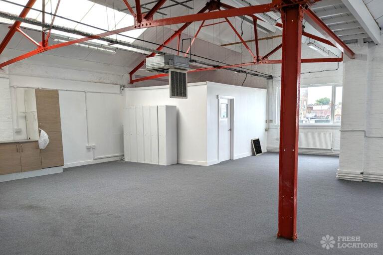 A striking industrial shoot location in south-west London, offering 3,700 sq ft of versatile space across two floors. The upper level features a light-filled open-plan area with skylights and bold red exposed steel trusses, while the ground floor has a darker, atmospheric industrial feel. With high ceilings, ample natural light, and parking on site, this location provides a flexible blank canvas backdrop ideal for shoots. Located in the London Borough of Wandsworth.
