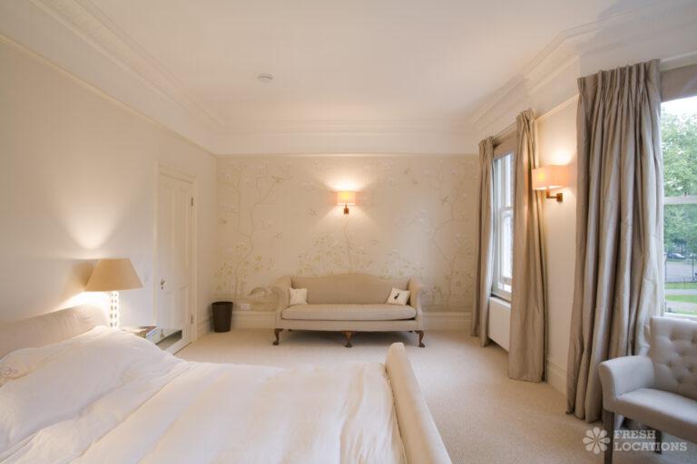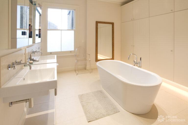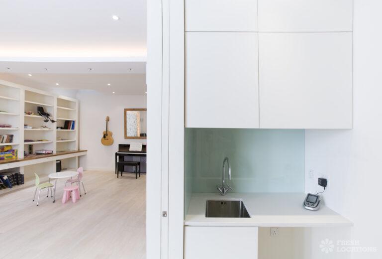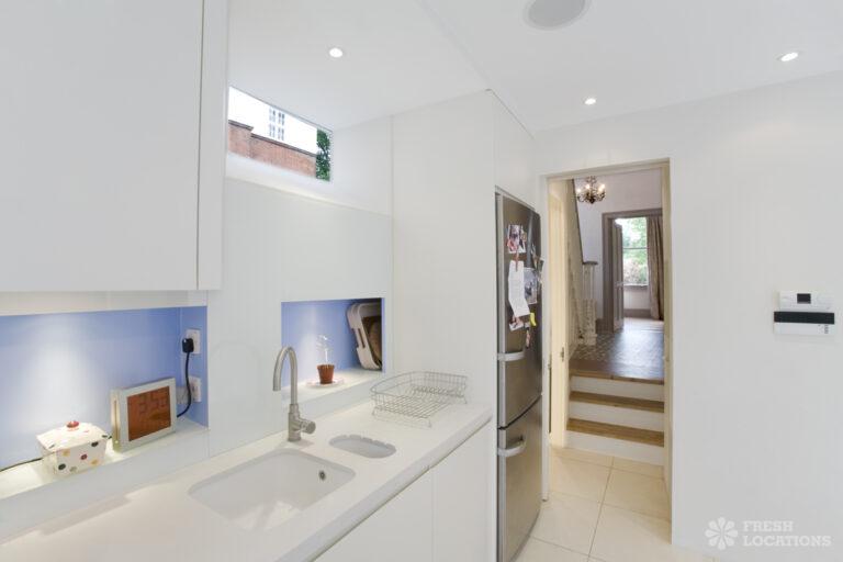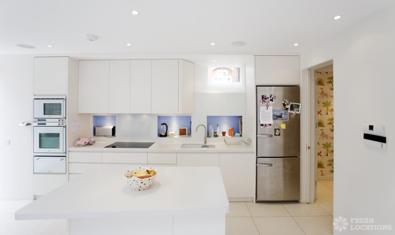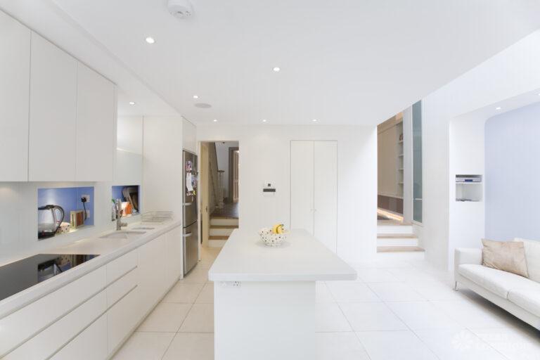 Ensuite, Fireplace, Garden, Island Kitchen, Large Bathroom, Large Bedroom, Large Kitchen, Light Wood Floor, Open Plan, Skylights, Staircase, Tiled Floor, White Kitchen, Wood FloorsLight and bright family home in West London. Spacious white kitchen extension with an island and sliding doors leading to a patio garden. London Borough of Hammersmith and Fulham.