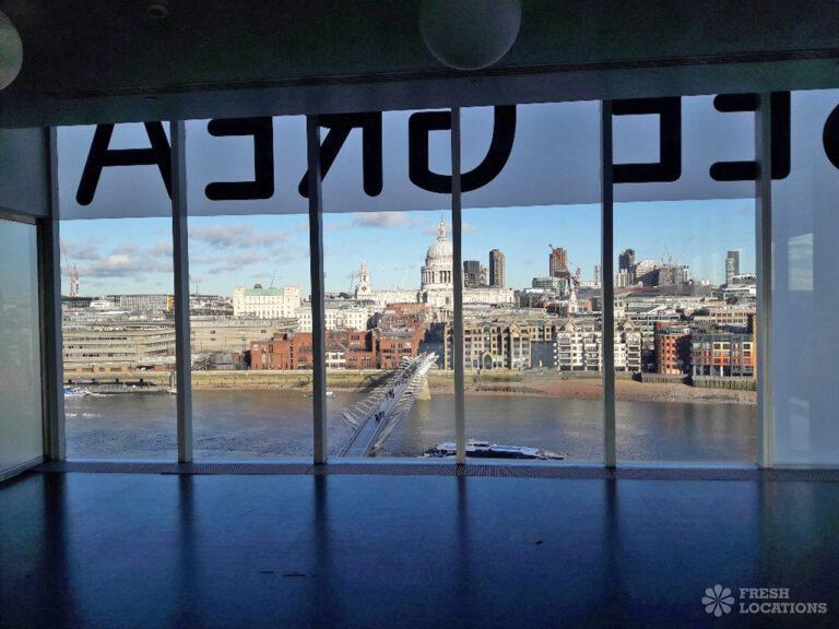 This contemporary gallery space offers views across the city’s skyline. Full height windows and dark floors. London Borough of Southwark.